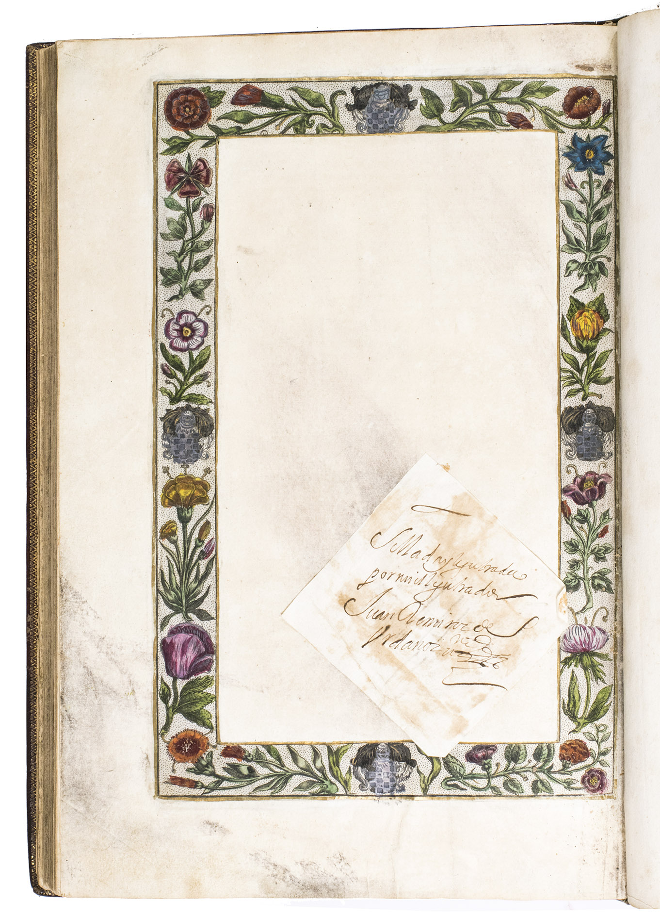 [Spain, 1657-1664?]. Folio. With an elaborately decorated letterpress title page, the letters of the title are highlighted in blue, red, gold, and silver, and are surrounded by a contemporary hand-drawn, hand-coloured, and highlighted in gold and silver floral frame (in the same style as the other floral borders in this work) including equally decorated arms of the Echeniques y Aguirres family. All text is set within woodcut borders incorporating the familys coat of arms, the borders show two different floral designs which are repeated throughout the work. All borders are vividly coloured by a contemporary hand and highlighted in gold and silver. Contemporary elaborately gold-tooled red morocco, sewn on six supports with the corresponding raised bands on the spine, the gold-tooling is built up from numerous impressions of small (pointillé) tools creating a large intricate centrepiece within two detailed frames, gold-tooled board edges and turn-ins, marbled pastedowns, and gilt edges. [24 blank], 232, [2], [24 blank] pp.