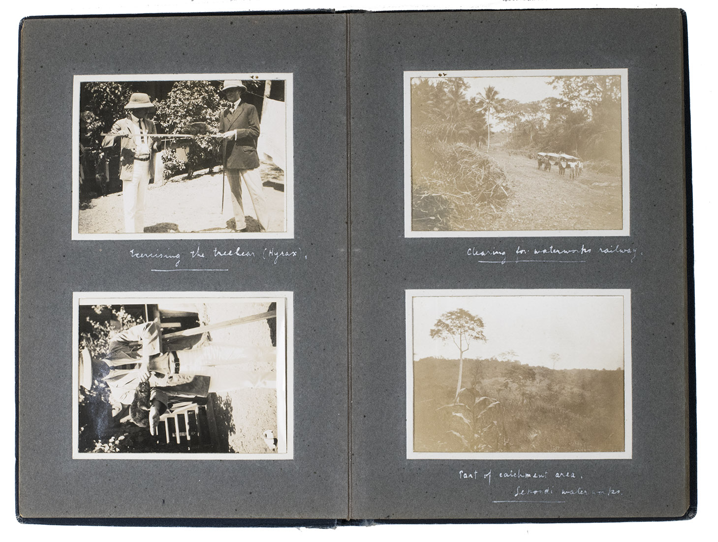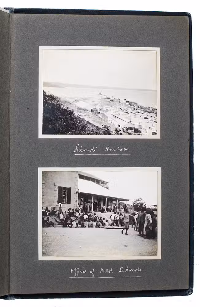 The largest part of the album contains photographs of Sekondi and shows the town's hospital, the medical officer of health's office and bungalow, a medical officer's bungalow and several town and street views. A set of 8 photographs shows preparations for waterworks near Sekondi, including a "site of the proposed dam", which would date the photographs somewhere in the early 1910s, a group portrait of the medical officer, engineers and a foreman and local residents. There are also views of Chama, Axim, Half Assini, the railway station at Tarkwa, Somanya, Kade and Anum and the old Dutch fortresses at Accra, Cape Coast and Sekondi. Daily life is visible in multiple photographs and includes butchers and refuse incinerators in Sekondi, a mail carrier on the road to Chawa, fish ovens and fishermen in Chama, a group of children washing in Sekondi, a market at Dodowa and a funeral procession in Somanya.