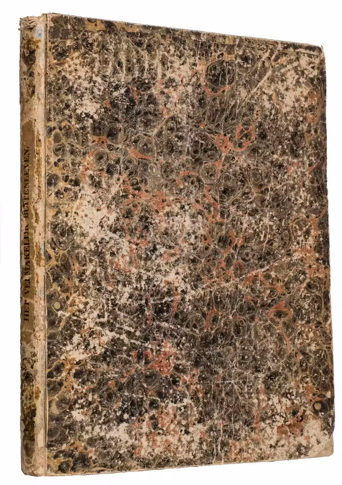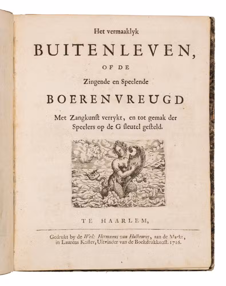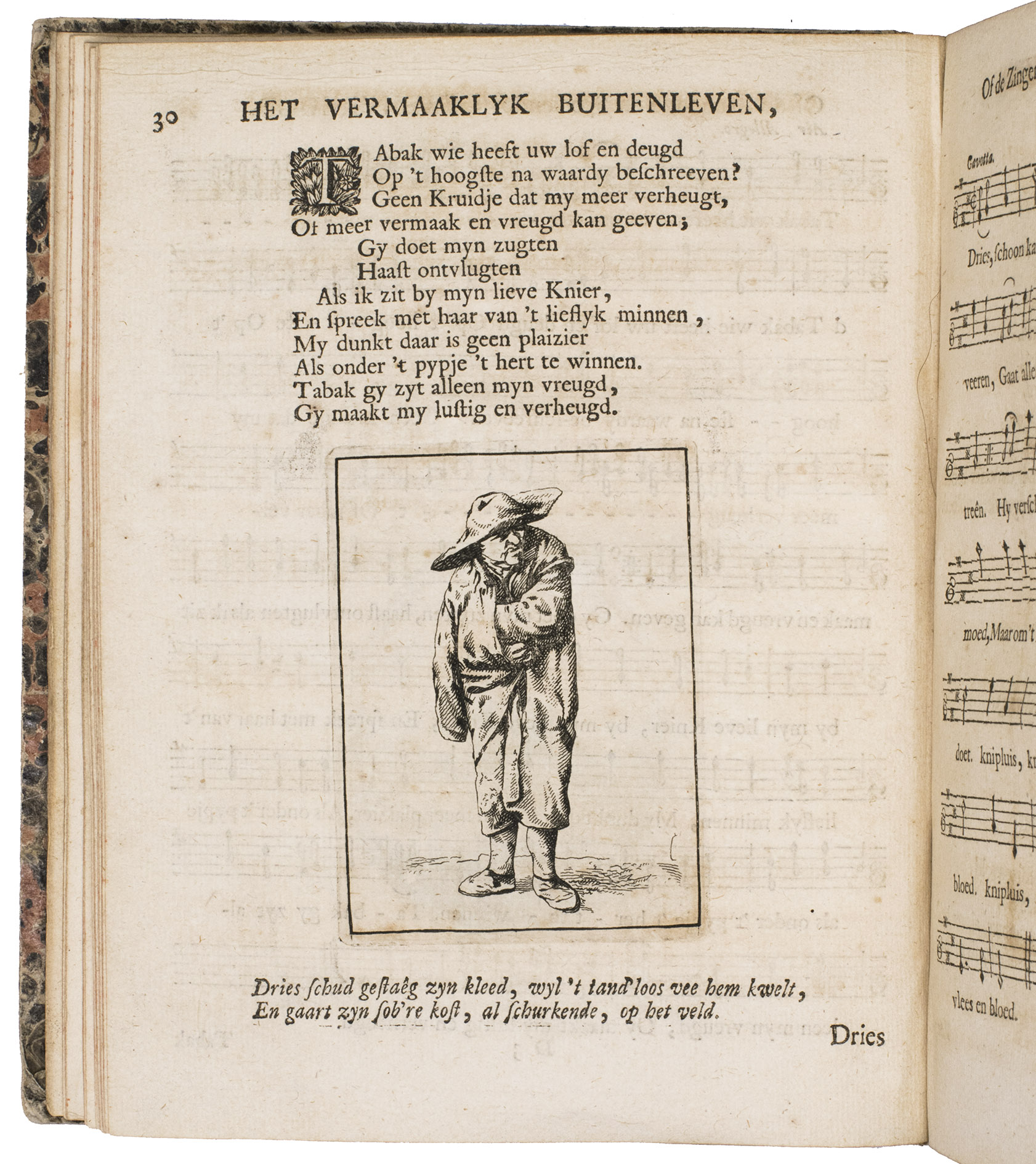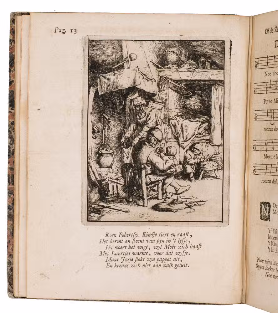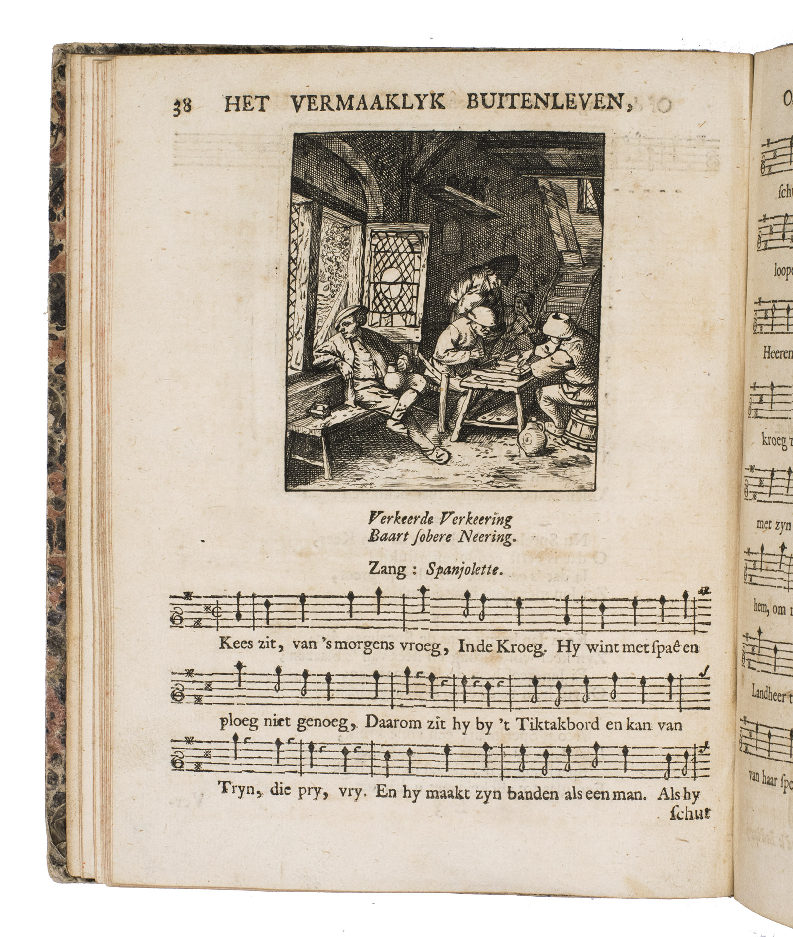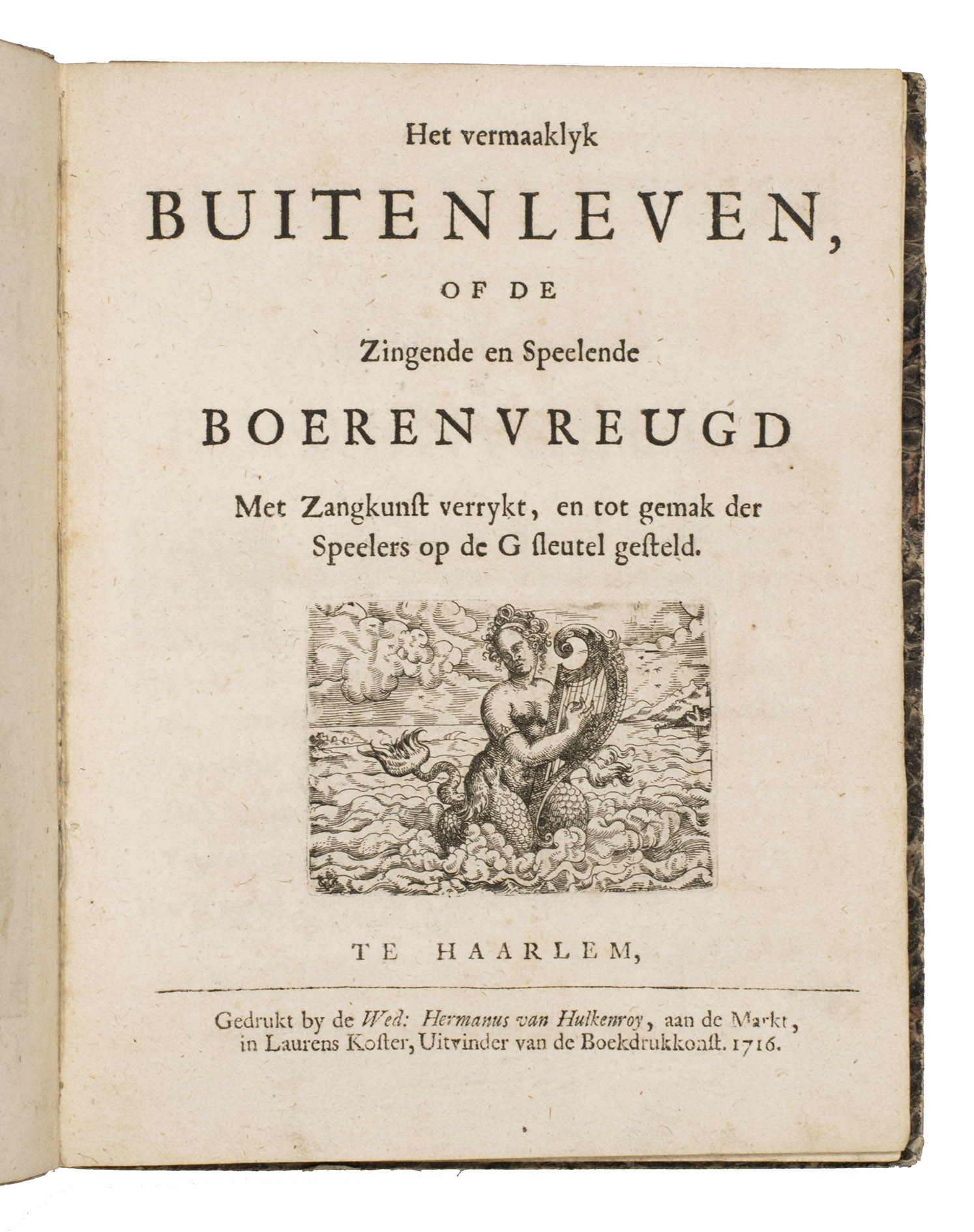Haarlem, Weduwe van Hermanus van Hulkenroy, 1716. 4to. With an etched frontispiece, an etching of a mermaid on the title, 2 folding etchings, 2 full-page etchings, and 21 etchings in the text, all after Adriaen van Ostade. Further with musical annotation to all songs. Early 19th-century marbled boards. [8], 63, [1] pp.