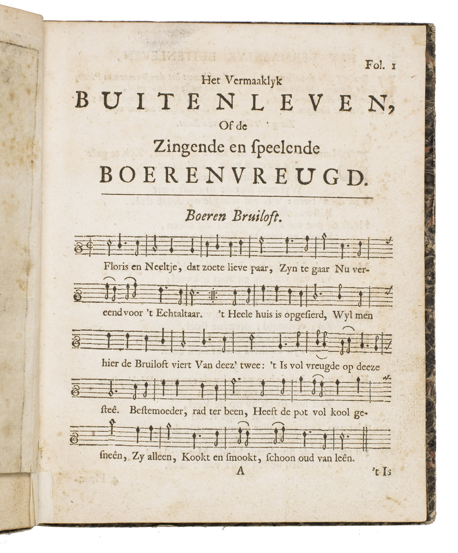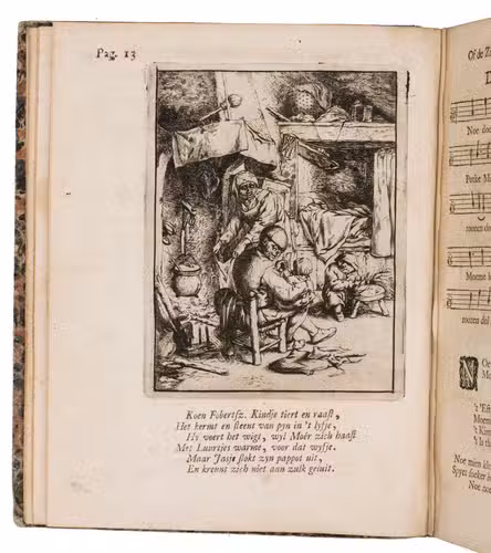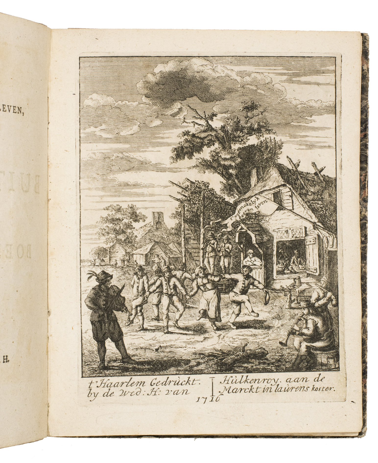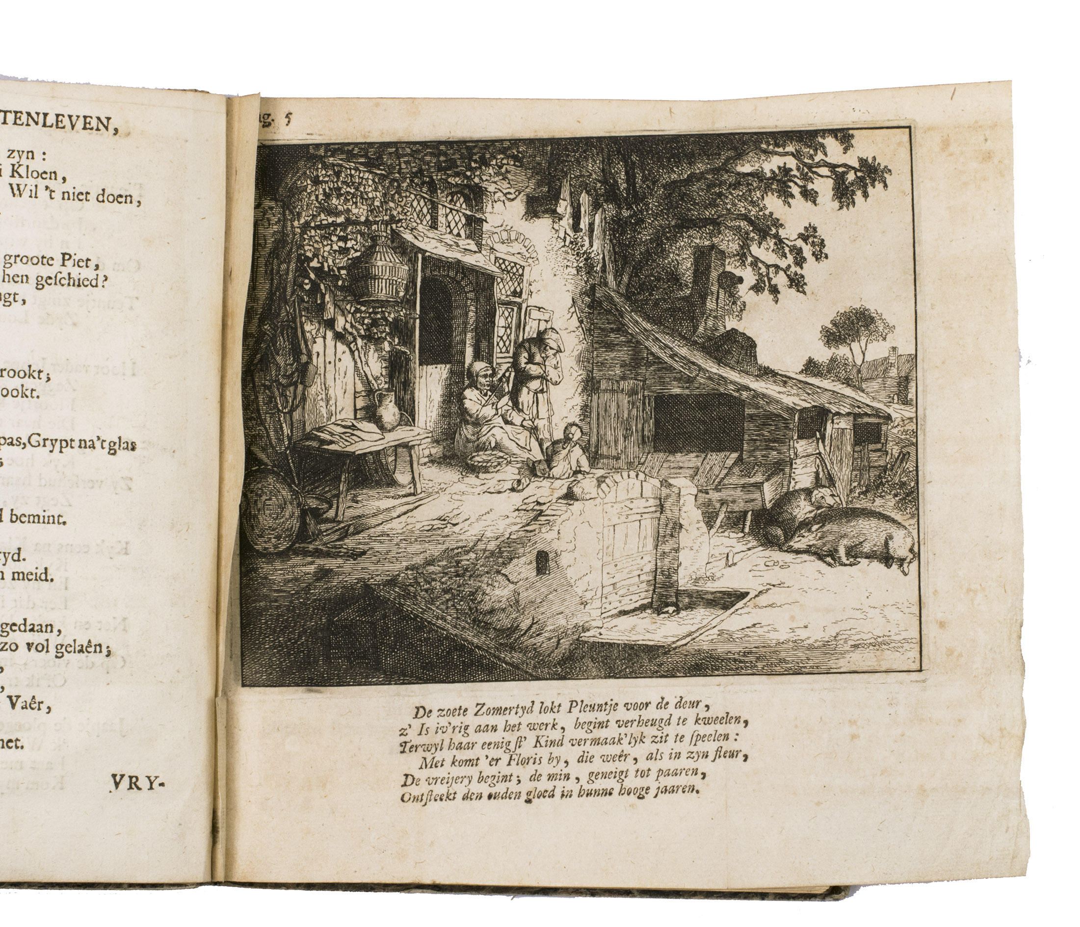 First edition of a rare Dutch songbook with songs for farmer's festivals, all with musical annotation. The work has been beautifully illustrated with etchings after the famous Dutch painter of country life, Adriaen van Ostade (1610-1685). The fine etchings, newly made and in reverse, present an exemplary survey of Van Ostade's work, showing busts of peasants, women on their way to the market carrying baskets, farmers smoking, merry parties dancing in front of the farm, a knife-grinder, a schoolmaster, etc. Together they give a lively impression of country life.