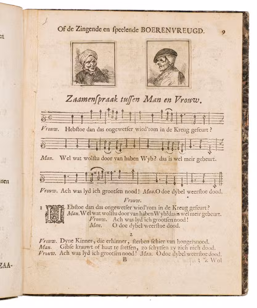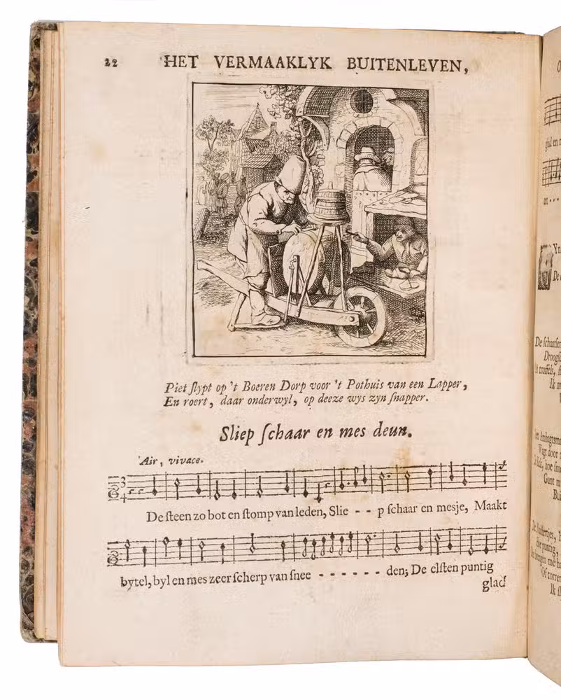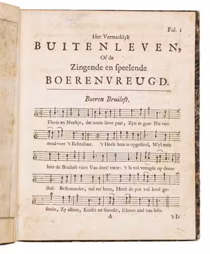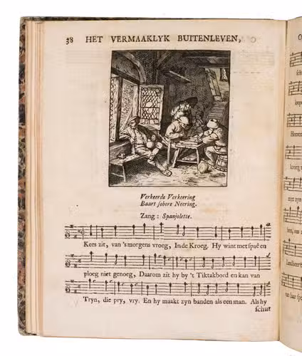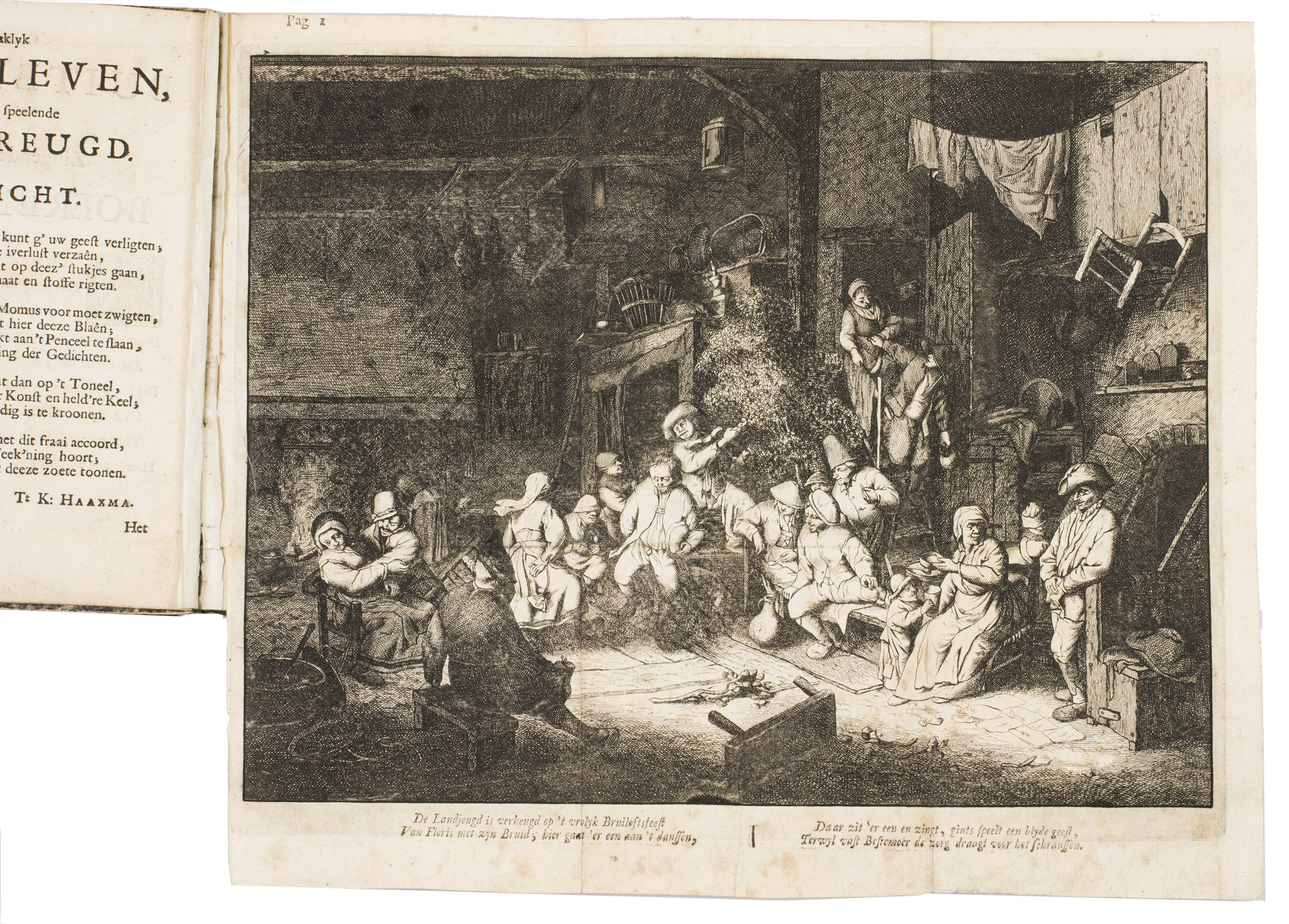 First edition of a rare Dutch songbook with songs for farmer's festivals, all with musical annotation. The work has been beautifully illustrated with etchings after the famous Dutch painter of country life, Adriaen van Ostade (1610-1685). The fine etchings, newly made and in reverse, present an exemplary survey of Van Ostade's work, showing busts of peasants, women on their way to the market carrying baskets, farmers smoking, merry parties dancing in front of the farm, a knife-grinder, a schoolmaster, etc. Together they give a lively impression of country life.