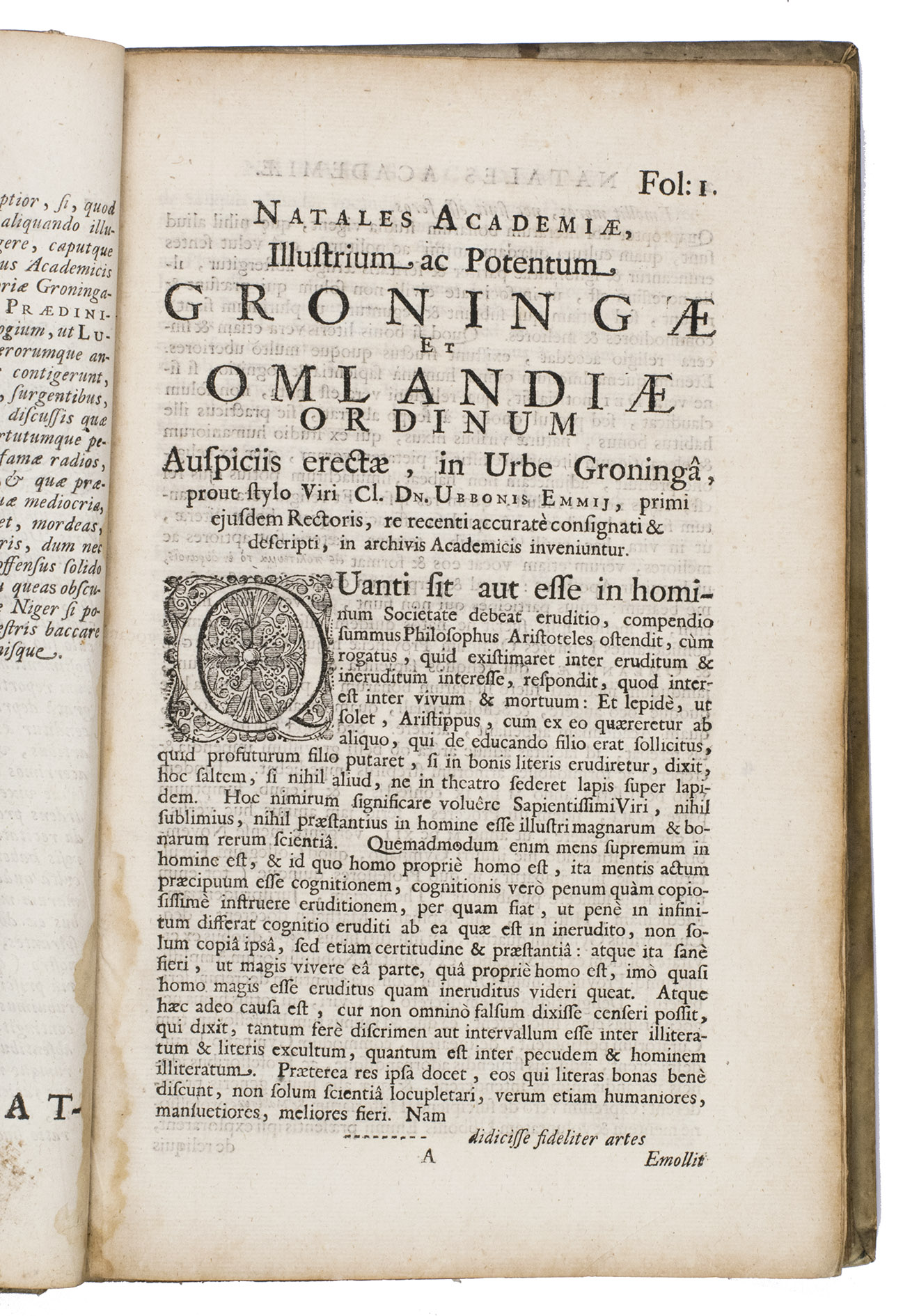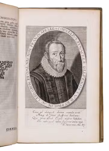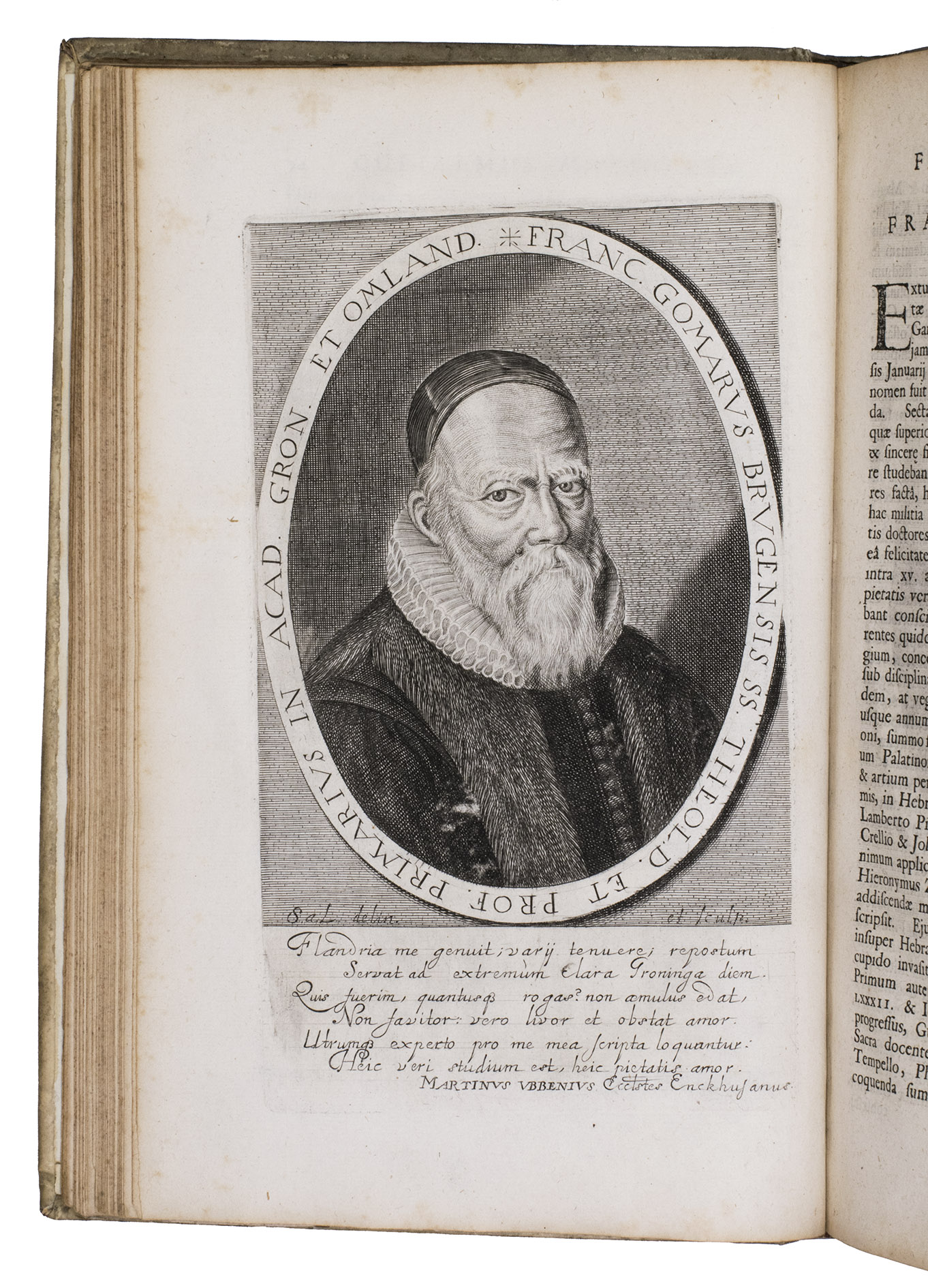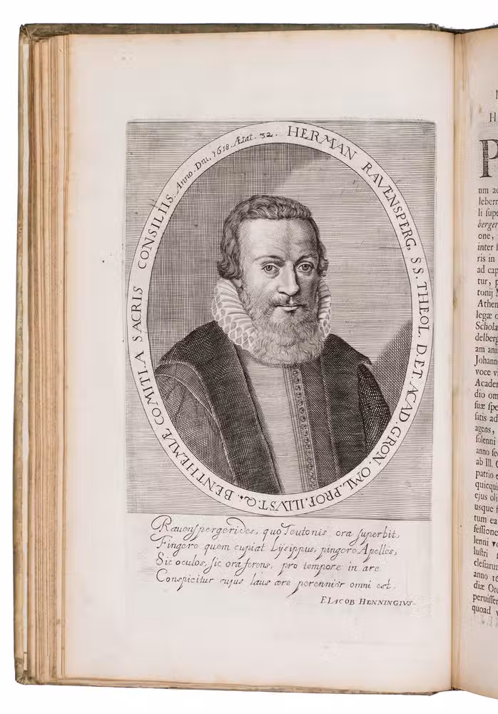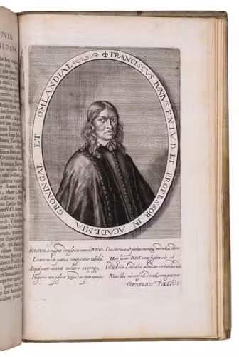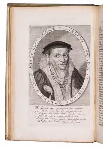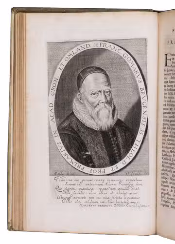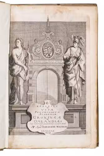 First and only edition of an illustrated history of the University of Groningen, likely printed to celebrate its 40th birthday. The work contains biographies and large portraits of its most famous professors, including Rudolf Agricola (1443-1485), Ubbo Emmius (1547-1625), Wessel Gansfort (1419-1489), Franciscus Gomarus (1563-1641), and Regnerus Praedinius (1510-1559). Twelve of these portraits are engraved by Steven van Lamsweerde (ca. 1620-1686), two by Crispijn van de Passe the Younger (1594-1670), and one by Theodor Matham (born 1589). The others are unsigned.