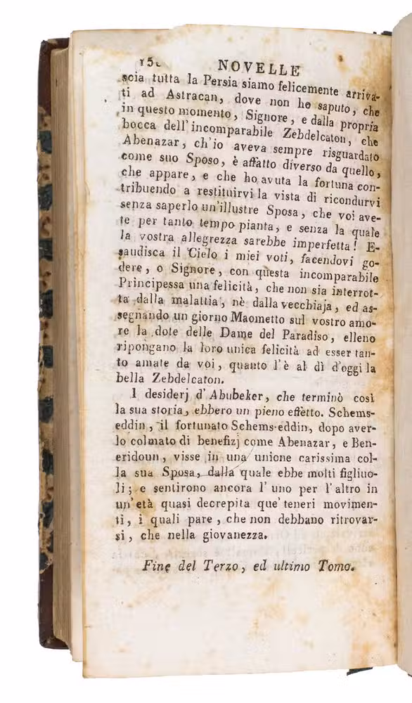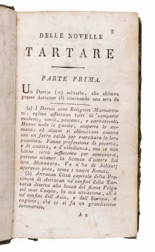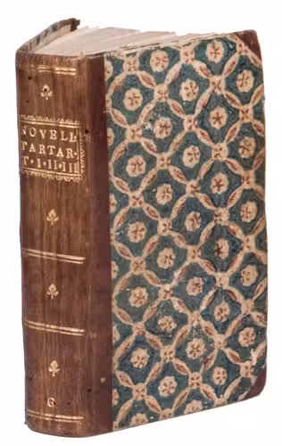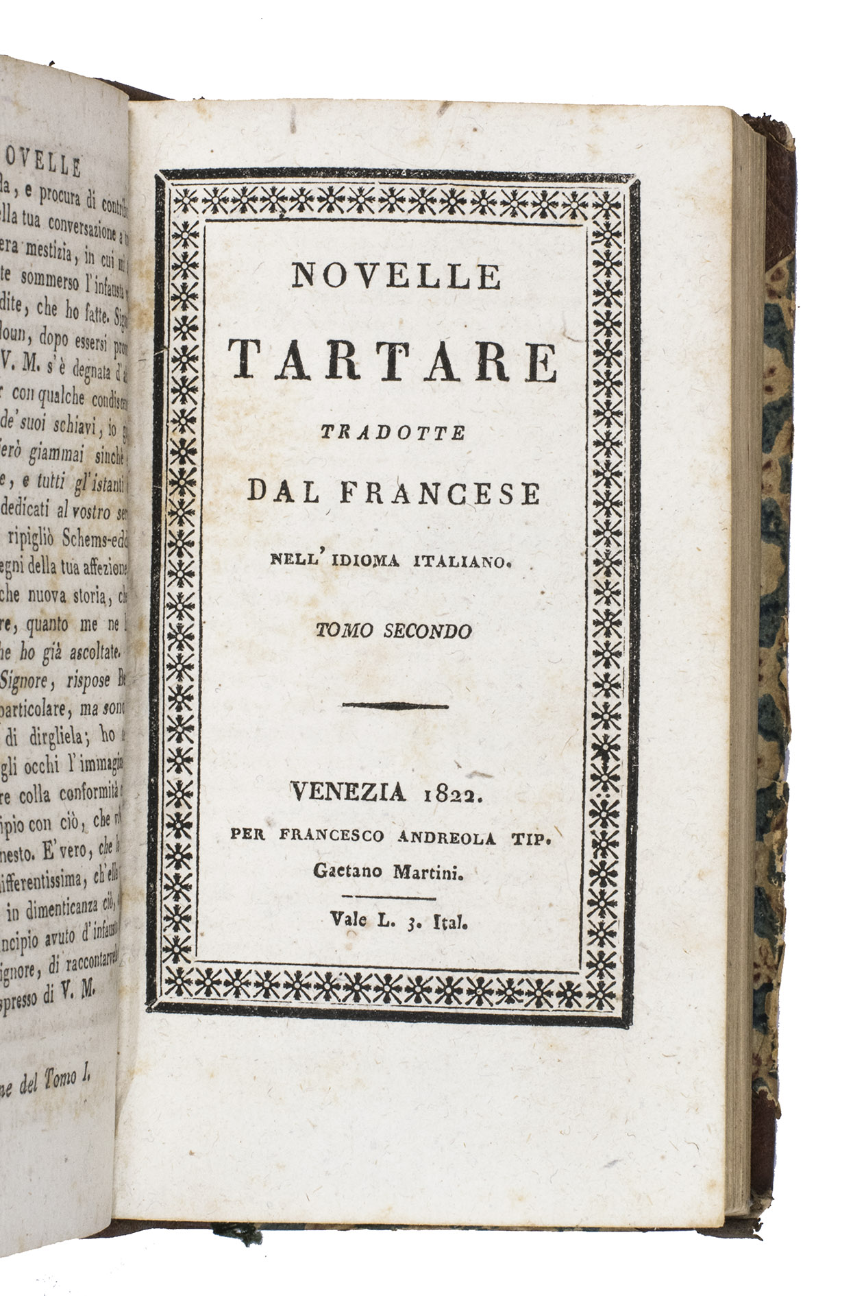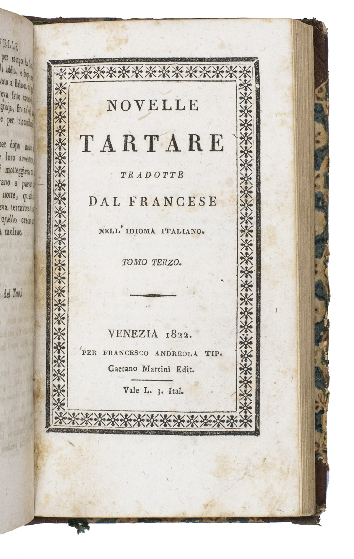 Charming Italian edition of the "Mille et un Quart-d'heure. Contes tartares", originally written in French (in 1715) by Thomas-Simon Gueullette (1683-1766). The collection of orientalist stories was ranked alongside the "Arabian Nights". Although the main purpose of this work, like that of its illustrious model, is entertainment, it also boasts a certain didacticism, particularly about the Tartars and their customs. Tartary was Central Asia, occupied by Turko-Mongol peoples, divided into Chinese Tartary, Russian Tartary, and independent Tartary. In the "Contes tartares" Doctor Abukeler must find a cure for the king's blindness, and until he returns the doctor's son must tell the king a story every day for a quarter of an hour or suffer death.