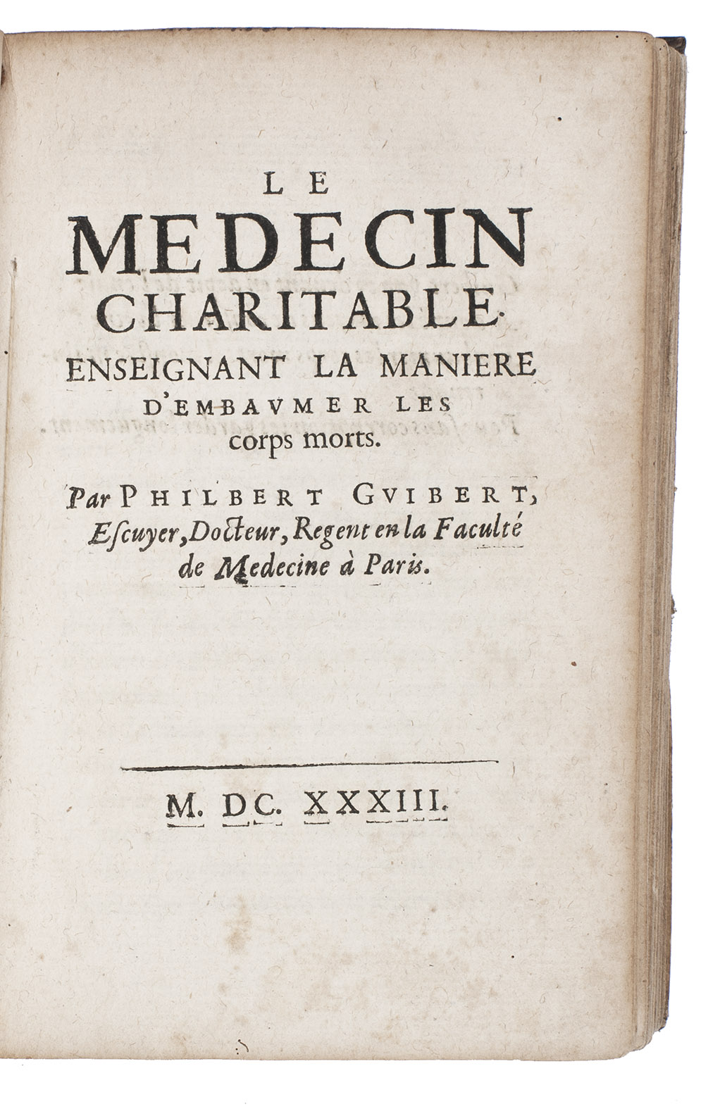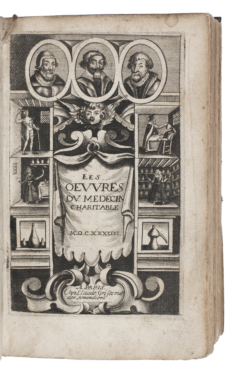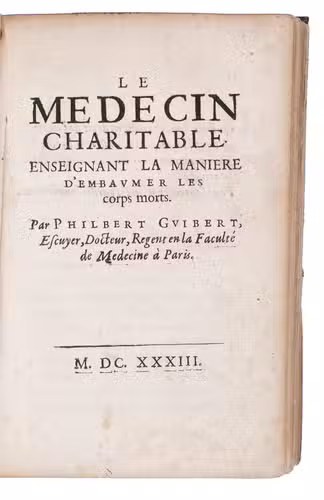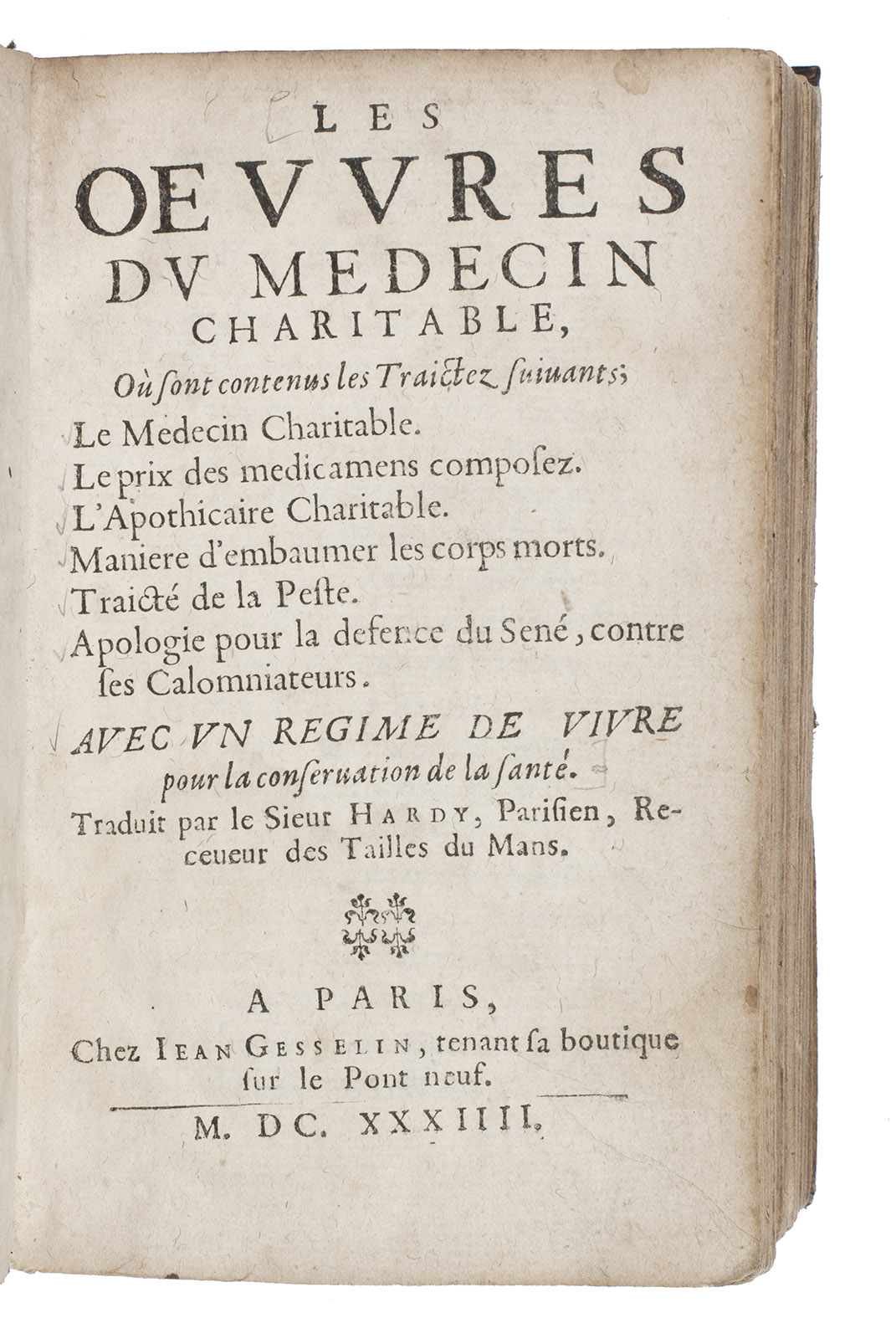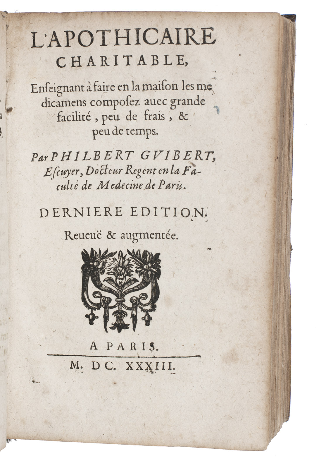 Only copy located of the Gesselin issue of the 1634 edition of a remarkably popular collection of medical texts by the French physician Philibert Guibert (1579?-1633) (and others). As indicated by the title, Guibert wrote these "charitable" texts to make academic medicinal recipes available to the general public for an affordable price. At the same time it was an attack on the practices and utility of apothecaries as he provided details on how to compose common pharmaceutical compounds and advised the public to buy the ingredients directly. Of course, the recipes were to be executed under the direction of a physician.