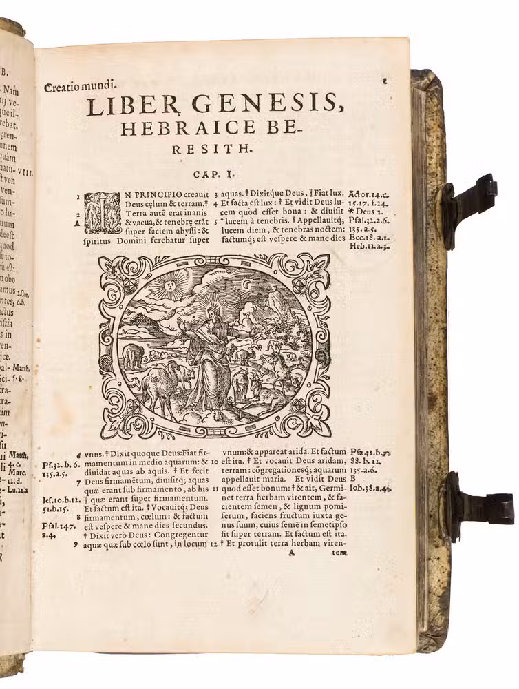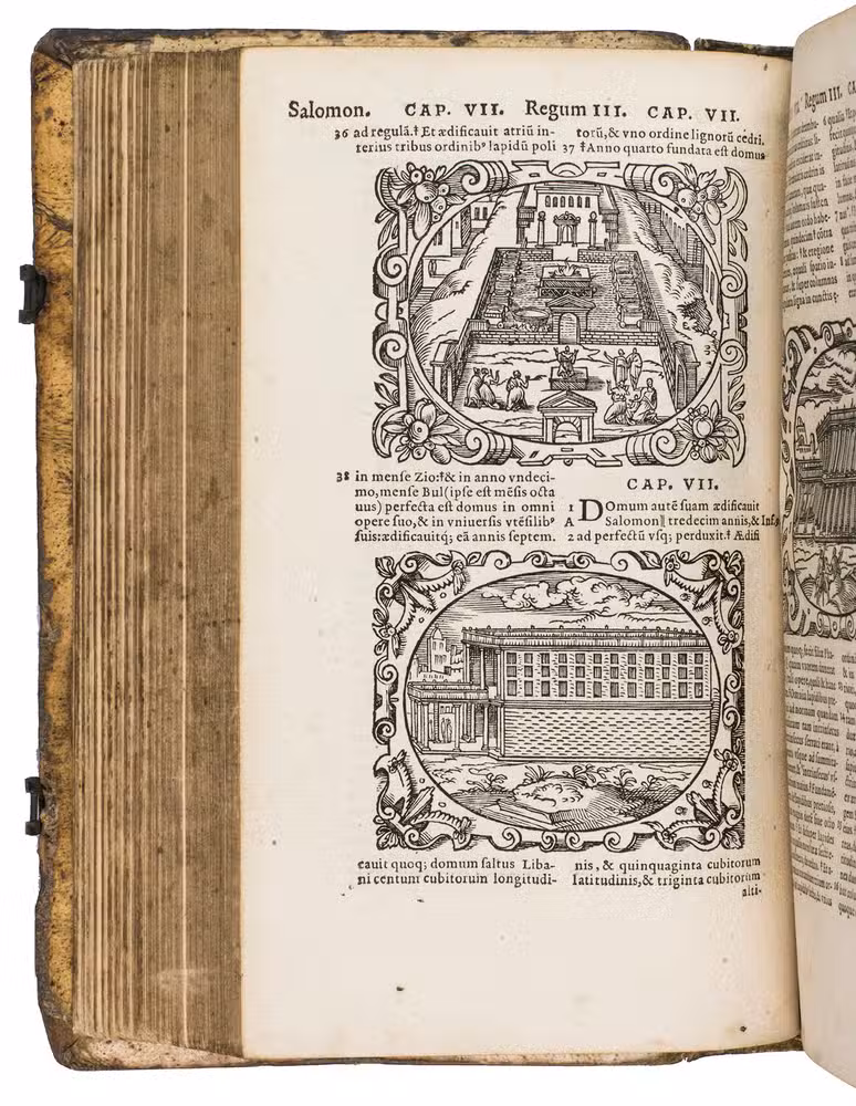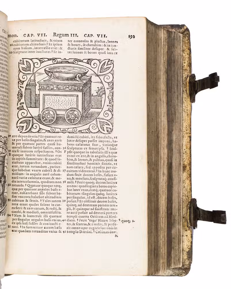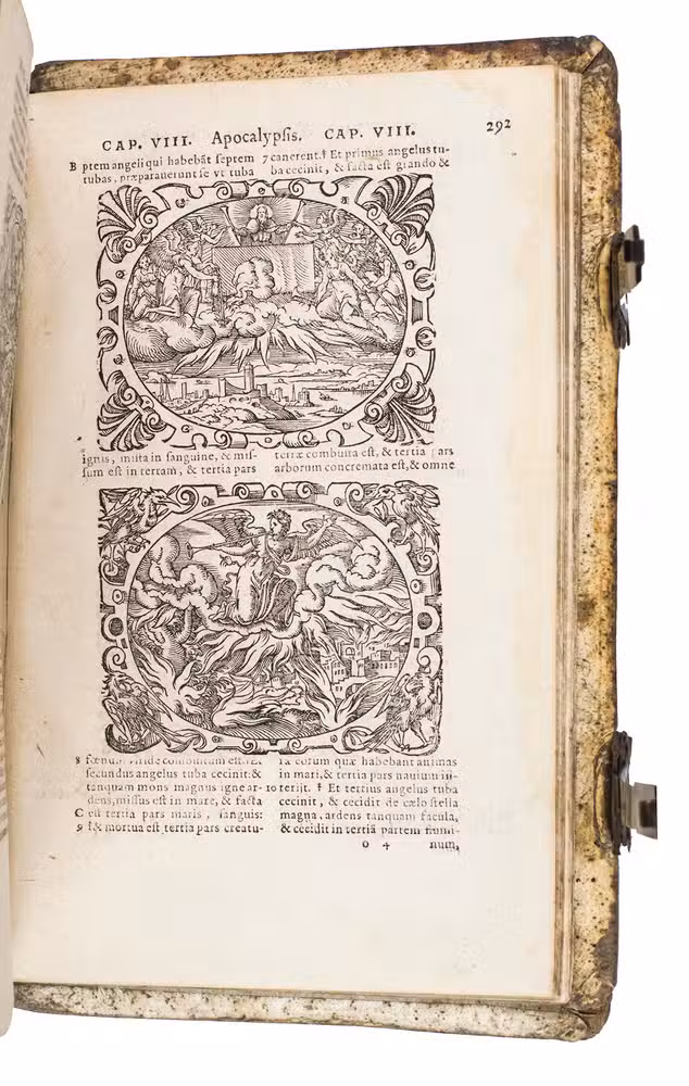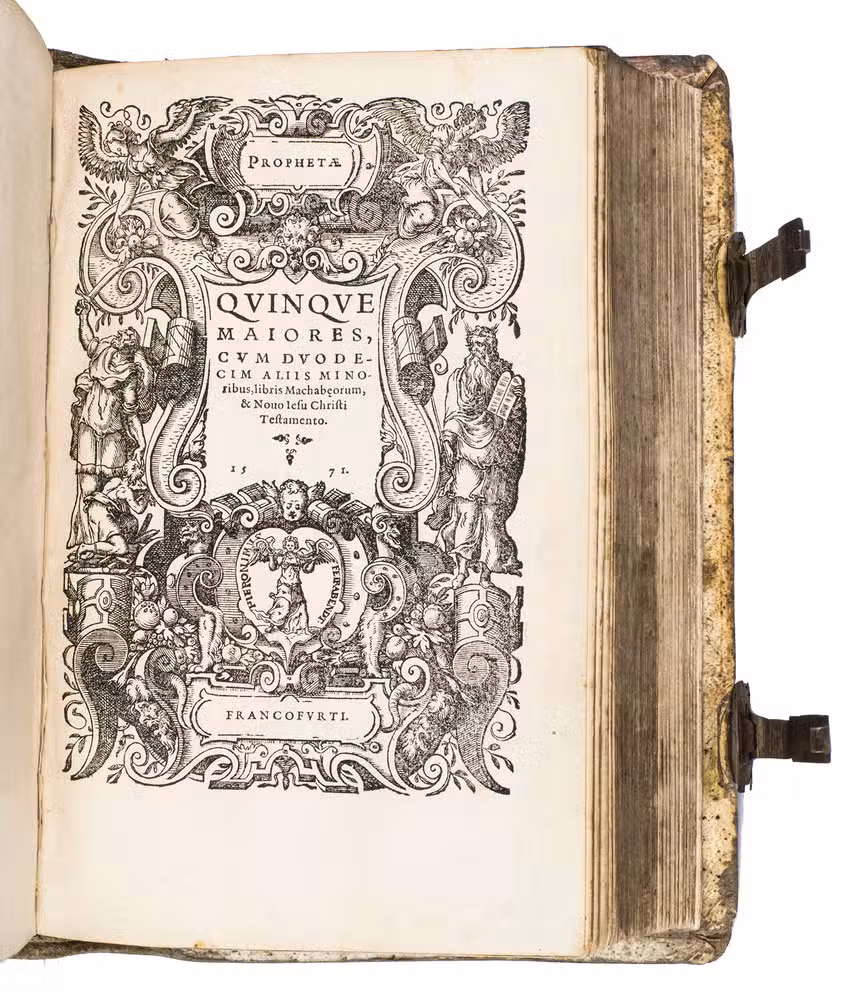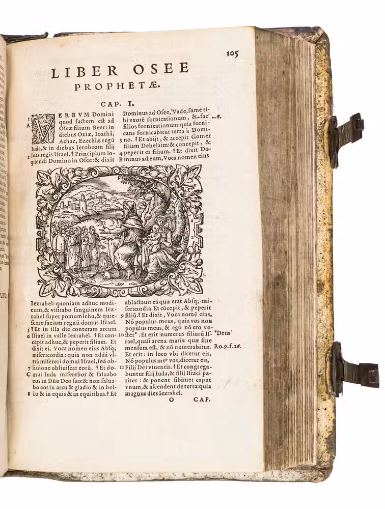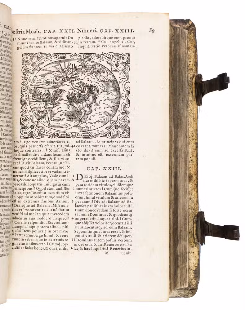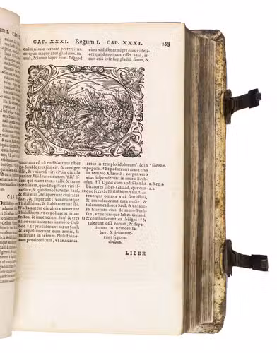 One of only two editions of Feyerabend's renowned version of the Leuven Vulgate, with splendid woodcut illustrations by Swiss-German artist Jost Amman (1539-1591), one of the leading book illustrators of his time. Although both editions are considered to be among the most beautifully illustrated bibles of the 16th century, the present edition is the most copiously illustrated of the two, as it contains seventy more woodcuts. It is also quite rare on the market, as we have only been able to trace two other copies in sales records of the 21st century.