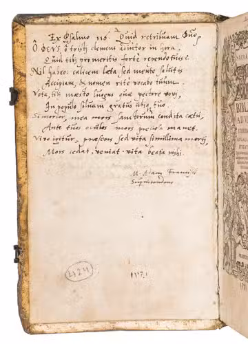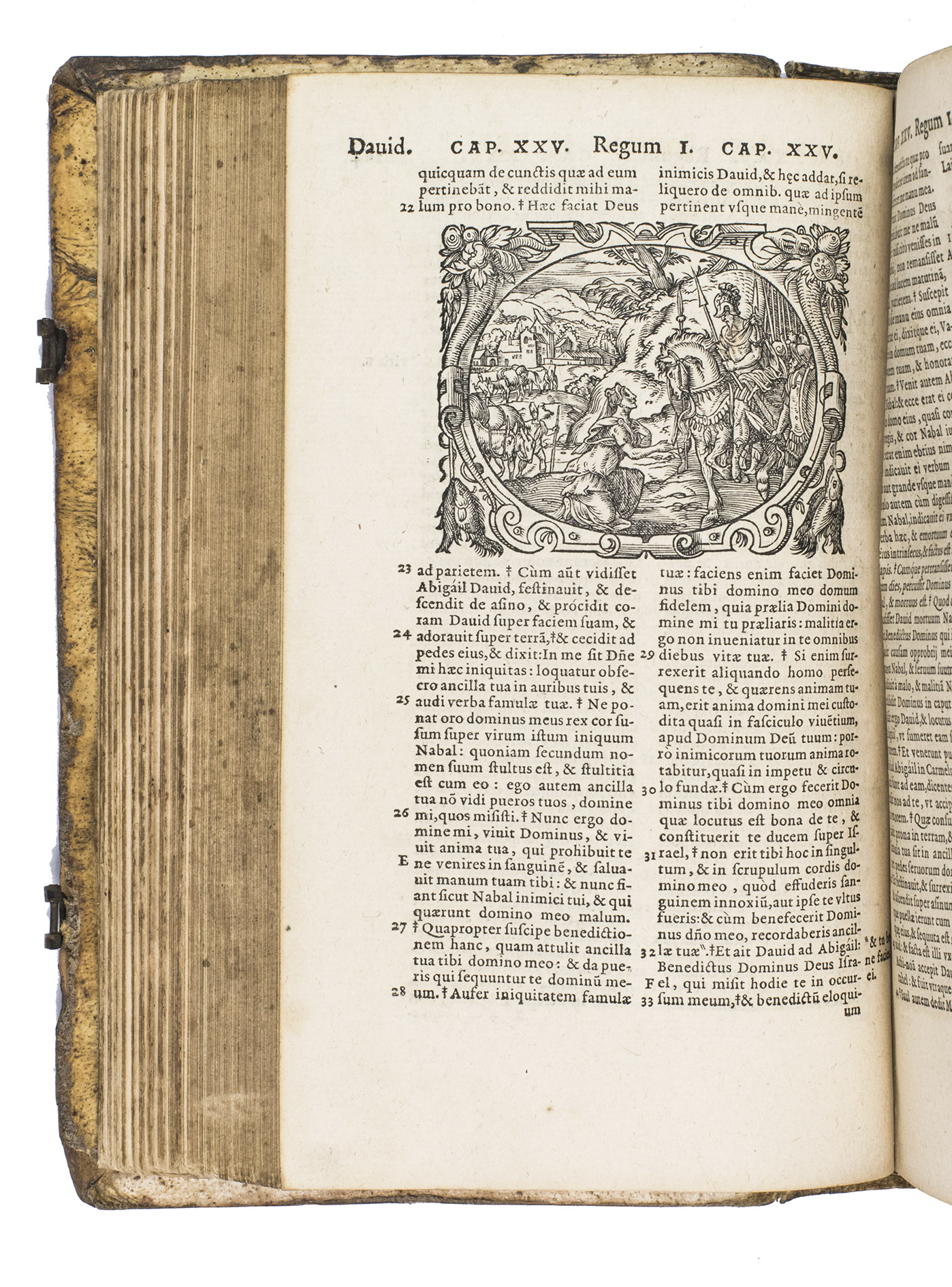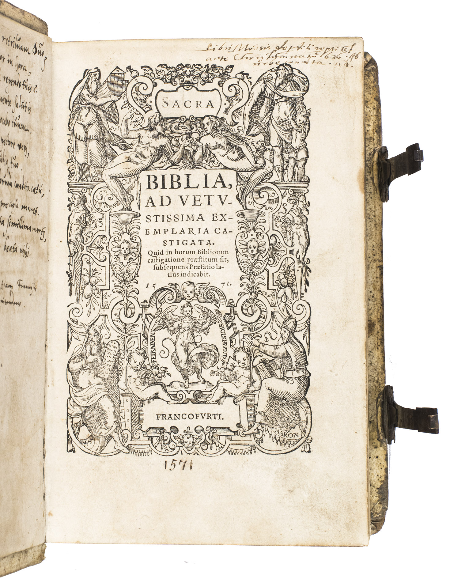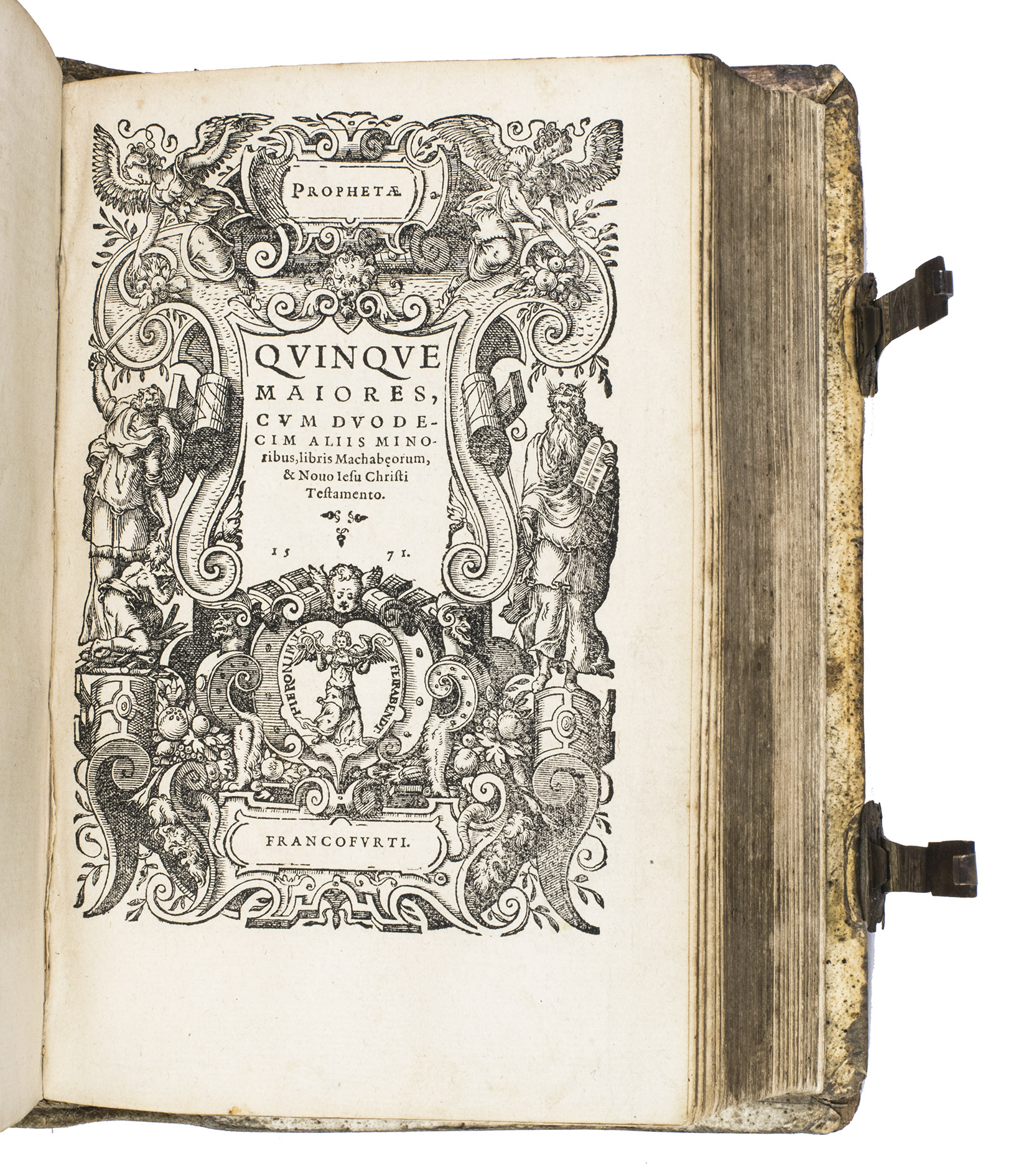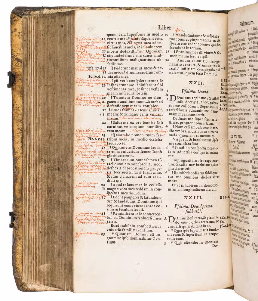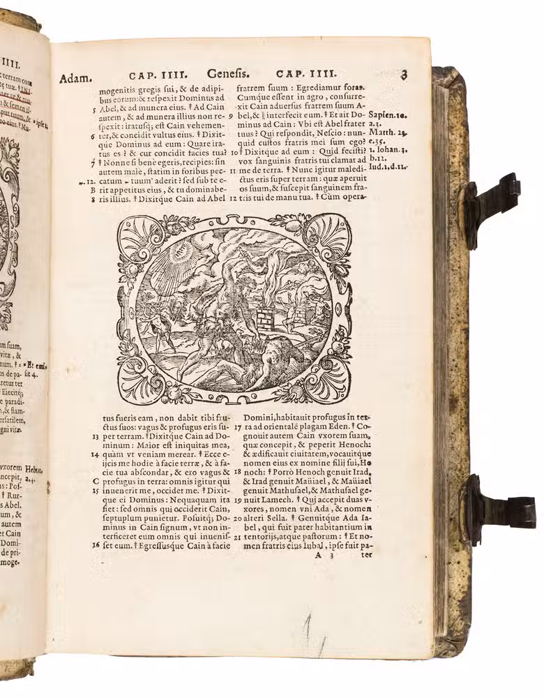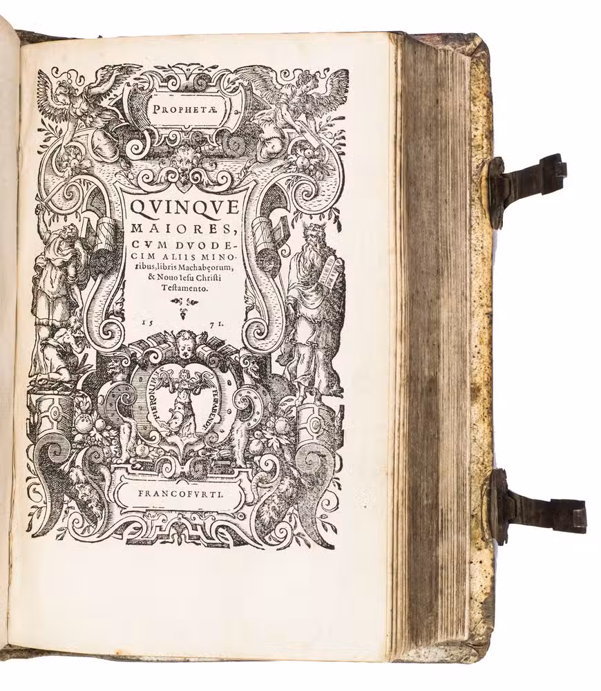 One of only two editions of Feyerabend's renowned version of the Leuven Vulgate, with splendid woodcut illustrations by Swiss-German artist Jost Amman (1539-1591), one of the leading book illustrators of his time. Although both editions are considered to be among the most beautifully illustrated bibles of the 16th century, the present edition is the most copiously illustrated of the two, as it contains seventy more woodcuts. It is also quite rare on the market, as we have only been able to trace two other copies in sales records of the 21st century.
