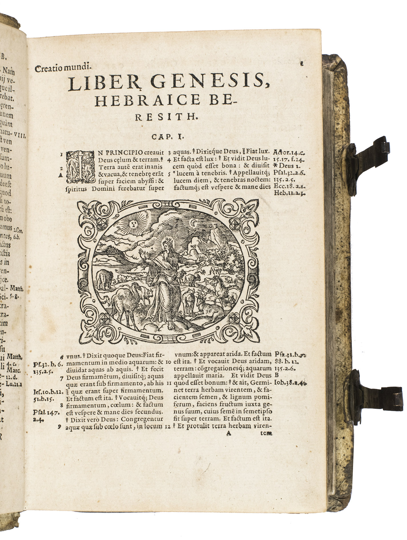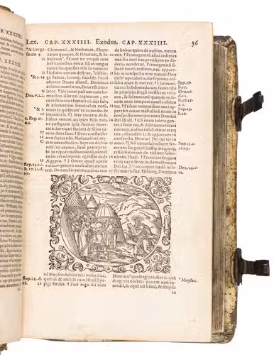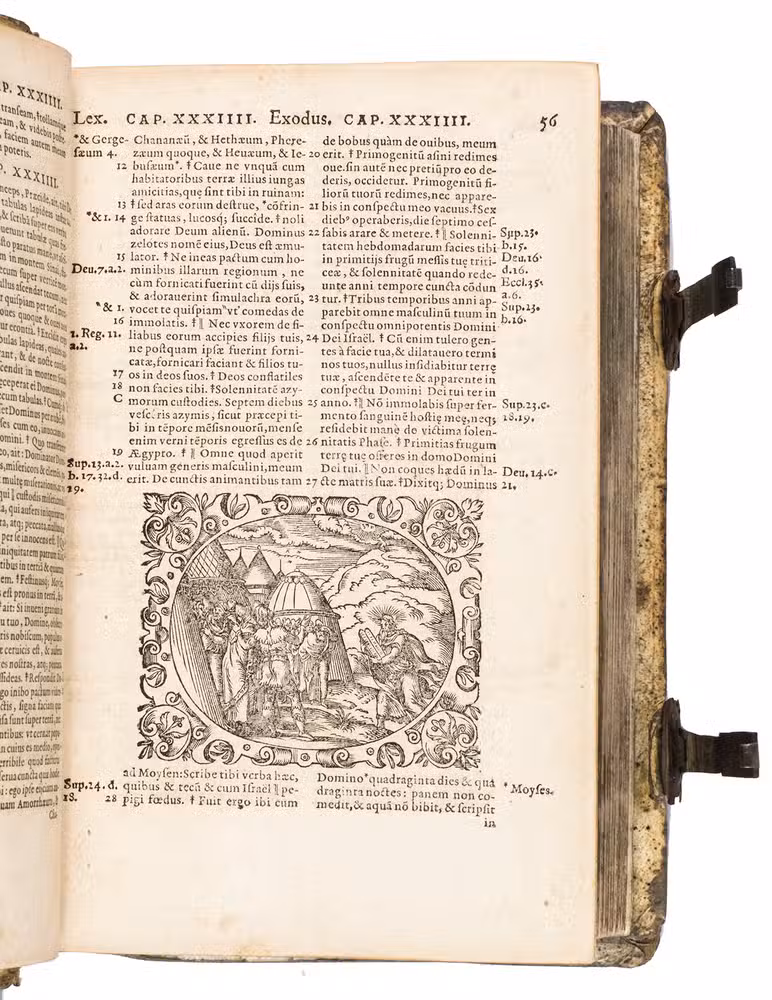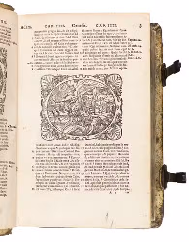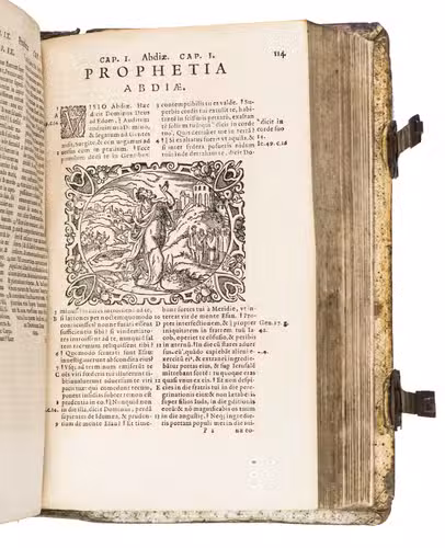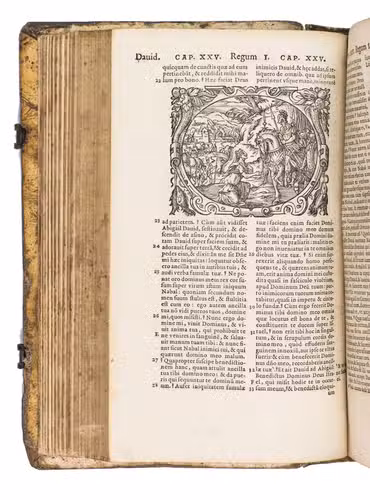 Sigmund Feyerabend (1528-1590), the publisher of the present work, is known for working closely with book illustrators. He was the first publisher to commission a Bible edition that was uniformly illustrated by one artist. His first such publication was a Luther Bible from 1560, which contained circa 150 woodcuts by Virgil Solis (1514-1562), an important and highly prolific book illustrator from Nuremberg. After his death, Feyerabend continued to work with Solis' student, woodcut artist Jost Amman. Although publishers increasingly turned towards the new technique of copper engraving, Amman's work was still sought after for its high quality and minute details. In 1566, he produced 128 beautiful woodcut illustrations for Feyerabend's first edition of the Leuven Vulgate, which was a folio. It became so successful, that it led to a lifelong business partnership between the two men. When Amman was asked for the second edition, which is the present work, he made a completely new set of illustrations, as this second edition was a smaller size. Whereas the illustrations for the first edition were rectangular, the new ones are all set within an elaborate oval frame. They are also more numerous, as Amman created seventy more. These illustrations became so popular, that they were re-used by other publishers for their bibles. The present edition, however, is the first in which this second set of woodcuts appeared.