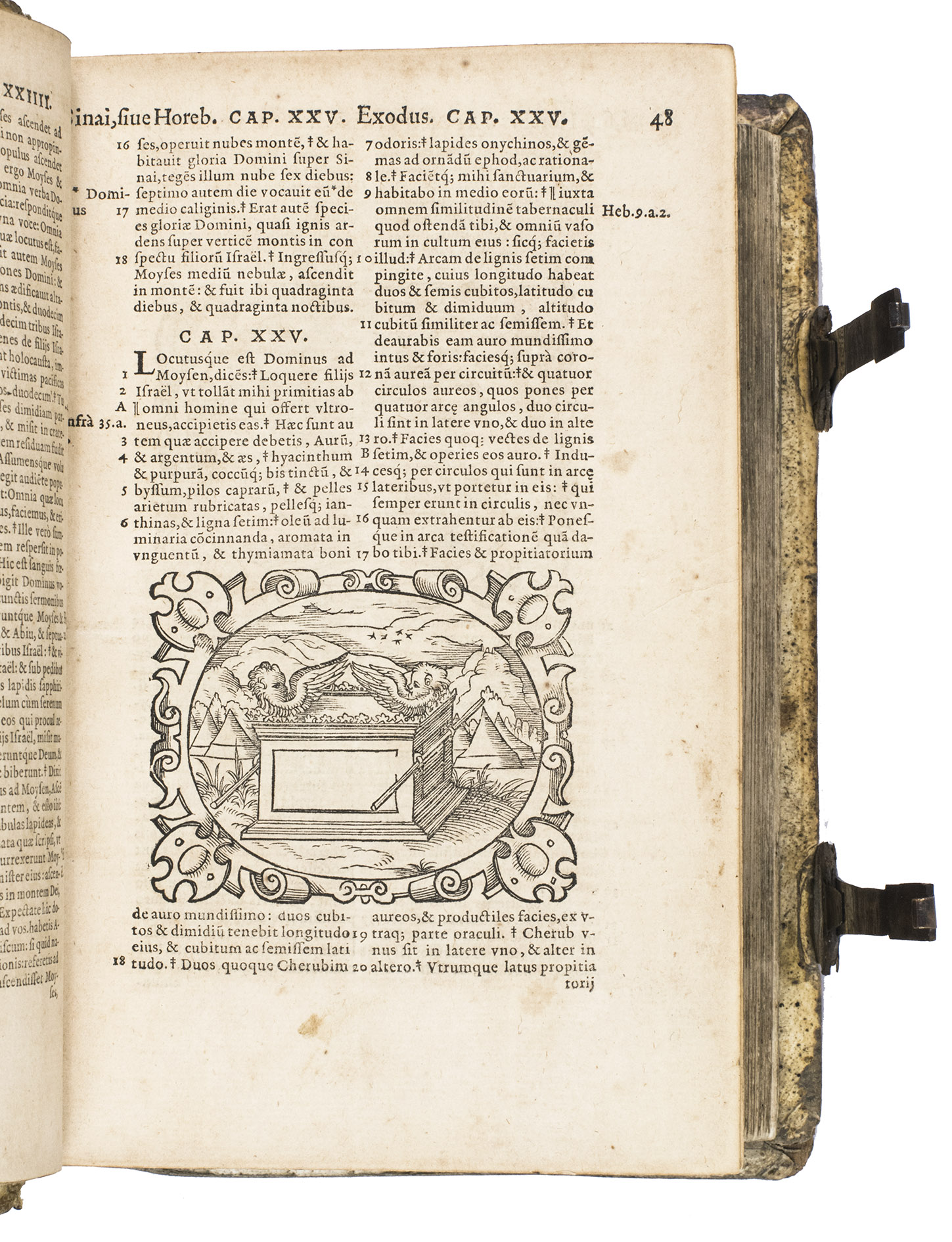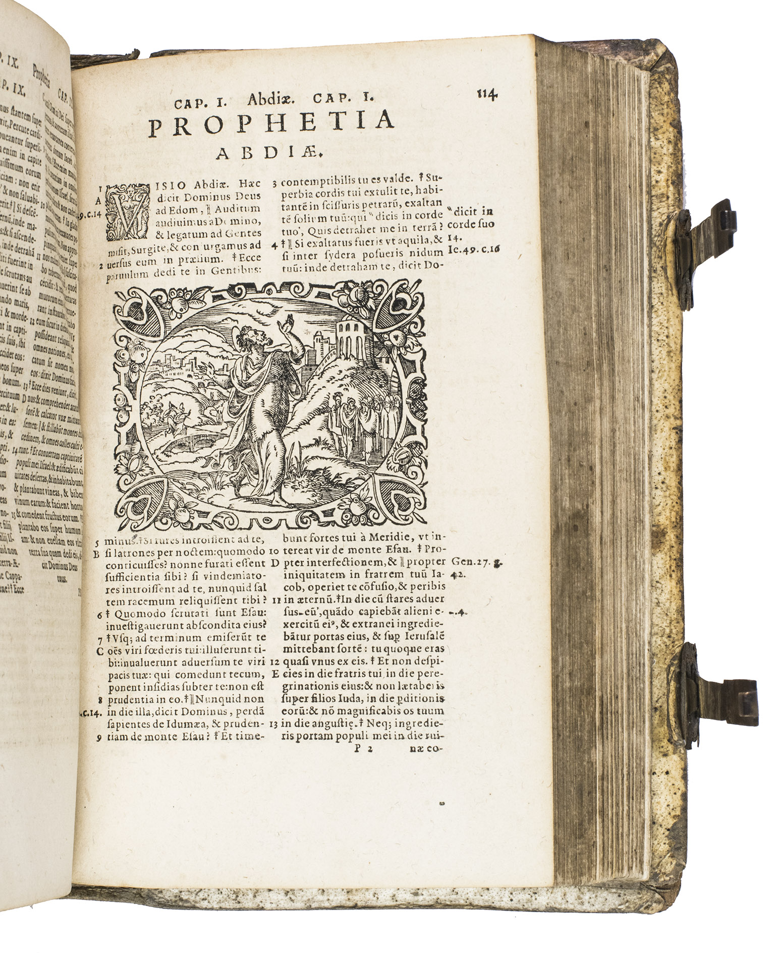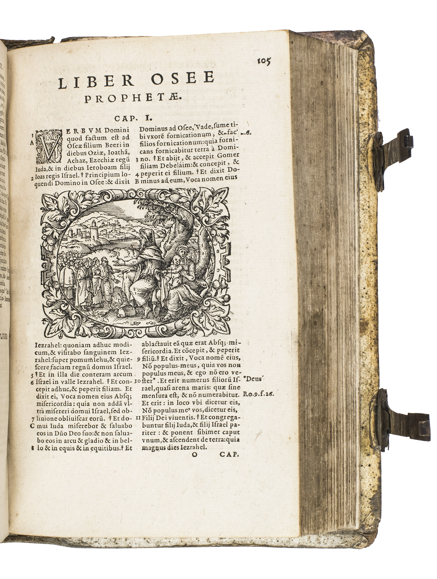 Sigmund Feyerabend (1528-1590), the publisher of the present work, is known for working closely with book illustrators. He was the first publisher to commission a Bible edition that was uniformly illustrated by one artist. His first such publication was a Luther Bible from 1560, which contained circa 150 woodcuts by Virgil Solis (1514-1562), an important and highly prolific book illustrator from Nuremberg. After his death, Feyerabend continued to work with Solis' student, woodcut artist Jost Amman. Although publishers increasingly turned towards the new technique of copper engraving, Amman's work was still sought after for its high quality and minute details. In 1566, he produced 128 beautiful woodcut illustrations for Feyerabend's first edition of the Leuven Vulgate, which was a folio. It became so successful, that it led to a lifelong business partnership between the two men. When Amman was asked for the second edition, which is the present work, he made a completely new set of illustrations, as this second edition was a smaller size. Whereas the illustrations for the first edition were rectangular, the new ones are all set within an elaborate oval frame. They are also more numerous, as Amman created seventy more. These illustrations became so popular, that they were re-used by other publishers for their bibles. The present edition, however, is the first in which this second set of woodcuts appeared.