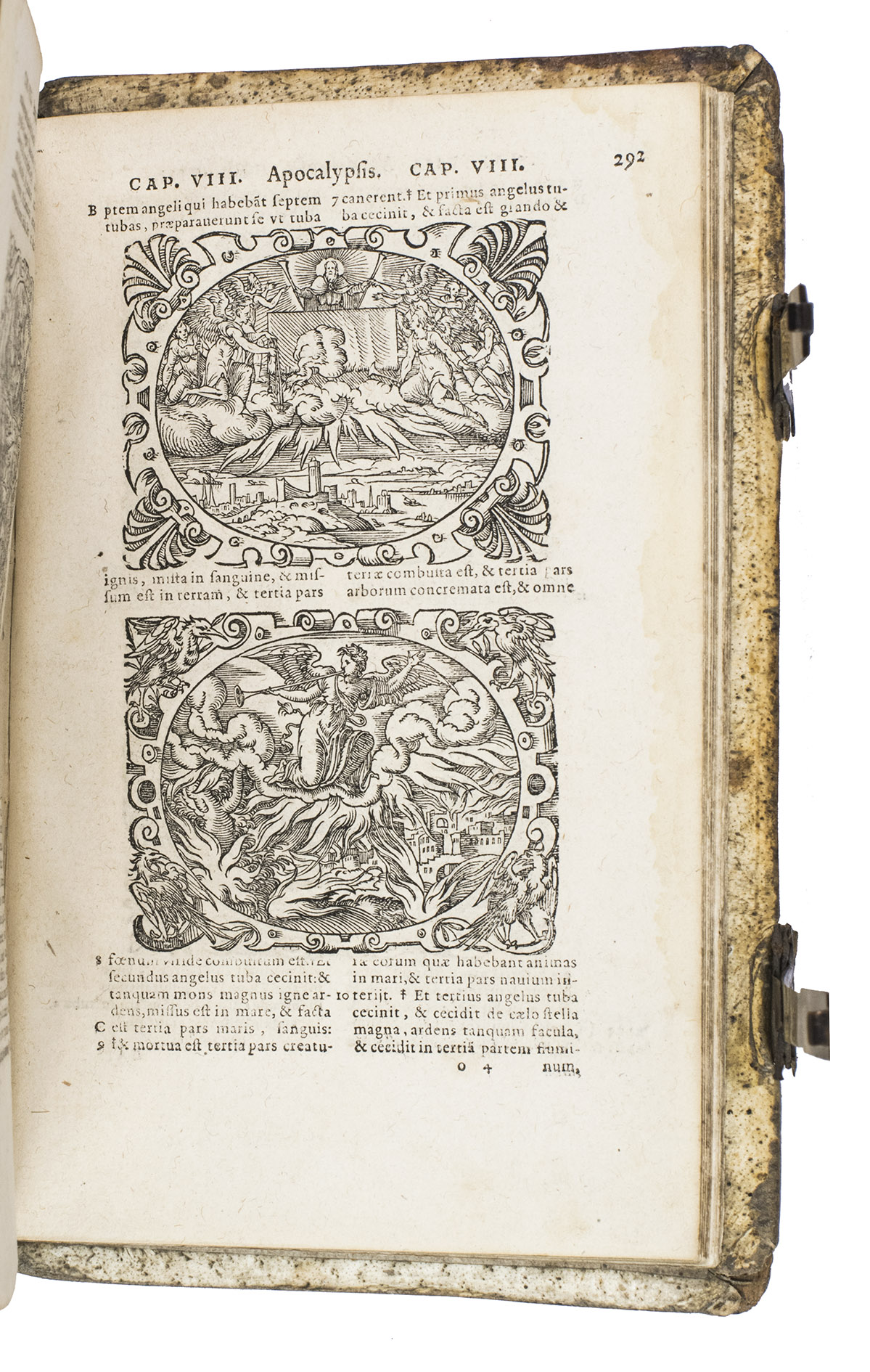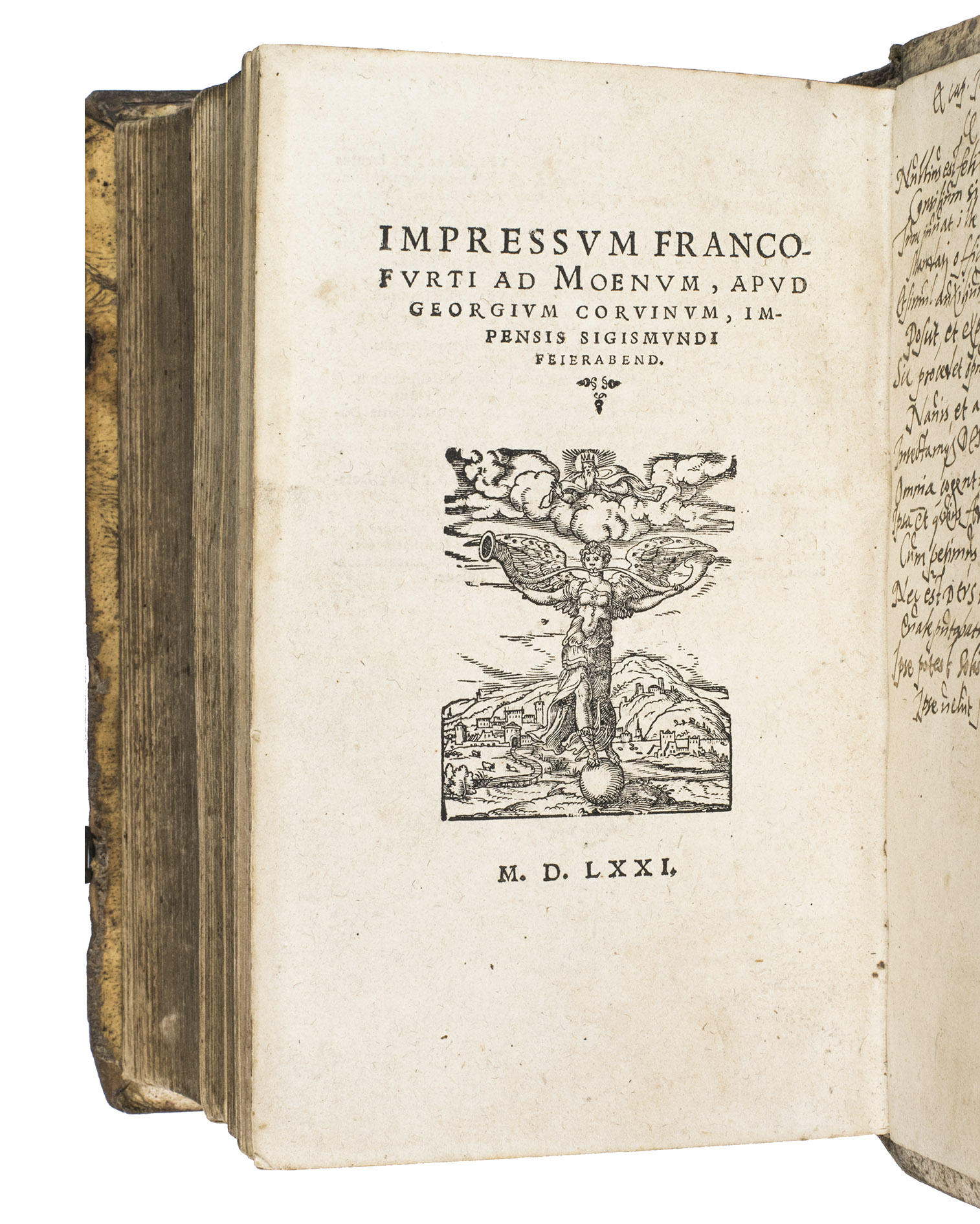 Frankfurt am Main, Georg Rab for Sigmund Feyerabend, 1571. 2 parts in 1 volume. 8vo. With 198 woodcut illustrations in the text, a woodcut printer's device on the final page, the titles of both parts are set within an elaborate woodcut border. Contemporary richly blind-tooled pigskin over wooden boards, with the initials "WFL" and the year "1578" blind-tooled on the front board, and with two engraved metal clasps. [16], 423; 311 ll.