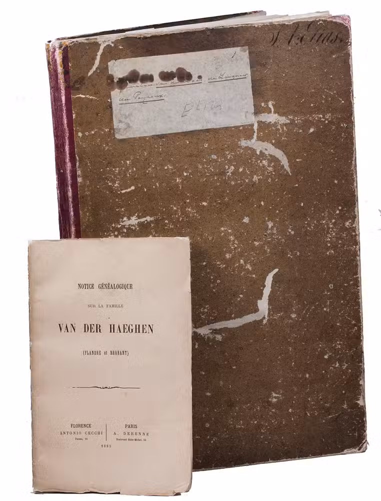 Loosely added to the album and stored in a modern small white portfolio is a little booklet on the Van der Haeghen family, titled Notice généalogique sur la famille Van der Haeghen (Flandre et Brabant) published in Florence (Antonio Cecchi) and Paris (A. Derenne) in 1883.