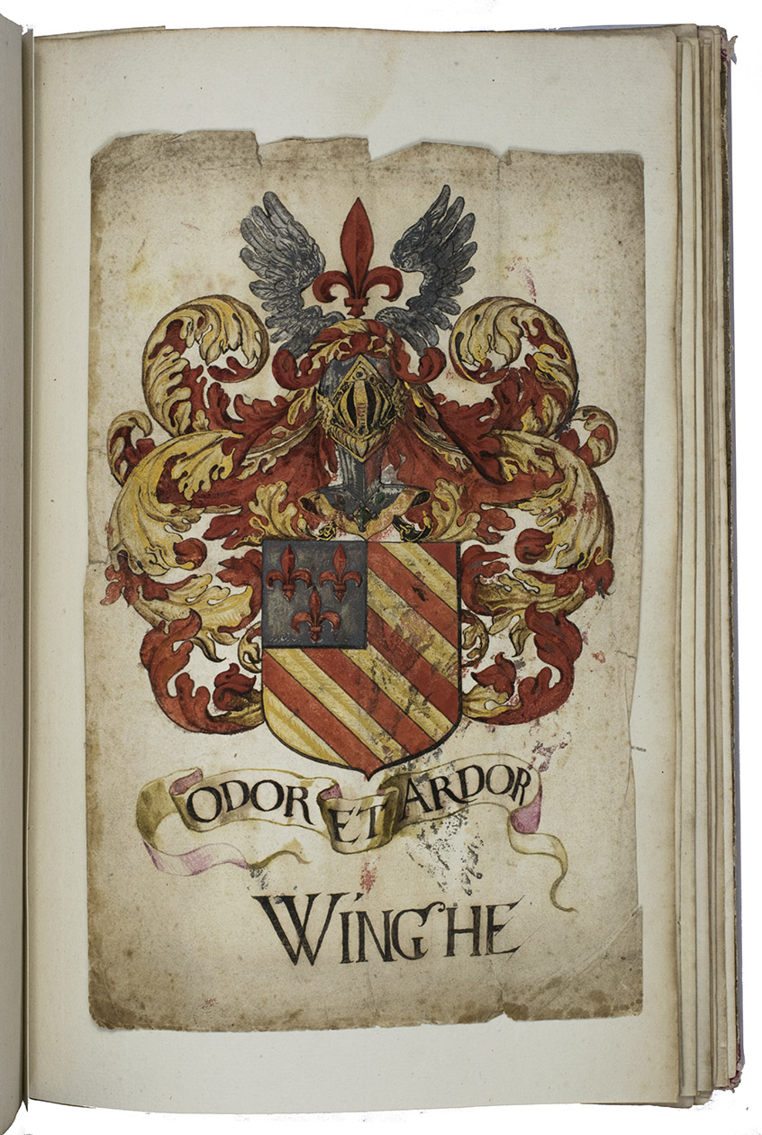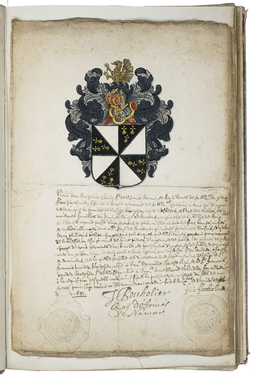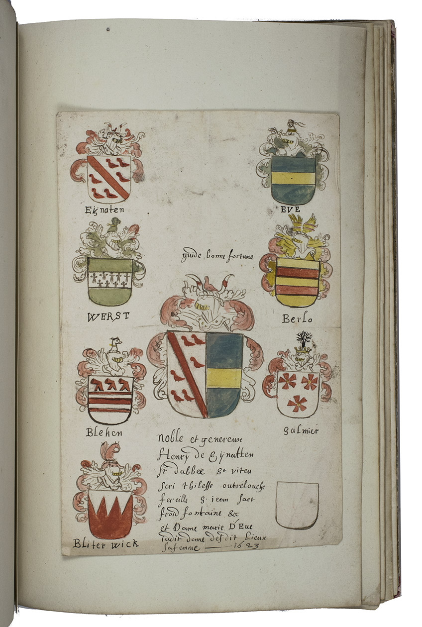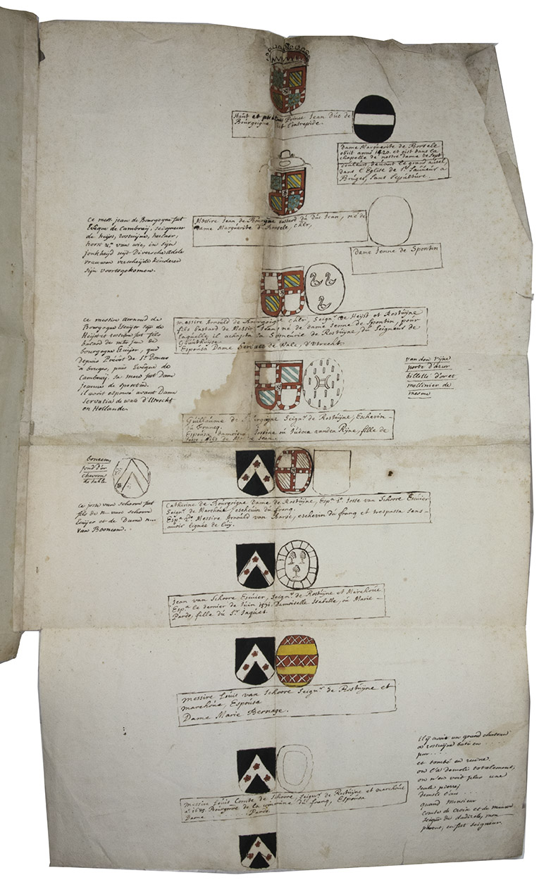 Album containing a collection of 390 coats of arms, almost all executed by hand and mostly contemporary hand-coloured, of many important West-European noble families in Flanders, the Netherlands and France, but also some important members of European royal courts. The coat of arms are sometimes depicted on their own, but sometimes they are part of the 6 genealogical trees, showing the descendants of some noble families. Many of them concern 16th-, 17th- and 18th-century people, although only a few are or can be dated, apart from a few noble persons in this album living in the 14th- and 15th-century. Although the coat of arms are mostly from different families, the album also contains two small collections of families. The album opens with one of these small sub-collections, starting with 4 heraldic documents concerning the Flemish Van der Haeghen family and related families, among others the Van Eesbeke family as well as Van Winterbeke and Van Compostelle, all represented on a genealogical tree. Also added is a formal tract by the herald of arms Jan Boukelier, herald of arms of Namur (Belgium), with two wax seals covered with paper at the bottom of this tract, on the nobility of the Van der Haeghen family. Another family of which the album contains more than one heraldic document is the Dutch family Van der Does, particularly living in Holland, and other families they are related to, for example the De Laignier family, but also Aeyta, Denain and Van der Laen. The album contains 3 family descendants of the Van der Does family and their related families, providing a lot of information on them, including detailed captions on the family members.The album also contains some highlights. One of them is the luxurious executed coat of arms of the Spanish catholic royal couple Ferdinand II of Aragon (1452-1516) and Isabella I of Castile, beautifully painted and heightened with gold on vellum, then living in the Habsburg Netherlands. Another highlight is a large descendant of the 14th- and 15th-century Burgundian family, bound at the end of the album. Interesting is that this genealogical tree particularly covers the illegitimate children of the Burgundian court. The descendant starts with John I, duke of Burgundy, also known as John the Fearless (1371-1419). In this descendant the mother of his child, John of Burgundy and bishop of Cambria (1404-1479), is mistakenly identified as his mistress Marguerite de Borsele instead of his other mistress Agnes de Croy. Although he was bishop, his son John of Burgundy had numerous illegitimate children, including Arnold of Burgundy whose mother was Jeanne de Beaufort-Spontin. In this descendant the Burgundian family finally married in to the De Schoore family, and in the end to the famous Spanish-Bruges merchant family Pardo. Other interesting families occuring in the album are the Normandian family Remond, the Flemish Van Winghe family, the Wielant family (Dutch Flanders), the Limburgian Van Eynatten family of which a member was married to the D'Eve family and many more interesting families, including the coat of arms of Samuel Thiens, then mayor of the Dutch city of Amersfoort. Altogether a very rich album on heraldry, containing many coat of arms of some of the most important noble families of the Low Countries and France from the 16th to the 18th century.