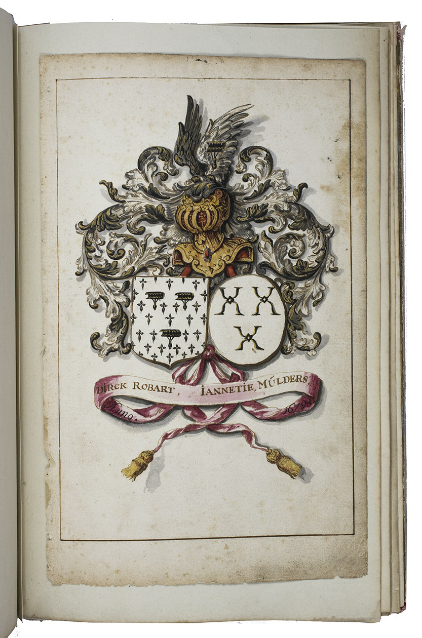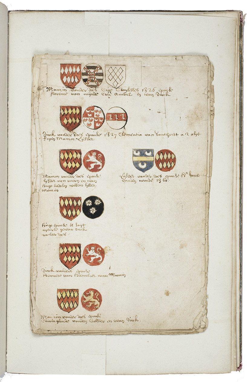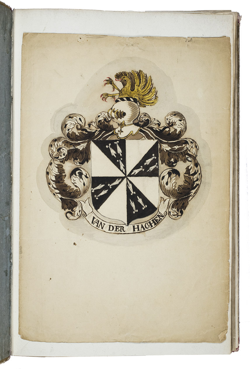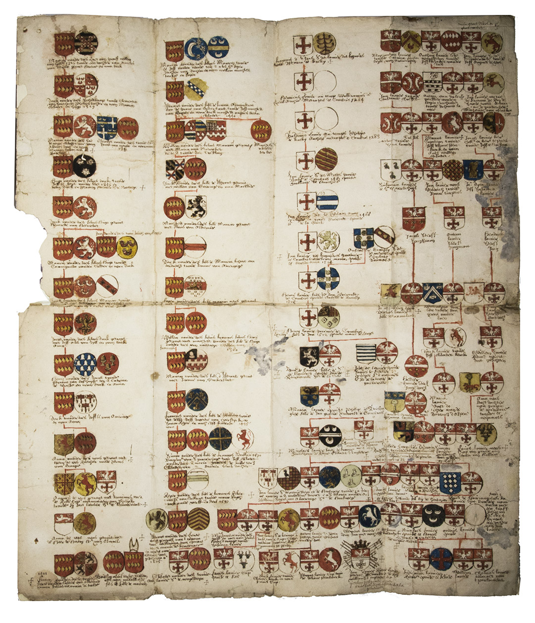 Album containing a collection of 390 coats of arms, almost all executed by hand and mostly contemporary hand-coloured, of many important West-European noble families in Flanders, the Netherlands and France, but also some important members of European royal courts. The coat of arms are sometimes depicted on their own, but sometimes they are part of the 6 genealogical trees, showing the descendants of some noble families. Many of them concern 16th-, 17th- and 18th-century people, although only a few are or can be dated, apart from a few noble persons in this album living in the 14th- and 15th-century. Although the coat of arms are mostly from different families, the album also contains two small collections of families. The album opens with one of these small sub-collections, starting with 4 heraldic documents concerning the Flemish Van der Haeghen family and related families, among others the Van Eesbeke family as well as Van Winterbeke and Van Compostelle, all represented on a genealogical tree. Also added is a formal tract by the herald of arms Jan Boukelier, herald of arms of Namur (Belgium), with two wax seals covered with paper at the bottom of this tract, on the nobility of the Van der Haeghen family. Another family of which the album contains more than one heraldic document is the Dutch family Van der Does, particularly living in Holland, and other families they are related to, for example the De Laignier family, but also Aeyta, Denain and Van der Laen. The album contains 3 family descendants of the Van der Does family and their related families, providing a lot of information on them, including detailed captions on the family members.The album also contains some highlights. One of them is the luxurious executed coat of arms of the Spanish catholic royal couple Ferdinand II of Aragon (1452-1516) and Isabella I of Castile, beautifully painted and heightened with gold on vellum, then living in the Habsburg Netherlands. Another highlight is a large descendant of the 14th- and 15th-century Burgundian family, bound at the end of the album. Interesting is that this genealogical tree particularly covers the illegitimate children of the Burgundian court. The descendant starts with John I, duke of Burgundy, also known as John the Fearless (1371-1419). In this descendant the mother of his child, John of Burgundy and bishop of Cambria (1404-1479), is mistakenly identified as his mistress Marguerite de Borsele instead of his other mistress Agnes de Croy. Although he was bishop, his son John of Burgundy had numerous illegitimate children, including Arnold of Burgundy whose mother was Jeanne de Beaufort-Spontin. In this descendant the Burgundian family finally married in to the De Schoore family, and in the end to the famous Spanish-Bruges merchant family Pardo. Other interesting families occuring in the album are the Normandian family Remond, the Flemish Van Winghe family, the Wielant family (Dutch Flanders), the Limburgian Van Eynatten family of which a member was married to the D'Eve family and many more interesting families, including the coat of arms of Samuel Thiens, then mayor of the Dutch city of Amersfoort. Altogether a very rich album on heraldry, containing many coat of arms of some of the most important noble families of the Low Countries and France from the 16th to the 18th century.