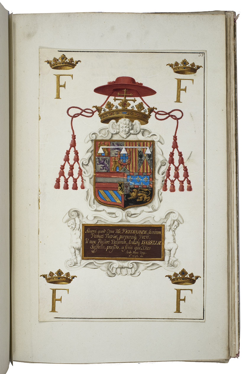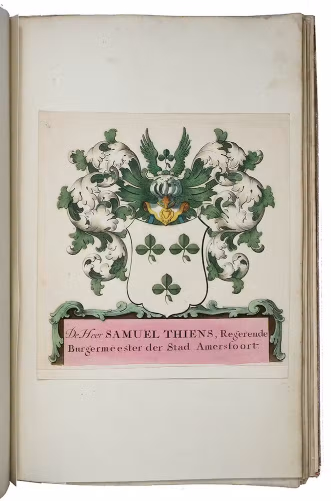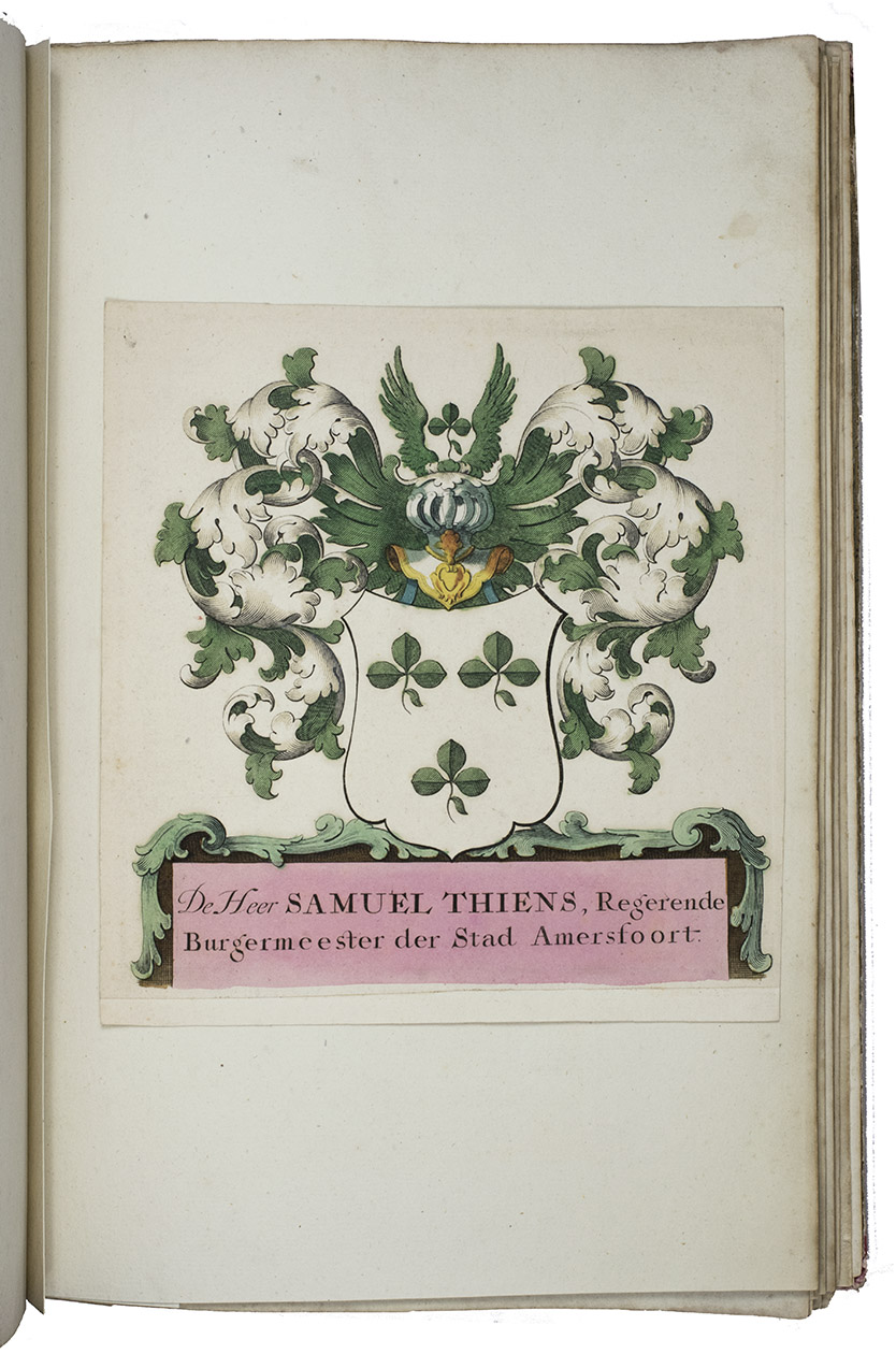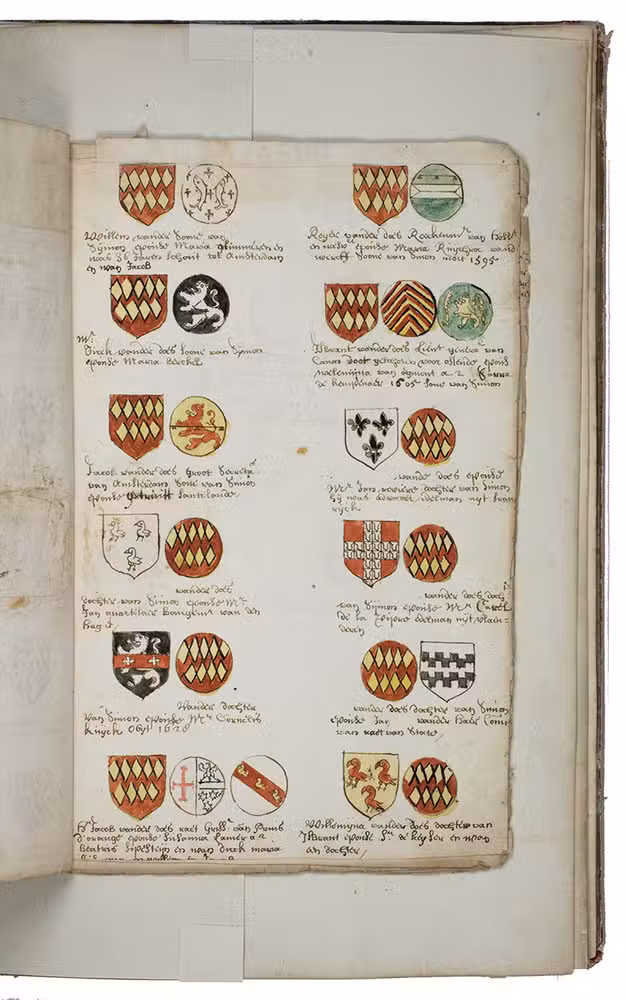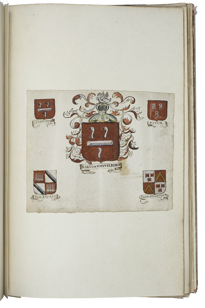 Album containing a collection of 390 coats of arms, almost all executed by hand and mostly contemporary hand-coloured, of many important West-European noble families in Flanders, the Netherlands and France, but also some important members of European royal courts. The coat of arms are sometimes depicted on their own, but sometimes they are part of the 6 genealogical trees, showing the descendants of some noble families. Many of them concern 16th-, 17th- and 18th-century people, although only a few are or can be dated, apart from a few noble persons in this album living in the 14th- and 15th-century. Although the coat of arms are mostly from different families, the album also contains two small collections of families. The album opens with one of these small sub-collections, starting with 4 heraldic documents concerning the Flemish Van der Haeghen family and related families, among others the Van Eesbeke family as well as Van Winterbeke and Van Compostelle, all represented on a genealogical tree. Also added is a formal tract by the herald of arms Jan Boukelier, herald of arms of Namur (Belgium), with two wax seals covered with paper at the bottom of this tract, on the nobility of the Van der Haeghen family. Another family of which the album contains more than one heraldic document is the Dutch family Van der Does, particularly living in Holland, and other families they are related to, for example the De Laignier family, but also Aeyta, Denain and Van der Laen. The album contains 3 family descendants of the Van der Does family and their related families, providing a lot of information on them, including detailed captions on the family members.The album also contains some highlights. One of them is the luxurious executed coat of arms of the Spanish catholic royal couple Ferdinand II of Aragon (1452-1516) and Isabella I of Castile, beautifully painted and heightened with gold on vellum, then living in the Habsburg Netherlands. Another highlight is a large descendant of the 14th- and 15th-century Burgundian family, bound at the end of the album. Interesting is that this genealogical tree particularly covers the illegitimate children of the Burgundian court. The descendant starts with John I, duke of Burgundy, also known as John the Fearless (1371-1419). In this descendant the mother of his child, John of Burgundy and bishop of Cambria (1404-1479), is mistakenly identified as his mistress Marguerite de Borsele instead of his other mistress Agnes de Croy. Although he was bishop, his son John of Burgundy had numerous illegitimate children, including Arnold of Burgundy whose mother was Jeanne de Beaufort-Spontin. In this descendant the Burgundian family finally married in to the De Schoore family, and in the end to the famous Spanish-Bruges merchant family Pardo. Other interesting families occuring in the album are the Normandian family Remond, the Flemish Van Winghe family, the Wielant family (Dutch Flanders), the Limburgian Van Eynatten family of which a member was married to the D'Eve family and many more interesting families, including the coat of arms of Samuel Thiens, then mayor of the Dutch city of Amersfoort. Altogether a very rich album on heraldry, containing many coat of arms of some of the most important noble families of the Low Countries and France from the 16th to the 18th century.