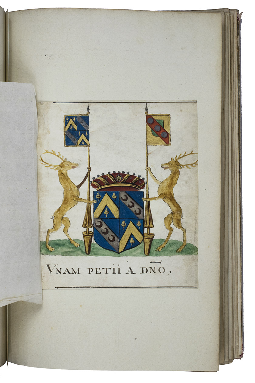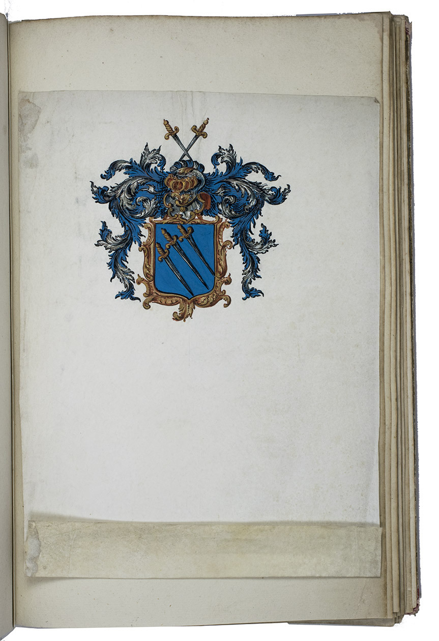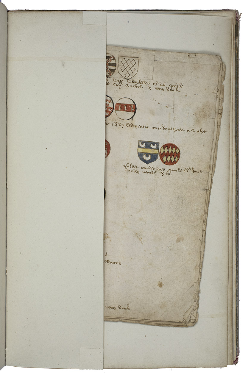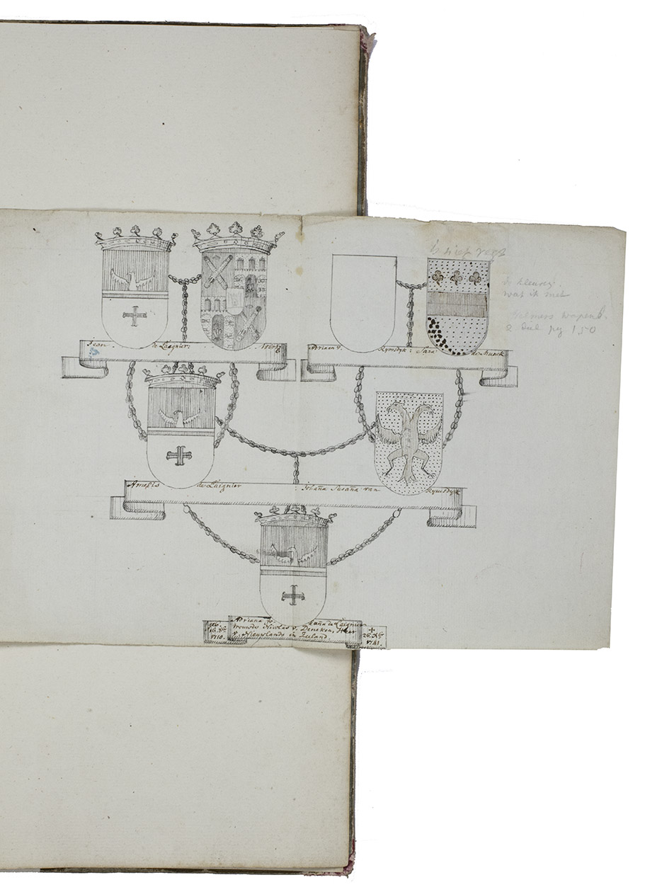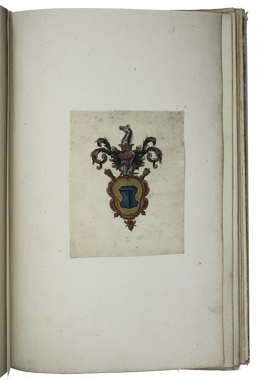 Binding a little worn, especially around the edges and spine. Some very slight browning and a few spots on the later paper leaves. The quires and loose leaves which are mounted on them are sometimes somewhat stained, browned, foxed, frayed or slightly dust-soiled, sometimes the folded leaves have small tears on the folds, but overall the album is in good condition, containing a highly interesting and varying collection of rare heraldic survivals, including some very luxurious examples on vellum.
