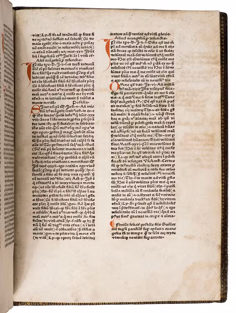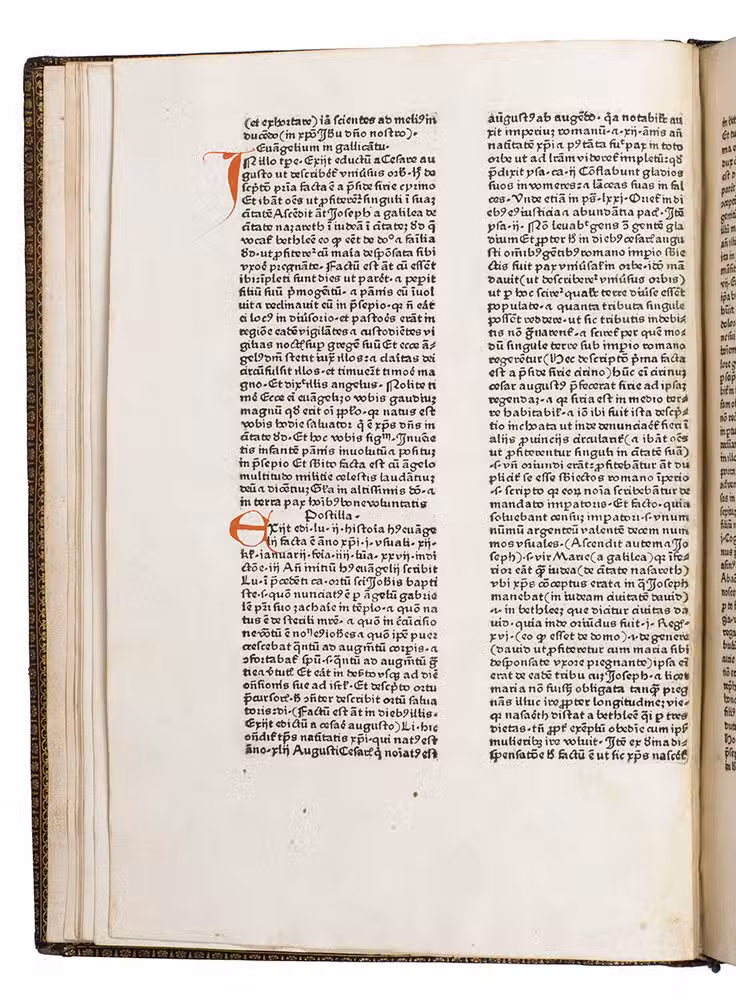 [Cologne, Ulrich Zell, 1483/87]. Small folio. Printed in 2 columns, each with 49 lines to the page. Set in a late example of a hybrid form type, with lombardic initials in red gouache. Rubricated on c4v-d2r. Mid- or late-18th-century gold-tooled French(?) red goatskin morocco, the spine with a dark green gold-tooled morocco label in the 2nd of 6 compartments, gold fillets on the board edges, gold-tooled turn-ins, gilt edges, French marbled endpapers. With the first page (the only preliminary page) in facsimile, but further complete. [130] ll.