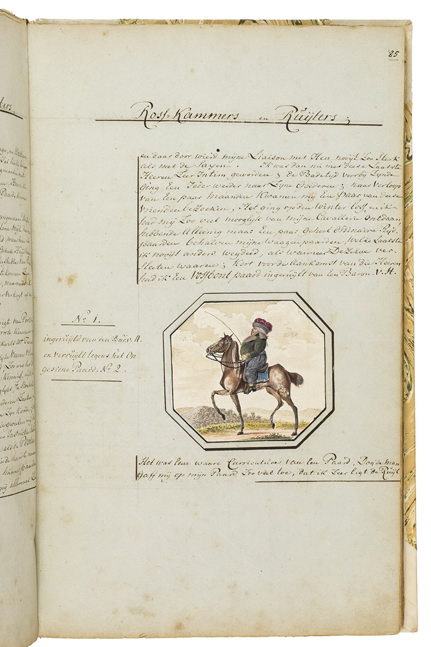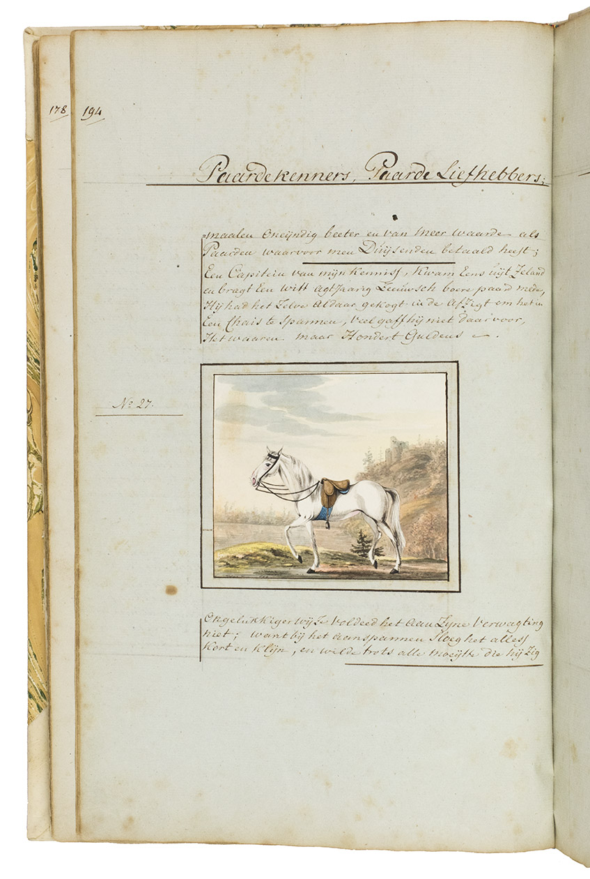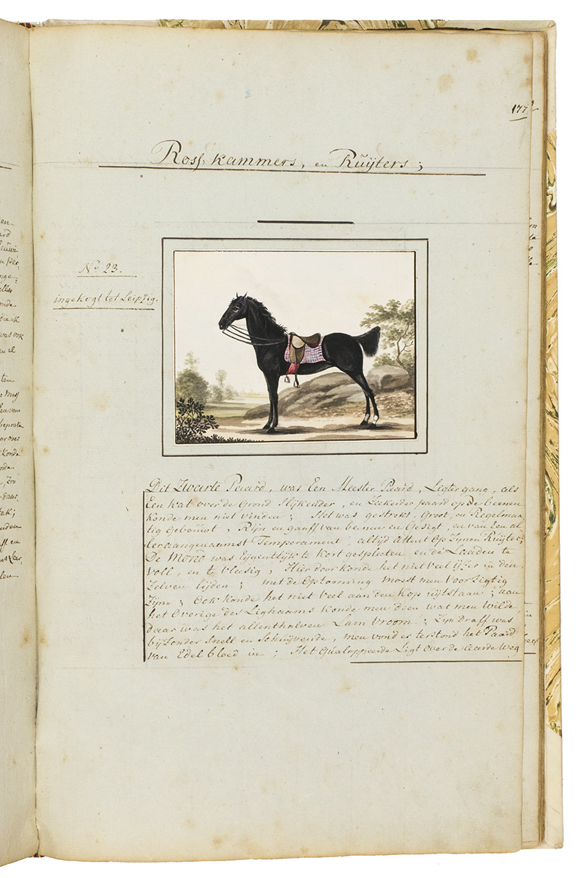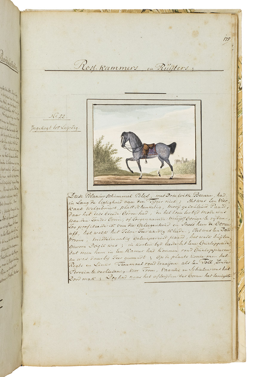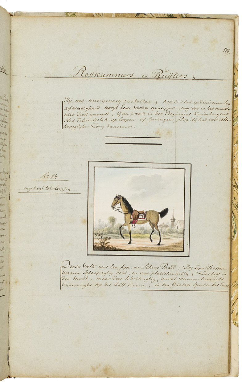 Very beautifully illustrated manuscript by a retired Dutch cavalry officer who had been in Prussian service against Napoleon Bonaparte in the years 1806 to 1813, giving his personal account of the horses he kept and traded during his career. The fine watercolours, executed with great care and refined draughtsmanship, show portraits of all 31 horses the author once owned. The text of the manuscript is also of considerable interest. The author relates many entertaining stories and includes many personal details his lifelong schooling in horsemanship, displaying a profound knowledge of horses. He also gives accounts of his daily life in the Prussian army. The manuscript provides insight into the life of the Silesian and Saxon noblemen, proceedings at the horse market in Leipzig, the situation of the army before the Battle of Jena, etc. Moreover, it gives a detailed descriptions of the terrible plundering of the French Wurtenberger Light Cavalry in Silesia, in 1806, and of the Russian invasion of Wohlau in 1813. Separate treatises devoted to these incidents precede the main part of the manuscript (the anecdotes and other information concerning horses) and serve as a sort of preface to them. The author also gives an account of his stay at the camp of the Count van Salm near Bergen-op-Zoom, Netherlands, of a horseback trip from Vianen to Utrecht, during which his horse fell and died, and another trip, from The Hague to Zutphen, on a tireless Zeeland horse. The manuscript explicitly refers to events from 1806 to June 1813 and was probably written soon after the latter date.