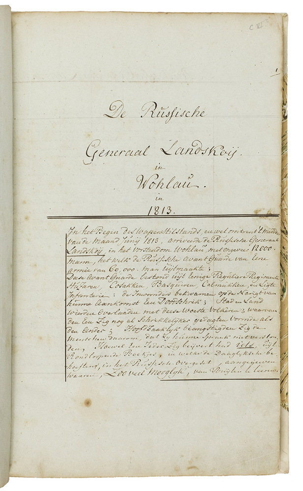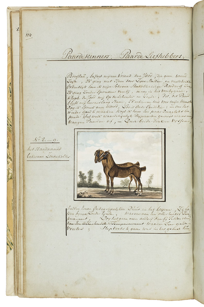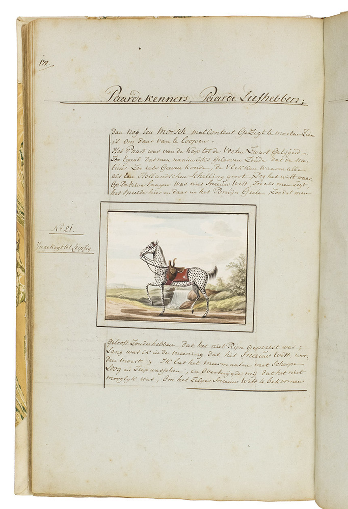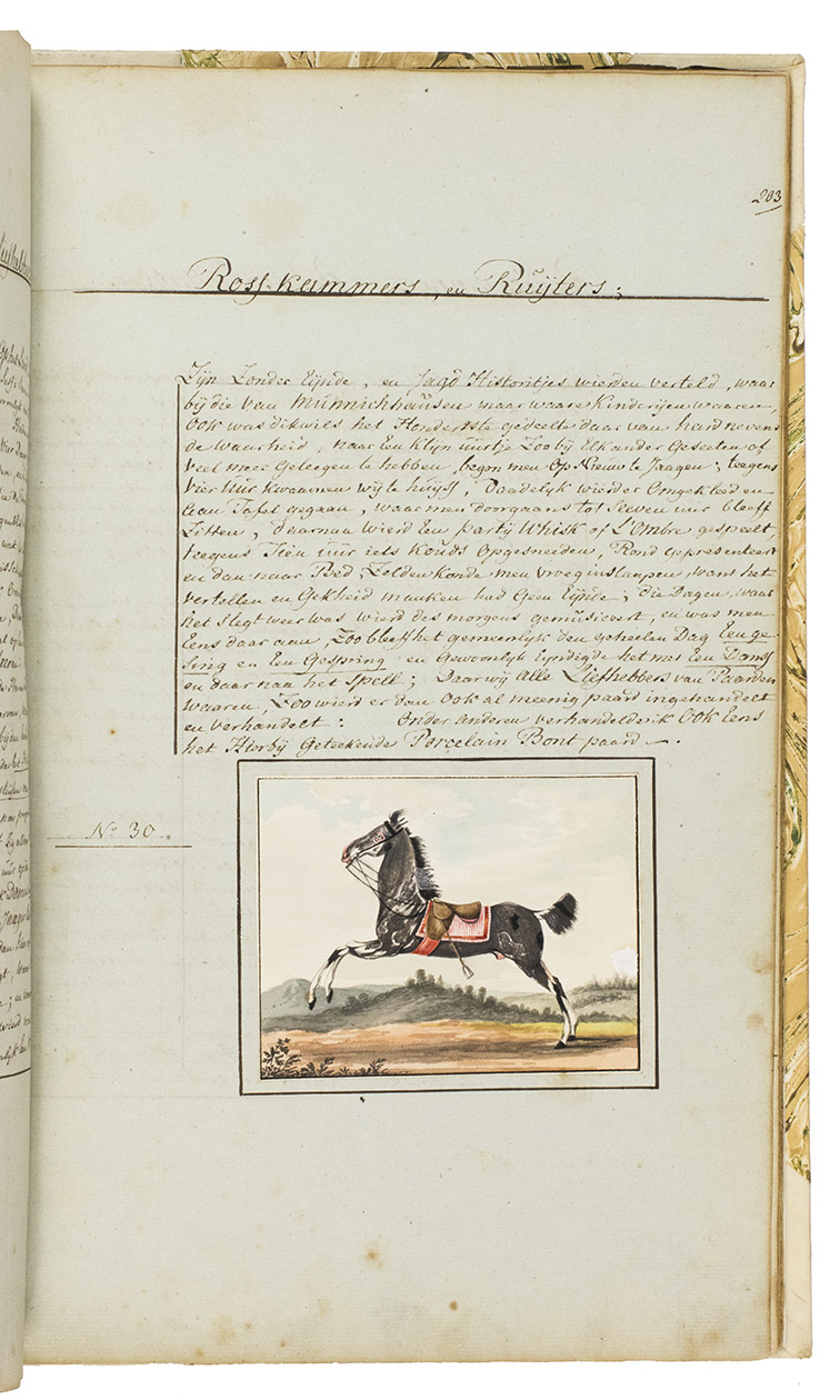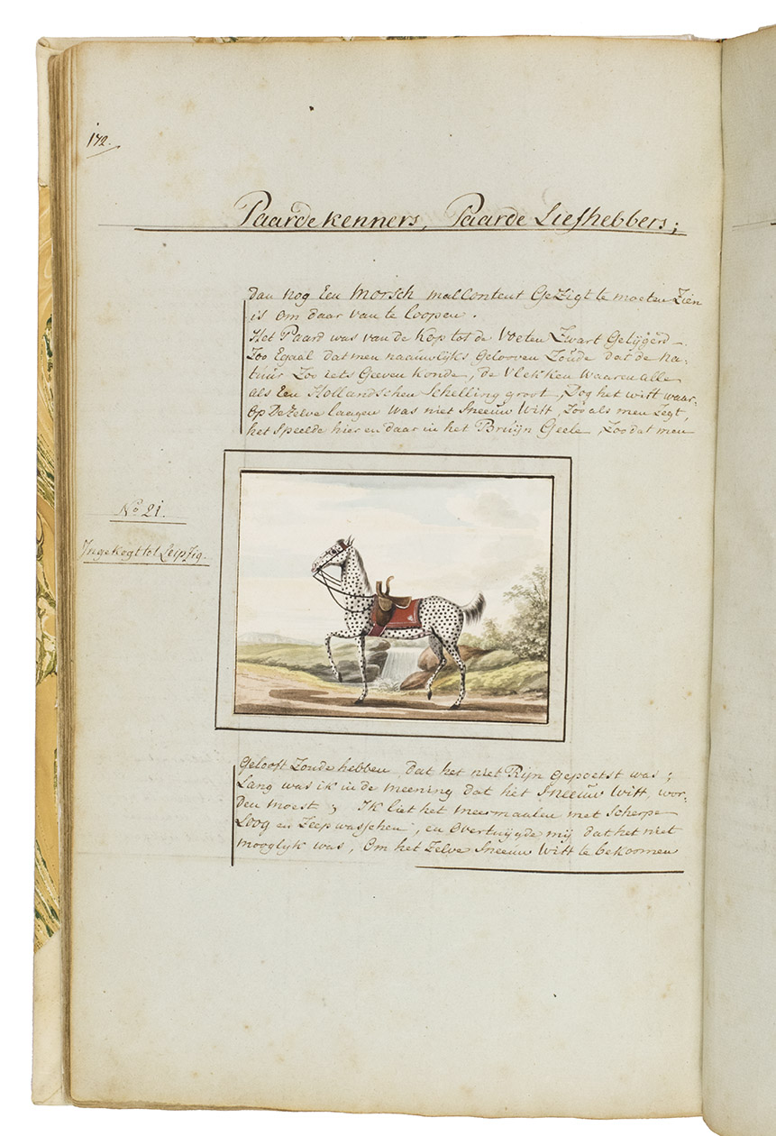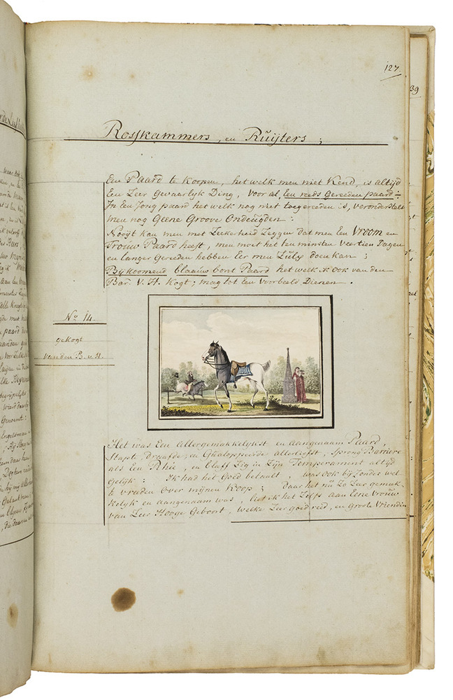 Very beautifully illustrated manuscript by a retired Dutch cavalry officer who had been in Prussian service against Napoleon Bonaparte in the years 1806 to 1813, giving his personal account of the horses he kept and traded during his career. The fine watercolours, executed with great care and refined draughtsmanship, show portraits of all 31 horses the author once owned. The text of the manuscript is also of considerable interest. The author relates many entertaining stories and includes many personal details his lifelong schooling in horsemanship, displaying a profound knowledge of horses. He also gives accounts of his daily life in the Prussian army. The manuscript provides insight into the life of the Silesian and Saxon noblemen, proceedings at the horse market in Leipzig, the situation of the army before the Battle of Jena, etc. Moreover, it gives a detailed descriptions of the terrible plundering of the French Wurtenberger Light Cavalry in Silesia, in 1806, and of the Russian invasion of Wohlau in 1813. Separate treatises devoted to these incidents precede the main part of the manuscript (the anecdotes and other information concerning horses) and serve as a sort of preface to them. The author also gives an account of his stay at the camp of the Count van Salm near Bergen-op-Zoom, Netherlands, of a horseback trip from Vianen to Utrecht, during which his horse fell and died, and another trip, from The Hague to Zutphen, on a tireless Zeeland horse. The manuscript explicitly refers to events from 1806 to June 1813 and was probably written soon after the latter date.