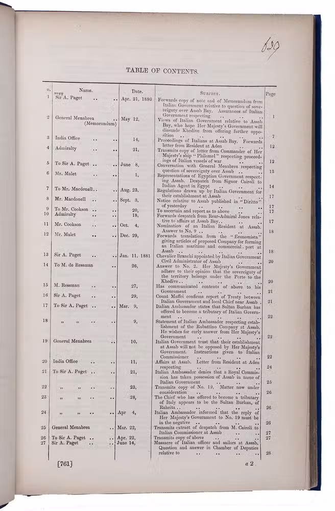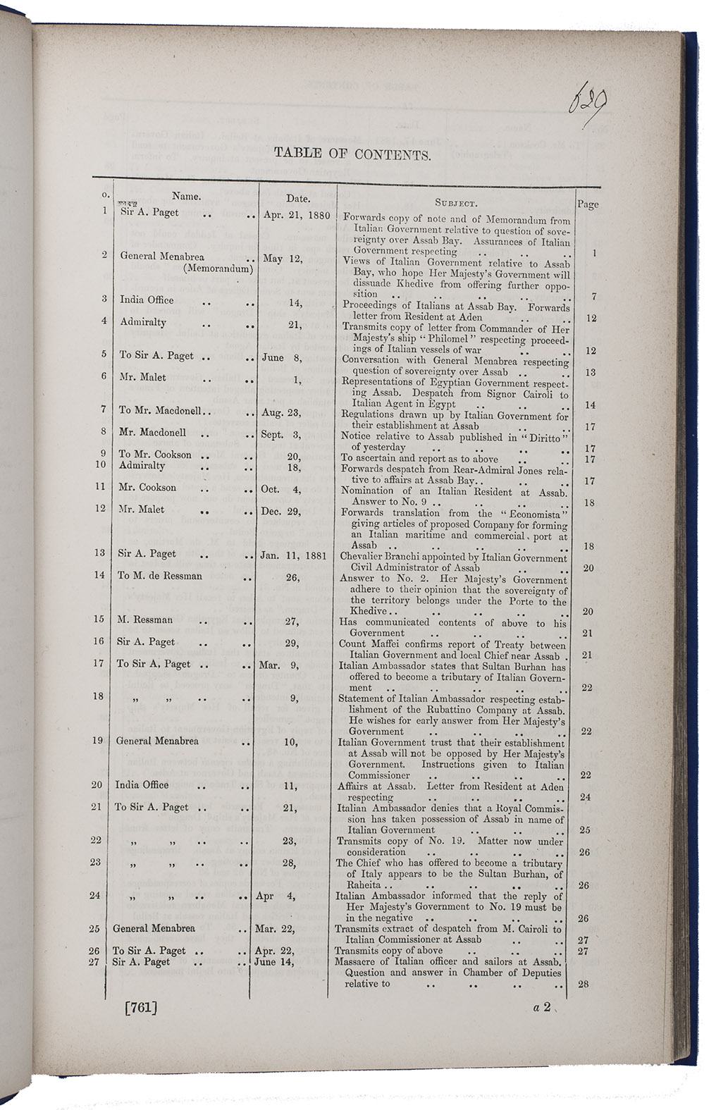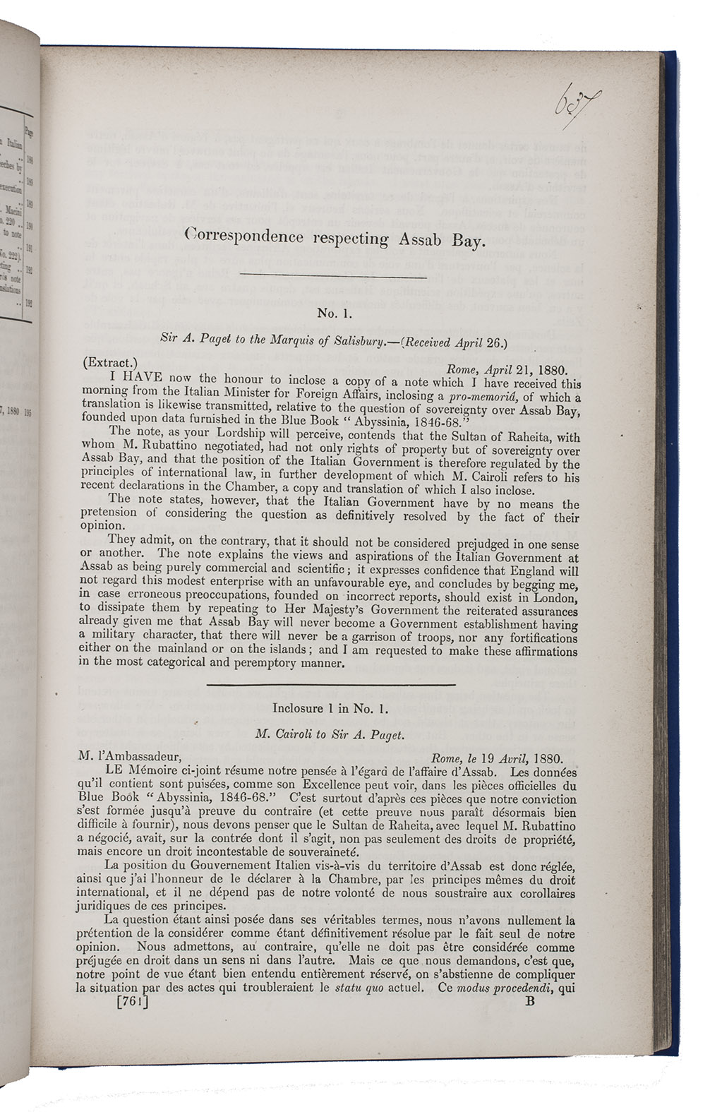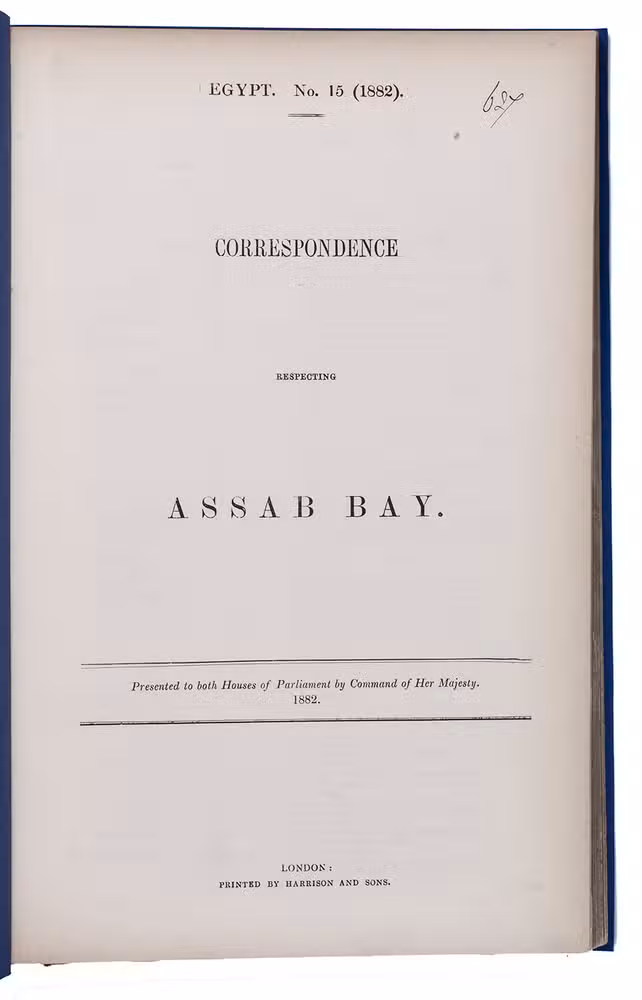 Official document, presented to the British Houses of Parliament, regarding Assab (Eritrea) and its politics. It includes a wide variety of letters and reports written by British naval officers, generals, the India Office, tradesmen, etc., concerning the politics of the Sultan of Raheita, the Italian government in Eritrea, territorial shifts, the relations with Egypt and Ethiopia and more.