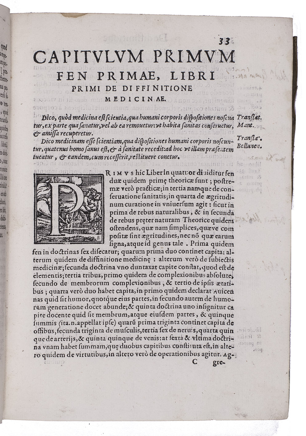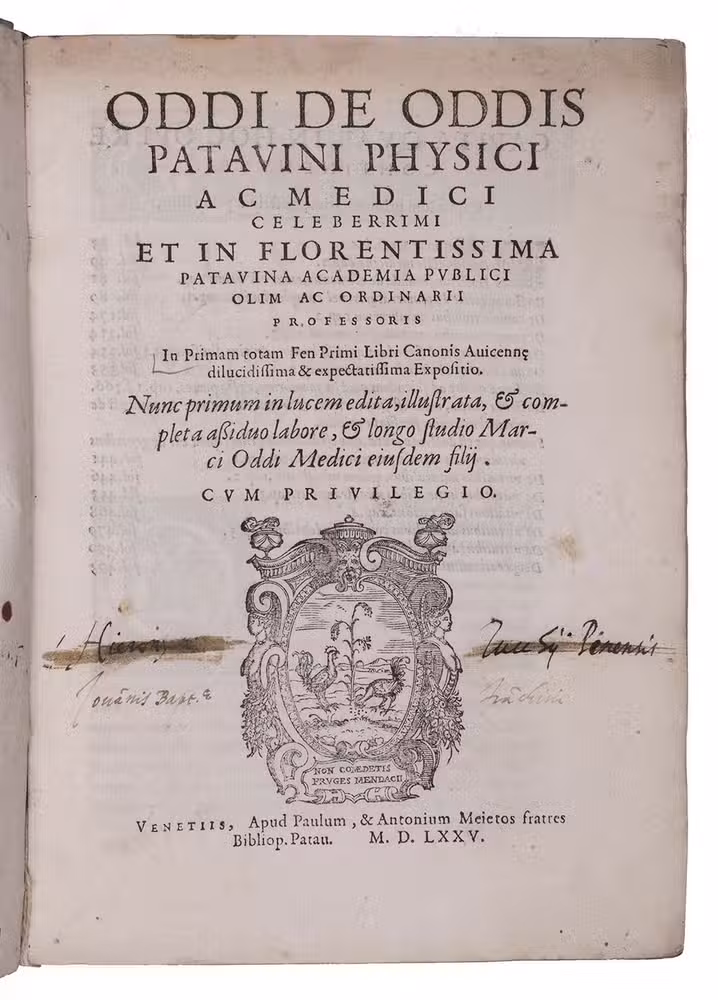Rare first and only edition of a commentary on book I, fen (section) I of Avicenna's Canon, including the Latin version of the text by Andrea Alpago and Jacob Mantino. Like most of Oddi's work it was published posthumously by his son Marco degli Oddi.