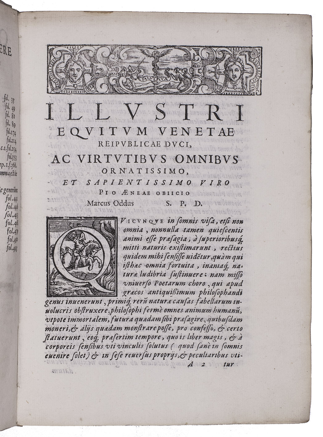 Venice, Paolo and Antonio Meietti, 1575. 4to. With woodcut device on title-page, a woodcut headpiece, 3 large and 17 smaller woodcut decorated initials, and a small woodcut decoration (plus 1 repeat). Contemporary limp vellum, with manuscript title on spine. [8], 499, [33] pp.