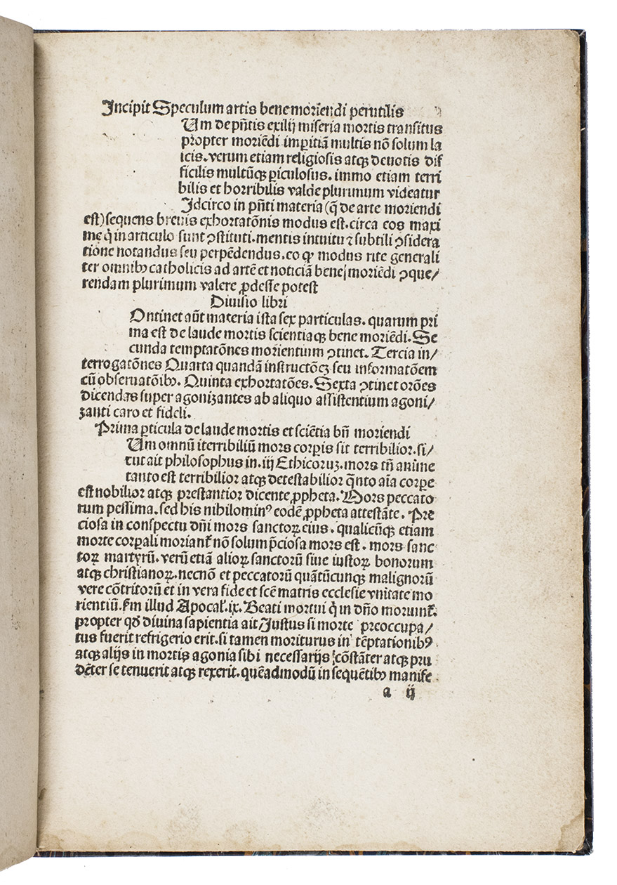 Quentells second quarto edition of the well-known manual on the art of dying, in the original Latin, matching his ca. 1493 quarto edition almost line for line and using the same woodcut, quite different from any used with this text before that date. Quentells quarto editions contain the original long version of the text, known as Speculum artis bene moriendi, often attributed to Matthaeus de Cracovia or Albertus Magnus (editions in Italian are often attributed to Dominicus de Capranica, Cardinal of Fermo). The Ars moriendi was one of the earliest incunabula printed and consists of two related Latin texts written around 1415 and 1450, offering guidance on how to have a good death according to Christian beliefs of the late Middle Ages. The texts were written in response to the Black Death and social upheavals of the 15th century, with the earliest versions likely composed in southern Germany. The highly popular Ars moriendi was translated into many West European languages, and was the first in a tradition of guides to death and dying. The first edition in the original Latin appeared ca. 1474, but was preceded by a German edition in 1473 and perhaps by an edition in Italian described as ca. 1471/75. Quentell published the Latin text together with other works in a folio edition described as ca. 1484/89, but he published four quarto editions of the Ars moriendi alone, described as ca. 1493, the present ca. 1495, ca. 1498 and another probably after 1500. He published no Ars moriendi editions in vernacular languages. His first three quarto editions have the same collation, but the present edition matches the ca. 1493 edition almost line for line and uses the same woodcut, while the ca. 1498 edition differs considerably and uses a different woodcut.