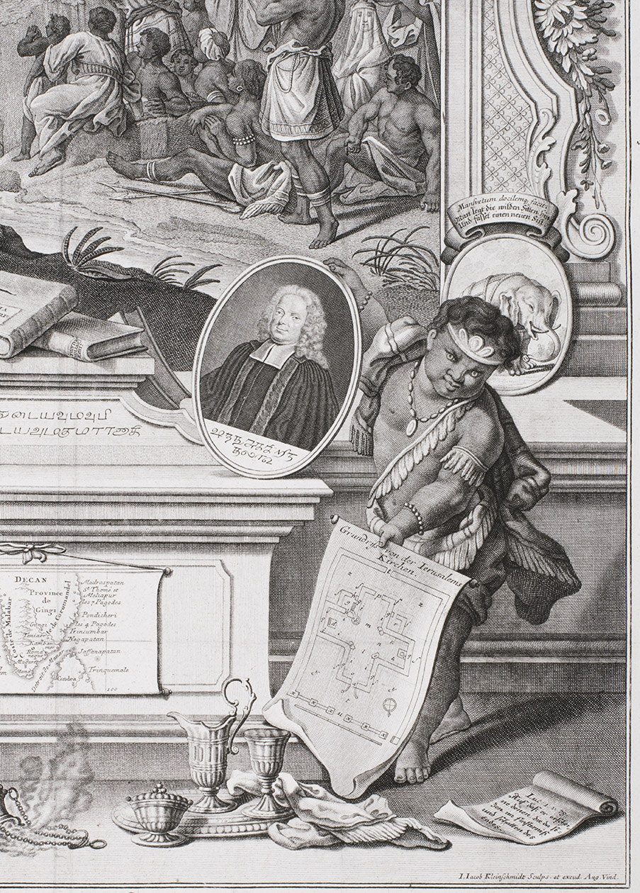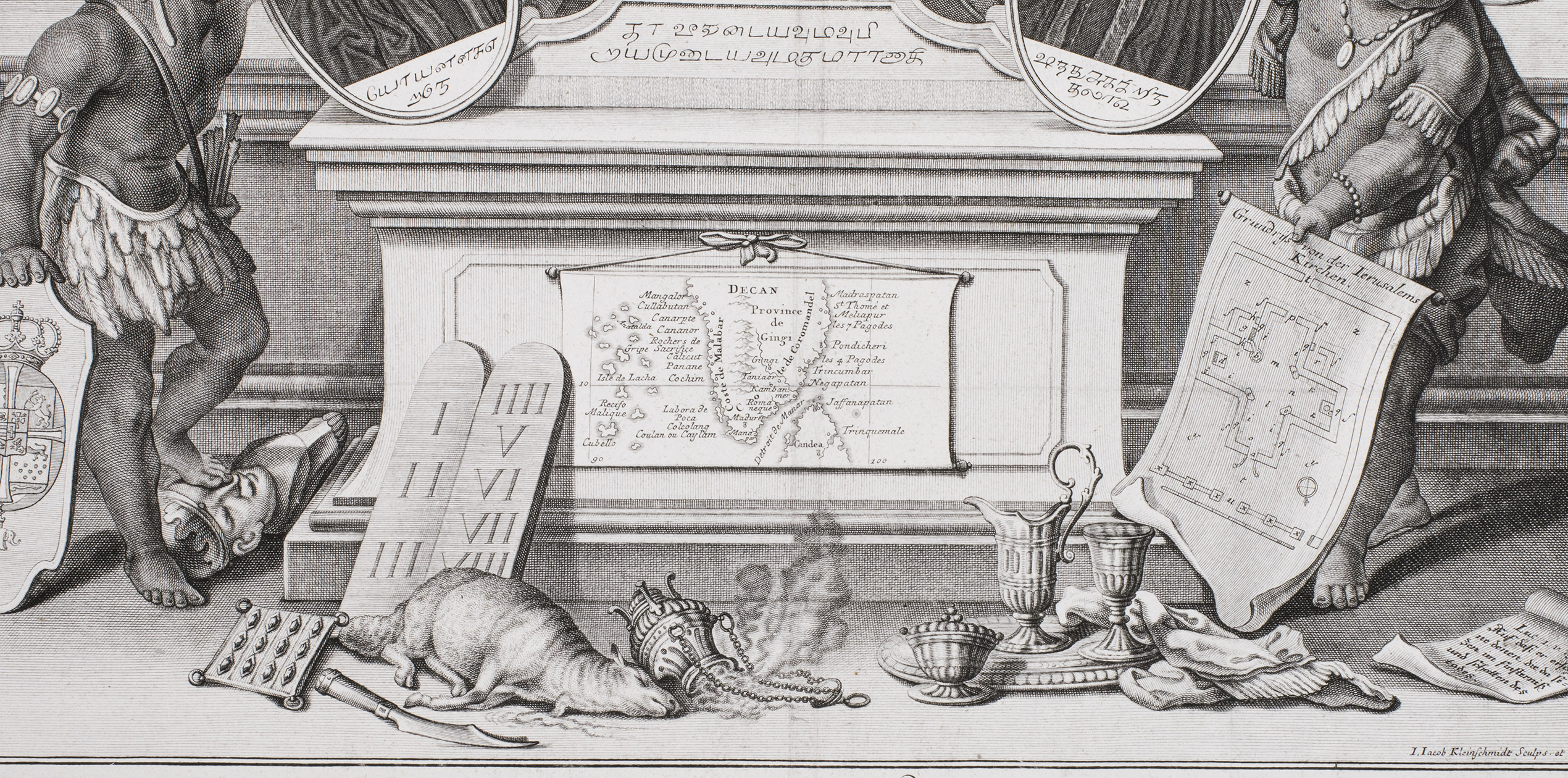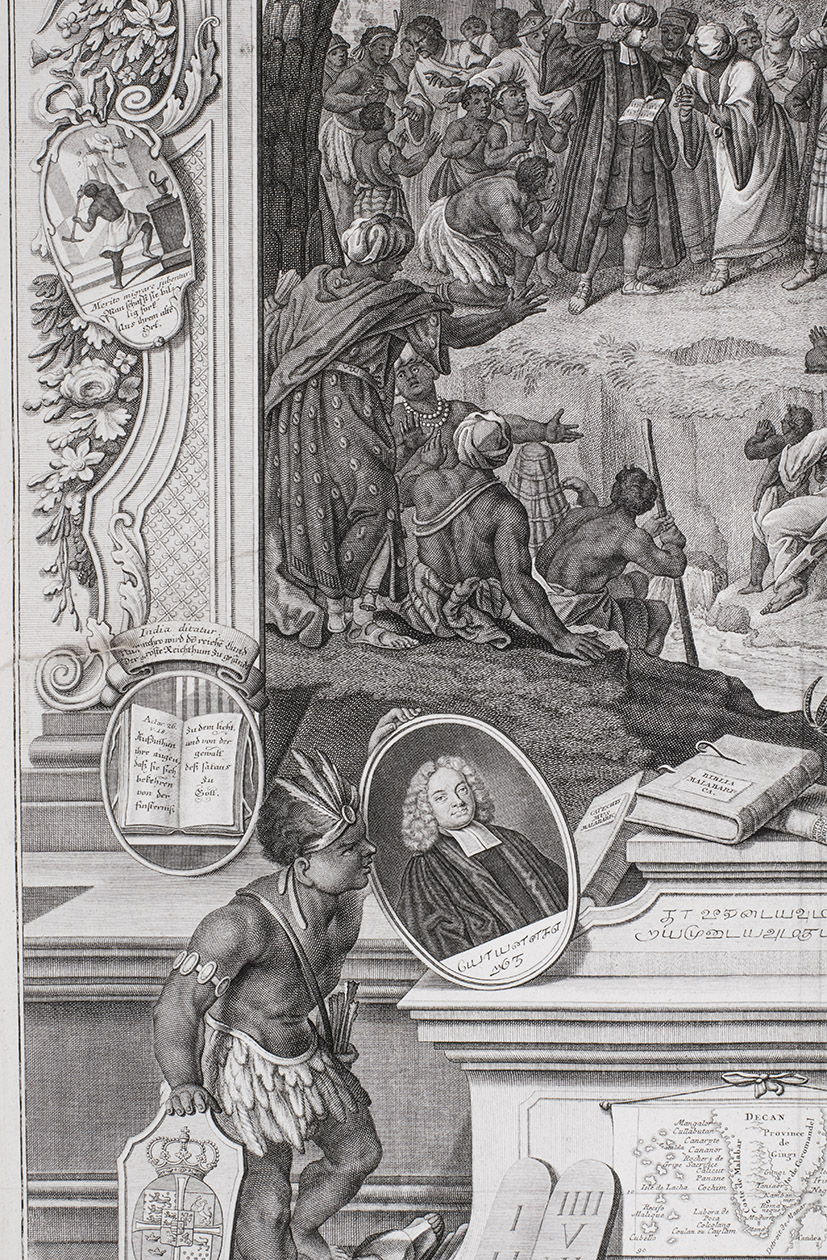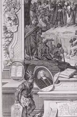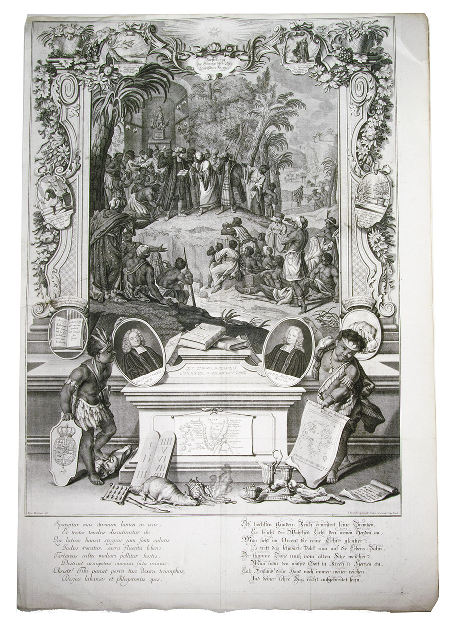 A grand engraving commemorating the achievements of the August Protestant Church in India features various scenes and elements. In the background, there are mountains, palm trees, houses, and people, including a Chinese person. The foreground shows deciduous and palm trees, with a lit grotto holding an idol inscribed with "Brama". In front of the grotto, an evangelical missionary preaches to a large congregation of natives while holding a book of music in his left hand and pointing to Brama with his right hand. The missionary wears a turban, a priest's cloak, and has flappers. The audience under the hill is depicted in interesting groups, with some closer to us, appearing larger and clearer. At the bottom of the engraving, there is an art altar with several books, including the "Biblia Malabarica", "Catechism Malabaricus", and the hymnal "Liber Cantion. Malabar."