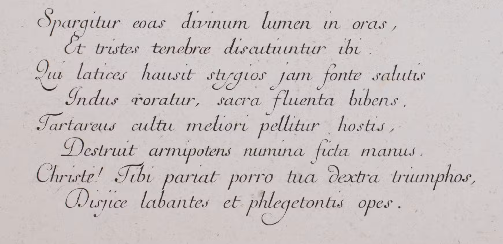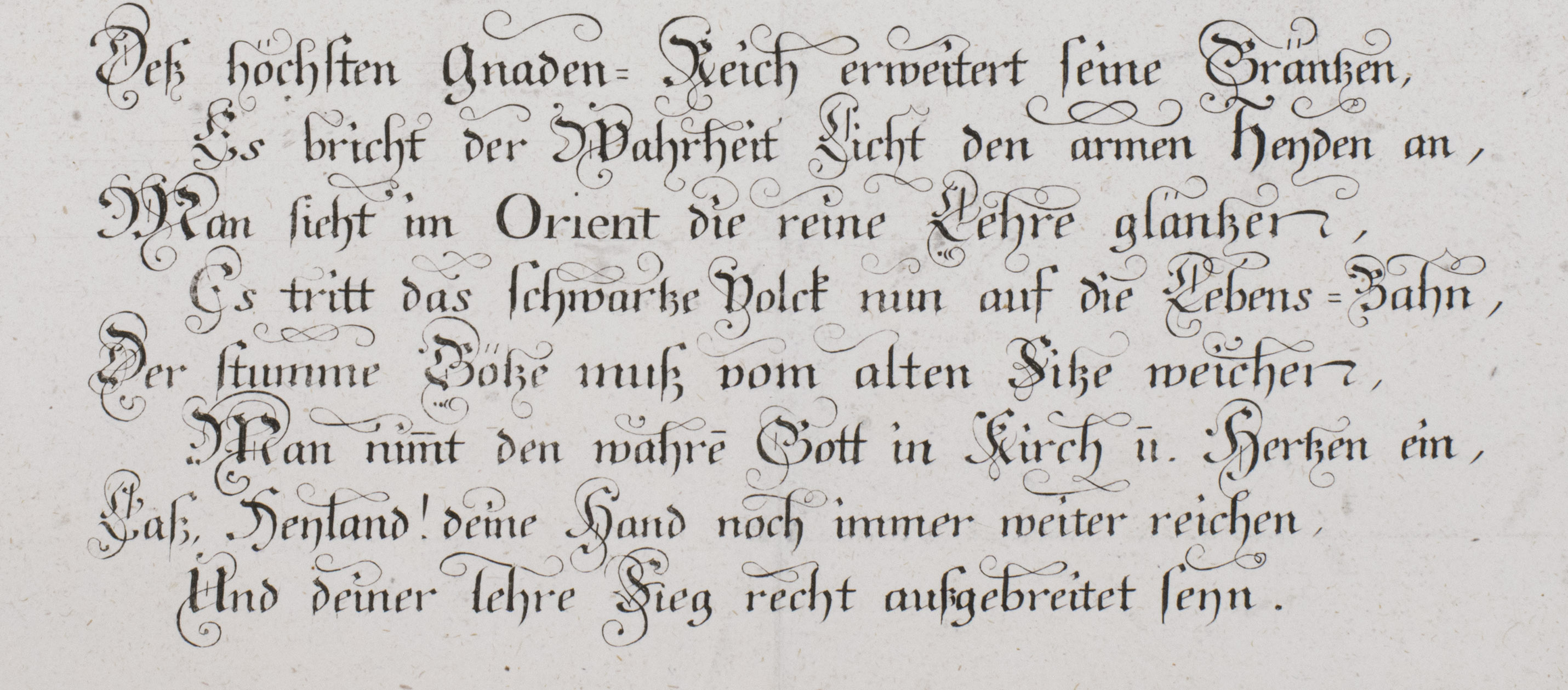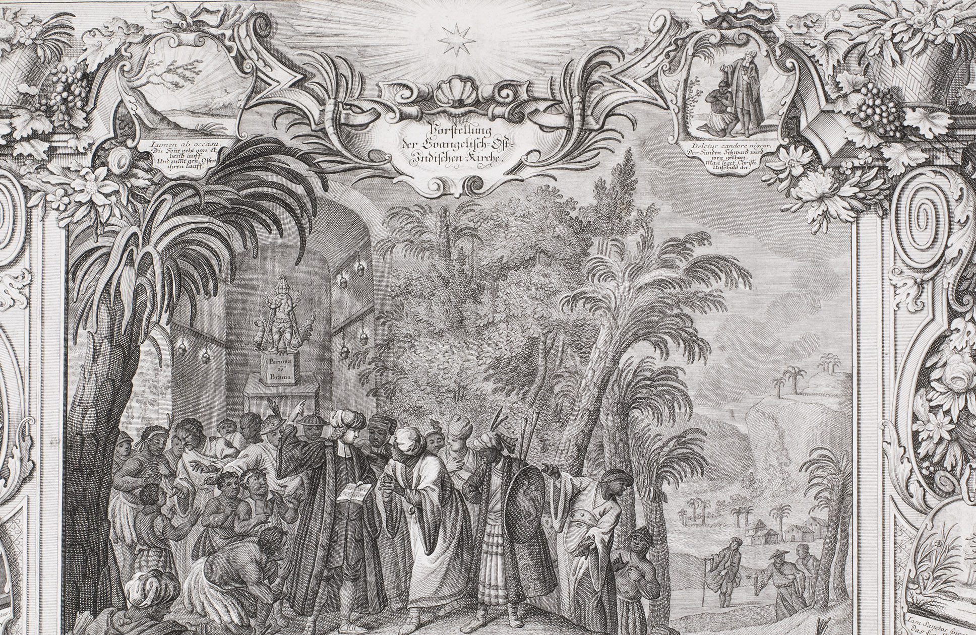A grand engraving commemorating the achievements of the August Protestant Church in India features various scenes and elements. In the background, there are mountains, palm trees, houses, and people, including a Chinese person. The foreground shows deciduous and palm trees, with a lit grotto holding an idol inscribed with "Brama". In front of the grotto, an evangelical missionary preaches to a large congregation of natives while holding a book of music in his left hand and pointing to Brama with his right hand. The missionary wears a turban, a priest's cloak, and has flappers. The audience under the hill is depicted in interesting groups, with some closer to us, appearing larger and clearer. At the bottom of the engraving, there is an art altar with several books, including the "Biblia Malabarica", "Catechism Malabaricus", and the hymnal "Liber Cantion. Malabar."