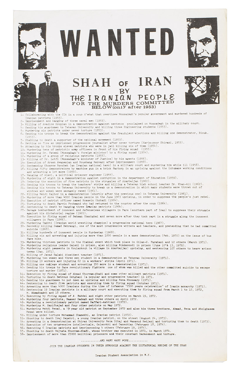 Very rare pamphlet by the Iranian Student Association in New York against the last Shah of Iran, Mohammad Reza Pahlavi (1919-1980), who reigned from 1941 to 1979, incriminating him for 58 "murders" between 1953 and 1974. The Iranian Student Association was one of the main anti-Shah propaganda machines, however the Iranian regime violently tried to suppress everyone who dared to challenge the Shah. The pamphlet lists the executions of specific persons (for example the Iranian world wrestling champion Takhti and Premier Mossaddegh's Minister of Justice Dr. Lotfi), but also the imprisonment of more than 25,000 political prisoners and their harassment and torture.