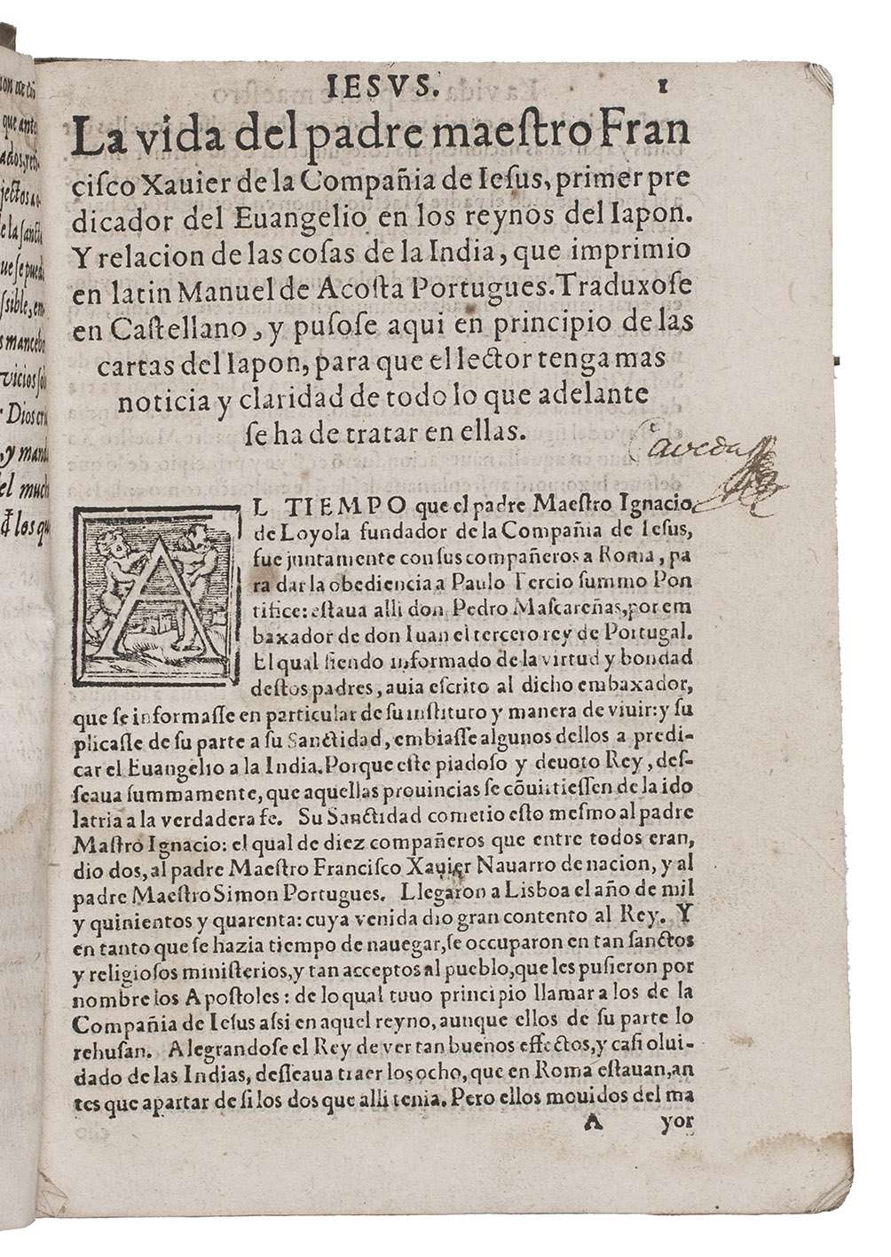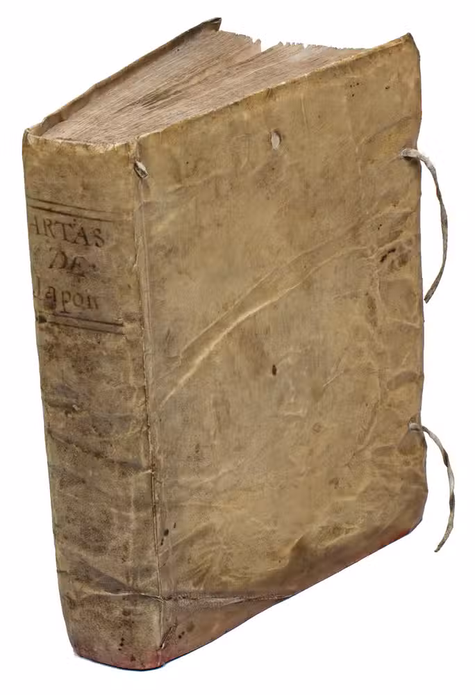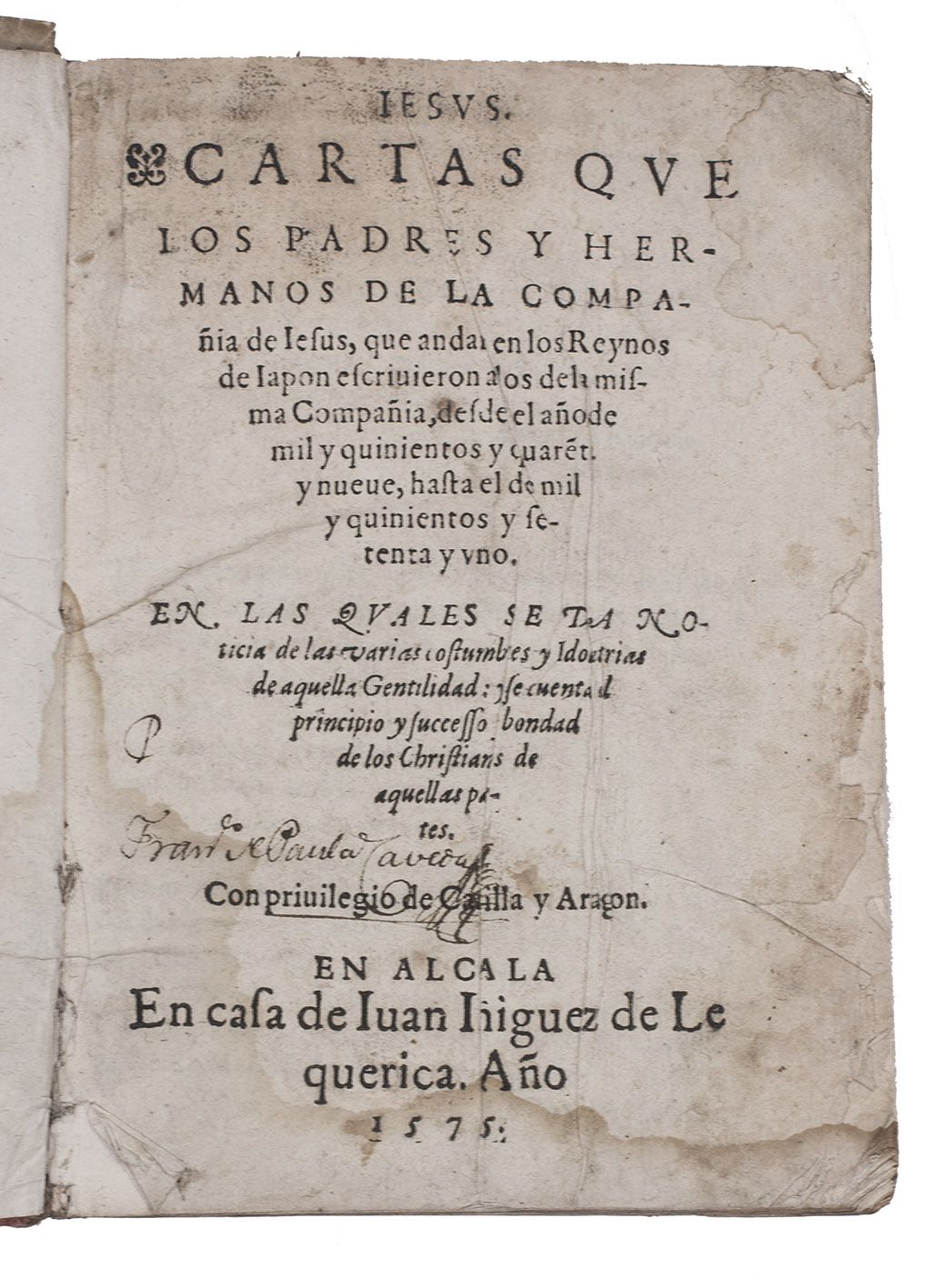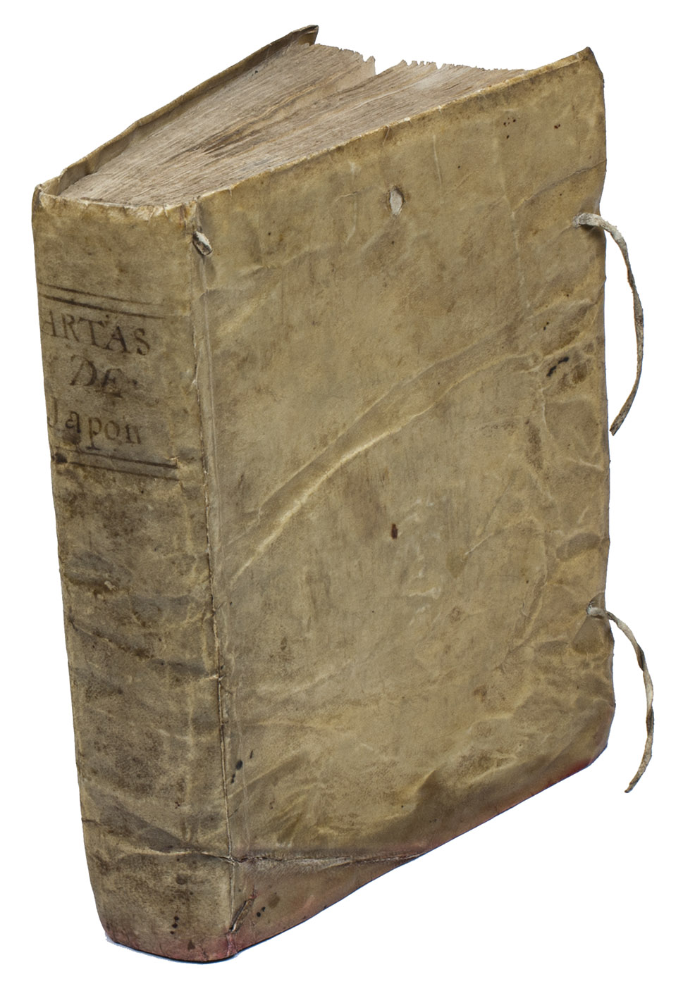 Lacking 2 leaves (¶7 and ¶8) from the preliminaries containing the "Indulgencias que nuestro Sancto Padre el Papa Pio. 4...". With 18th-century manuscript annotations in brown ink on the recto of the first free flyleaf, the title-page, at the start of the text on fol. 1r, the recto of the final leaf, and in the margins throughout; the margins show only marks to highlight certain passages, the other annotations are variations of the same owner's inscription (most elaborate on the front flyleaf): "Ex icDn. (?) Fran[ces]co et(?) Paula Caveda(?) Costo 15 ... Mad. a 4 .. Octobre 1786". The vellum of the binding is somewhat creased and stained, water stained throughout, the first and last few leaves are frayed and slightly damaged in the margins (without affecting the text), somewhat browned throughout. Otherwise in good condition. Alt-Japan-Katalog 298; Cordier, Japonica, cols. 67-68; Iberian Books 54608; Laures 140; Palau 46311; Porbase 363133 (1 copy); Salva 3282; Streit IV, 1519 (with a full list of all letters); USTC 337147.
