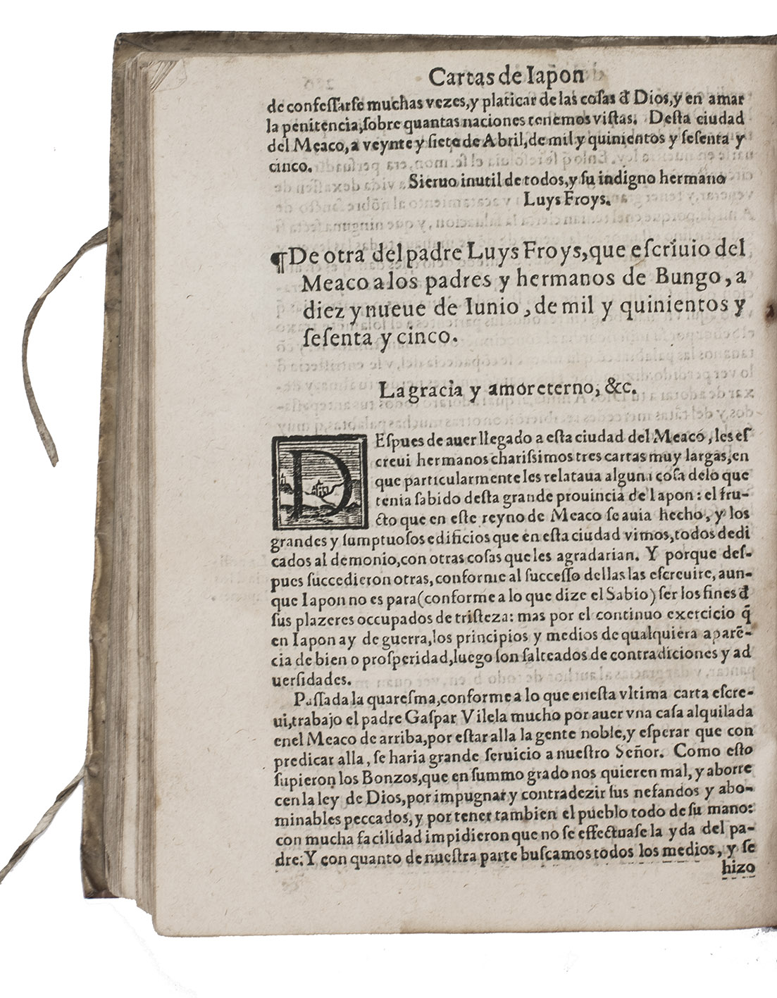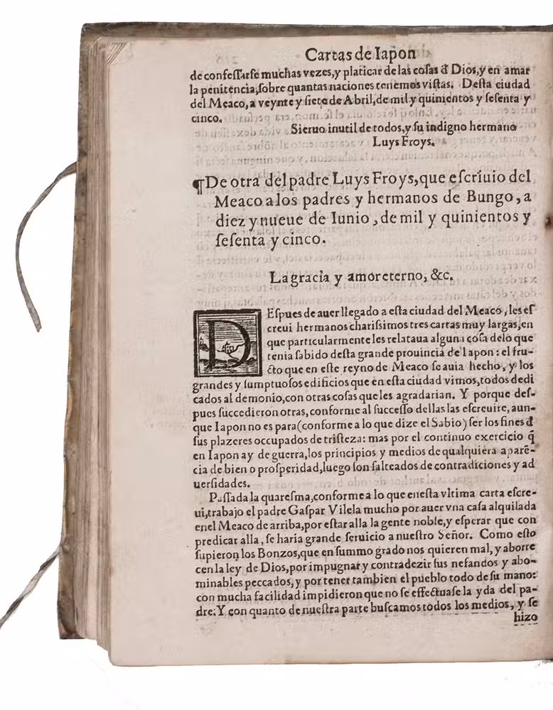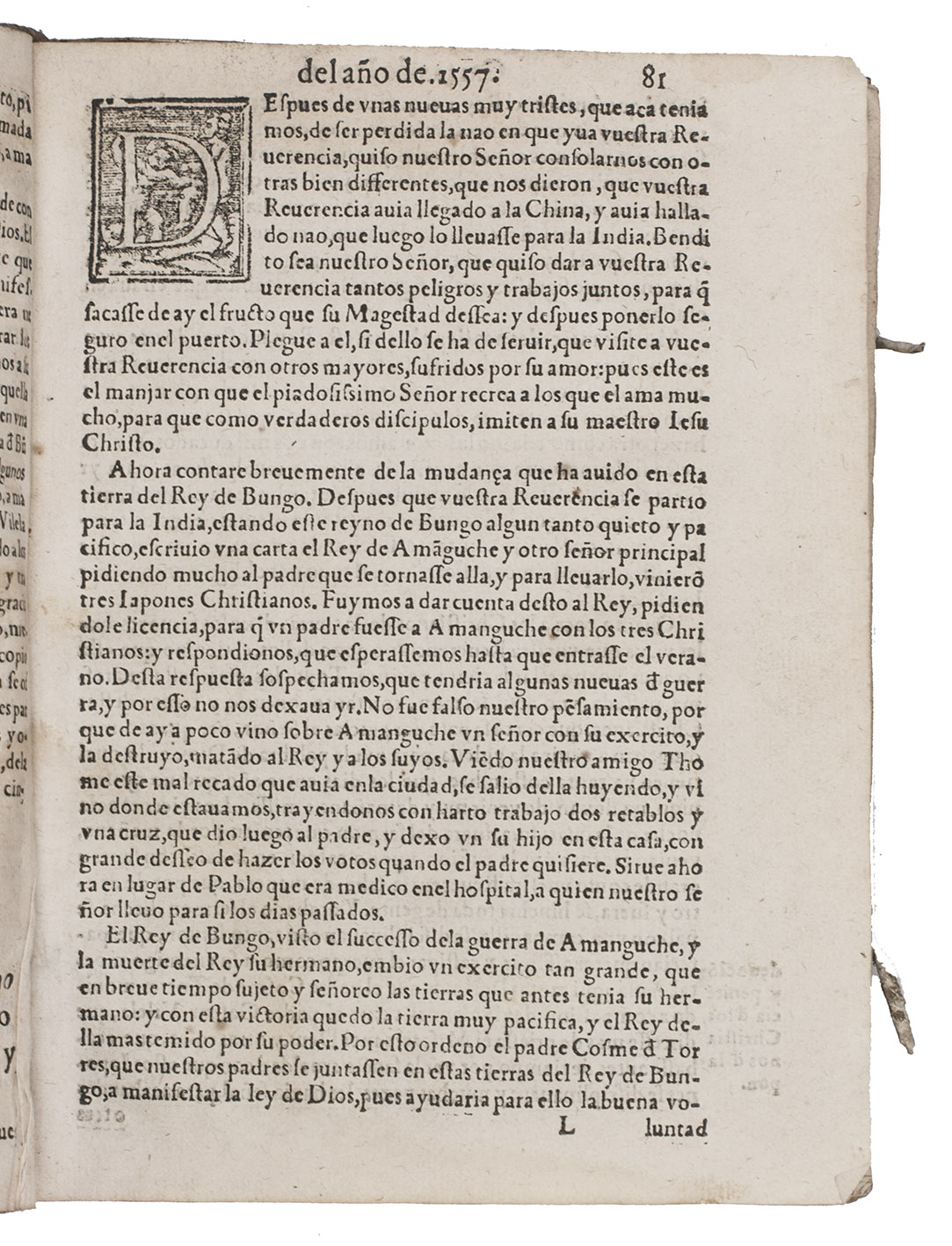 Lacking 2 leaves (¶7 and ¶8) from the preliminaries containing the "Indulgencias que nuestro Sancto Padre el Papa Pio. 4...". With 18th-century manuscript annotations in brown ink on the recto of the first free flyleaf, the title-page, at the start of the text on fol. 1r, the recto of the final leaf, and in the margins throughout; the margins show only marks to highlight certain passages, the other annotations are variations of the same owner's inscription (most elaborate on the front flyleaf): "Ex icDn. (?) Fran[ces]co et(?) Paula Caveda(?) Costo 15 ... Mad. a 4 .. Octobre 1786". The vellum of the binding is somewhat creased and stained, water stained throughout, the first and last few leaves are frayed and slightly damaged in the margins (without affecting the text), somewhat browned throughout. Otherwise in good condition. Alt-Japan-Katalog 298; Cordier, Japonica, cols. 67-68; Iberian Books 54608; Laures 140; Palau 46311; Porbase 363133 (1 copy); Salva 3282; Streit IV, 1519 (with a full list of all letters); USTC 337147.