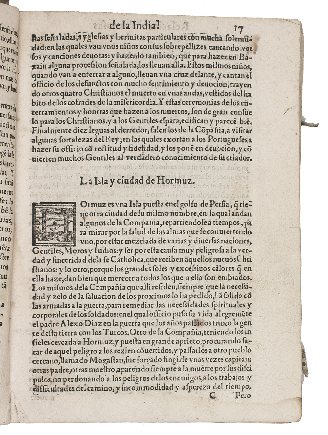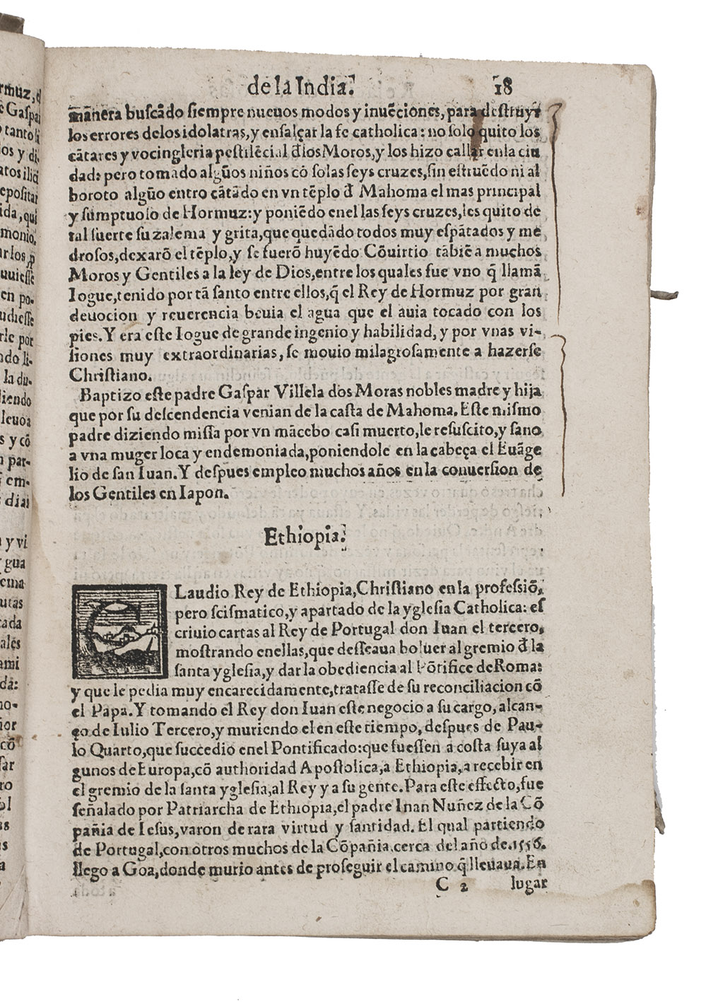 First Spanish edition of 87 Portuguese letters by Jesuit missionaries in Japan, very valuable for the history of the Jesuits in Japan, India, and other parts of (Southeast) Asia. The work was first published in Portuguese, in Coimbra in 1570 and contains 10 additional important Jesuit letters which had never published before. Noteworthy are the woodcut Chinese and Japanese characters included in the text on leaf I8v. Cordier gives a list of these additional letters, dating from 1567 to 1571. Other newly added were: the life of Francis Xavier, Relacion de las cosas de la India by Manuel Acosta with remarks on (in order of appearance) Goa, Cochin, Daman, Ceylon, Comorin, Bassein, Ormuz, Ethiopia, Inambay and Manomotapa, Malaca, the Moluccas, Ambonia, Solor, Macassar etc., and Breve relacion de la Isla y Reynos del Iapon.