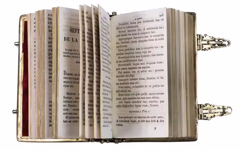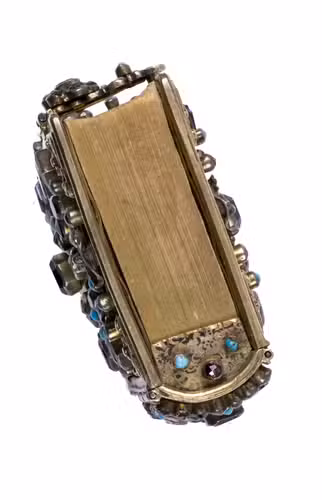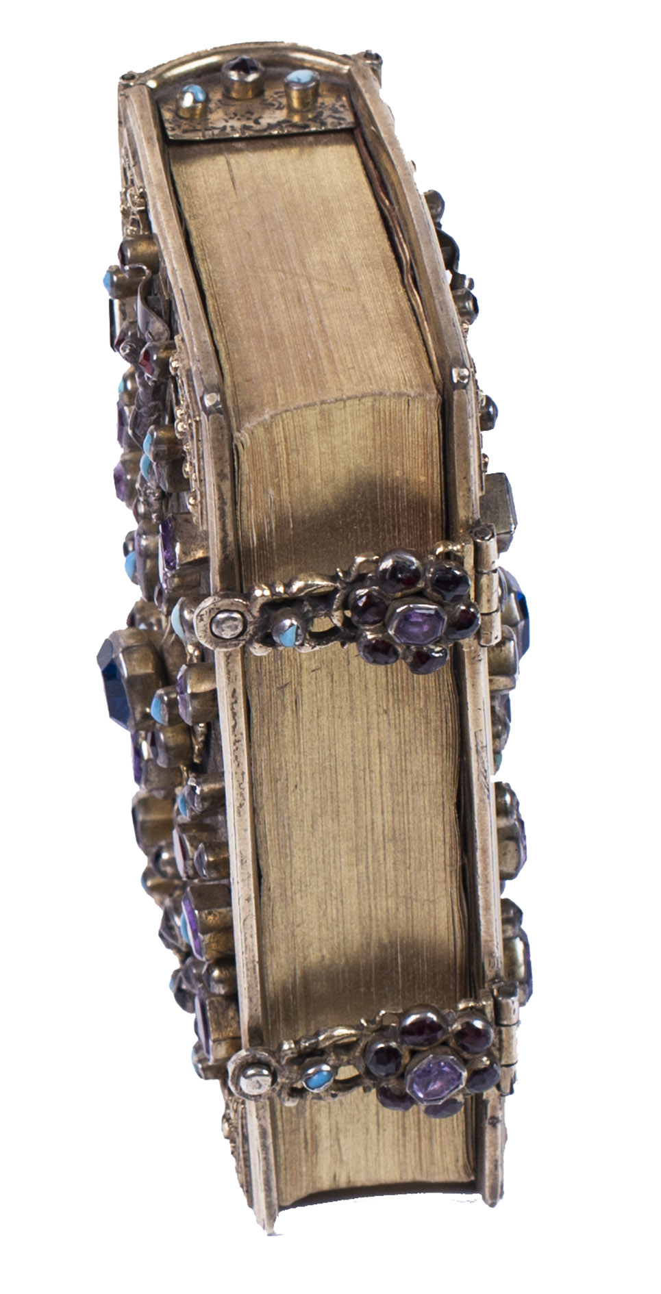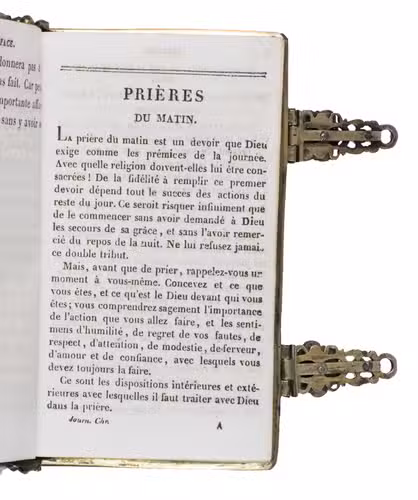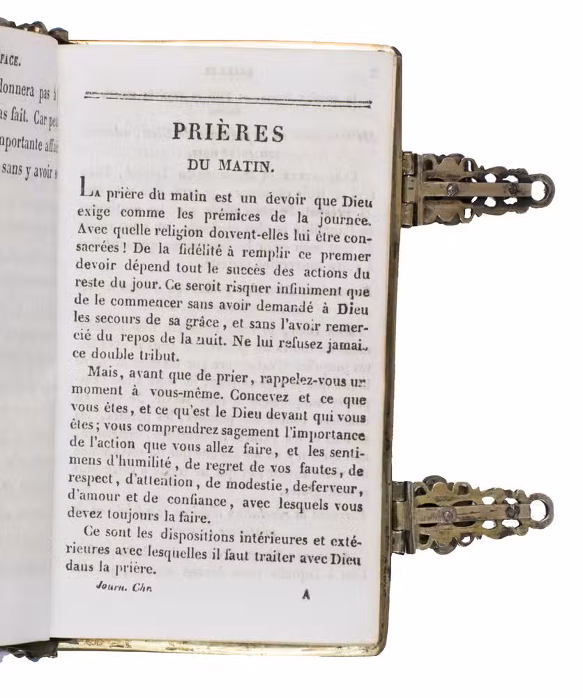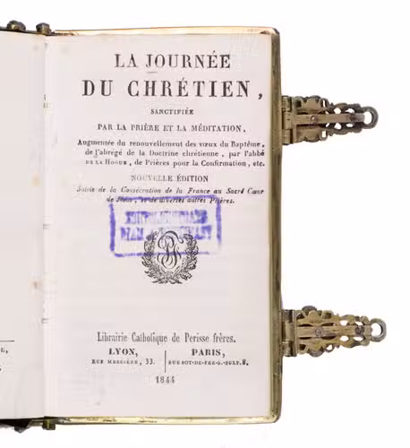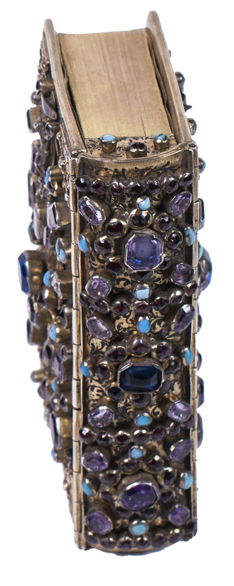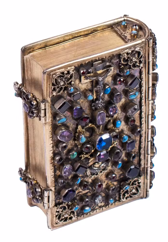 A beautiful and fabulously ornate jewelled 17th-century binding, its boards, spine and clasps adorned with turquoises, amethysts, garnets, and (simulated) sapphires. It contains a popular French prayerbook entitled La journée du chrétien, which was added long after the completion of the binding itself. The prayerbook, published in numerous editions during the 19th century, is reminiscent of medieval and early modern books of hours. The work specifies the daily duties of Christians and includes devotional prayers.