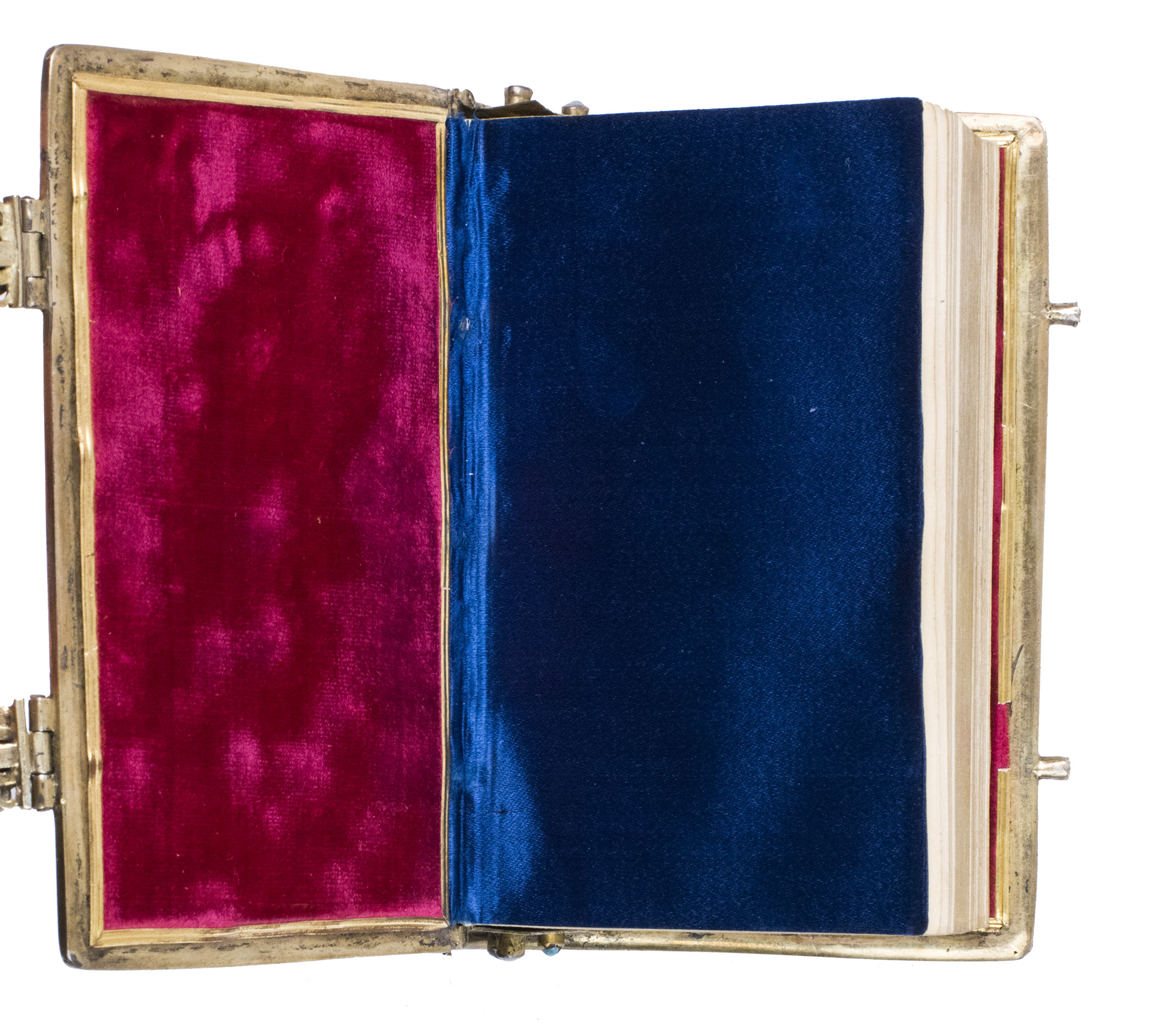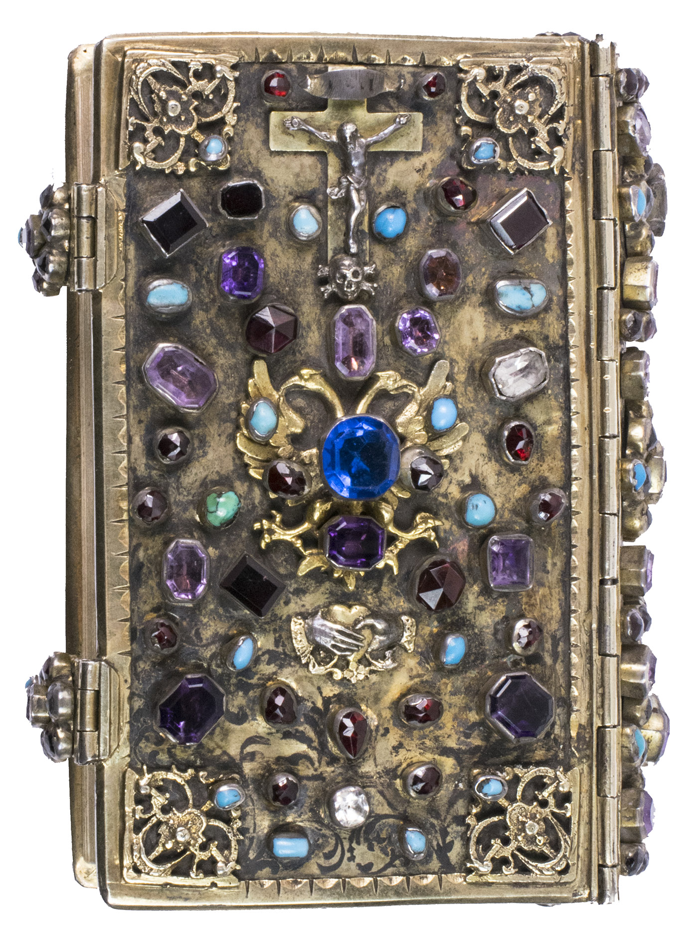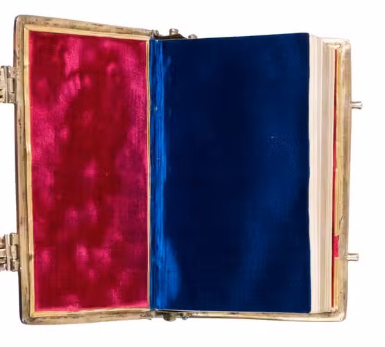 Lyon and Paris, Librairie Catolique de Perisse frères, 1844. 16mo. Binding: ca. 11 x 7 x 2.5 cm. With a small printer's device on the title page. 17th-century elaborately jewelled and decorated gilt silver binding with a gilt silver imperial double-headed eagle and two hands holding a heart centre piece, below Jesus on the cross (with an added skull and bones at the foot of the cross) and ornamental gilt silver corner pieces connected to the gilt silver board edge fittings on both boards. The whole is set with numerous jewels (amethysts, garnets, turquoise, and (simulated) sapphires). With two jewelled clasps closing on pegs in the fore edge of the front board, gilt edges, red velvet paste-downs and blue silk flyleaves backed with paper. VIII, 524, [5], [3 blank] pp.