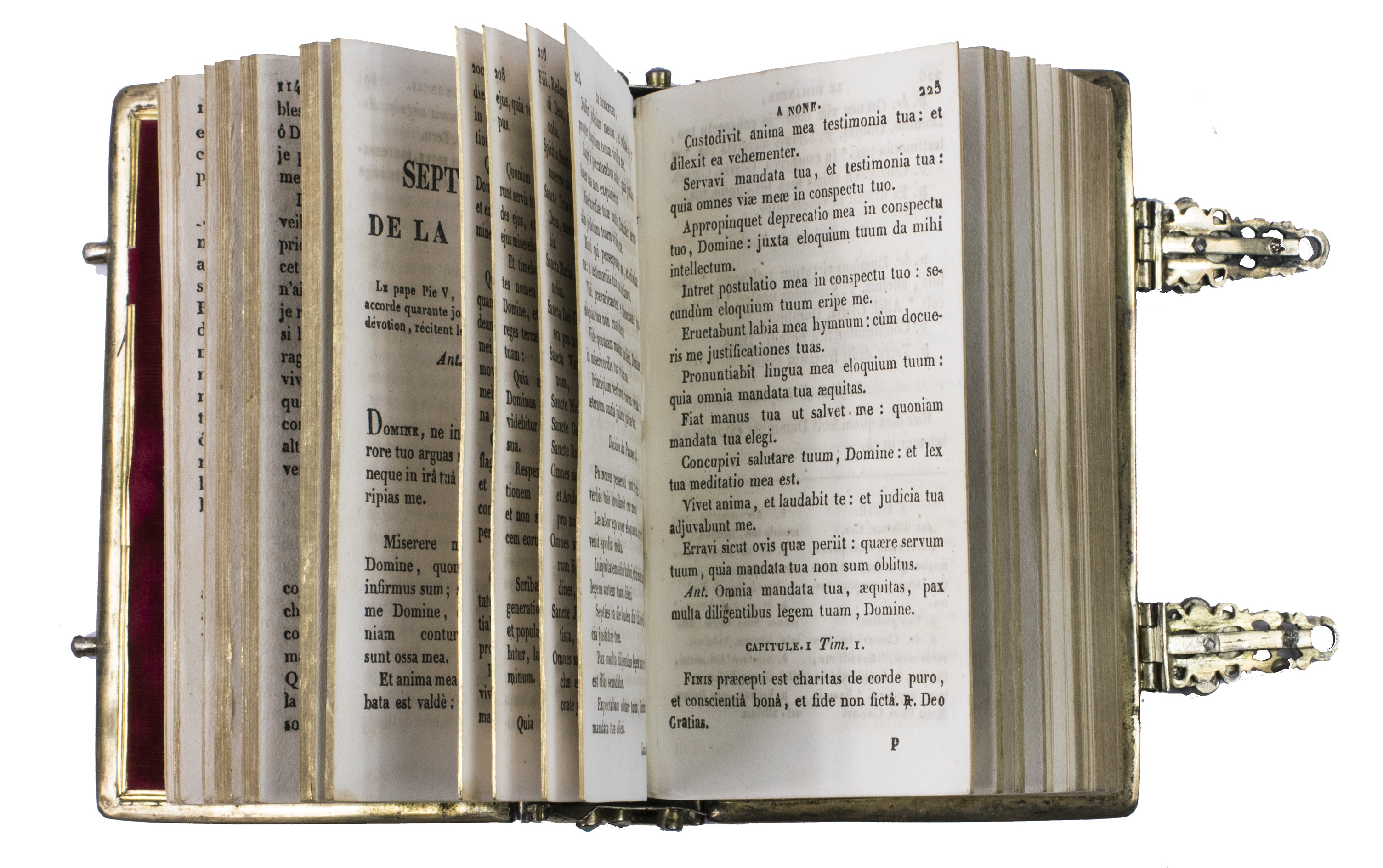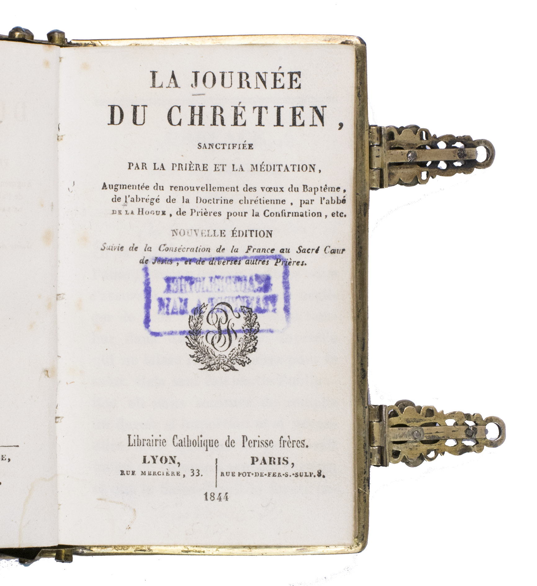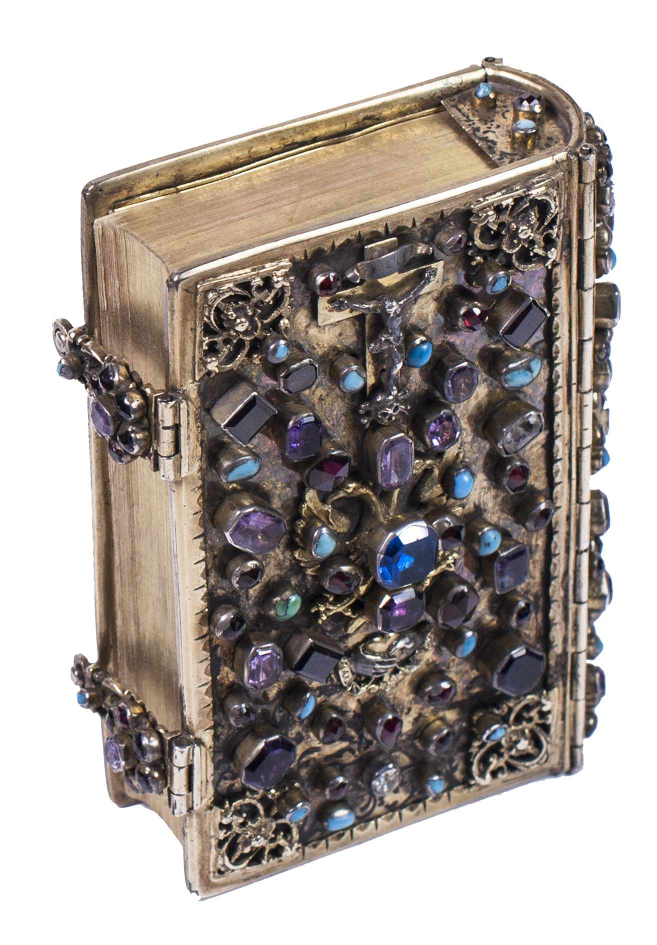 Lyon and Paris, Librairie Catolique de Perisse frères, 1844. 16mo. Binding: ca. 11 x 7 x 2.5 cm. With a small printer's device on the title page. 17th-century elaborately jewelled and decorated gilt silver binding with a gilt silver imperial double-headed eagle and two hands holding a heart centre piece, below Jesus on the cross (with an added skull and bones at the foot of the cross) and ornamental gilt silver corner pieces connected to the gilt silver board edge fittings on both boards. The whole is set with numerous jewels (amethysts, garnets, turquoise, and (simulated) sapphires). With two jewelled clasps closing on pegs in the fore edge of the front board, gilt edges, red velvet paste-downs and blue silk flyleaves backed with paper. VIII, 524, [5], [3 blank] pp.