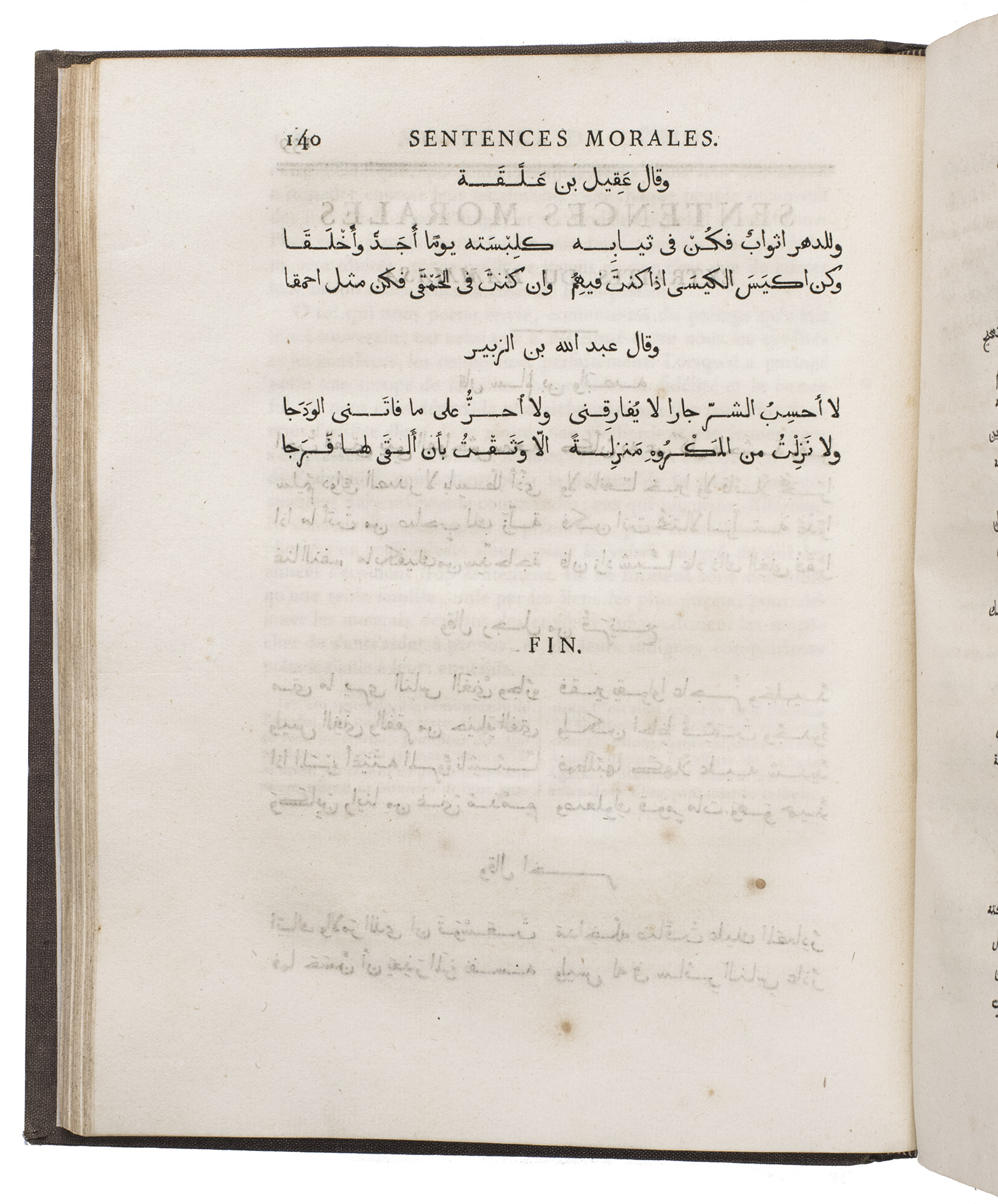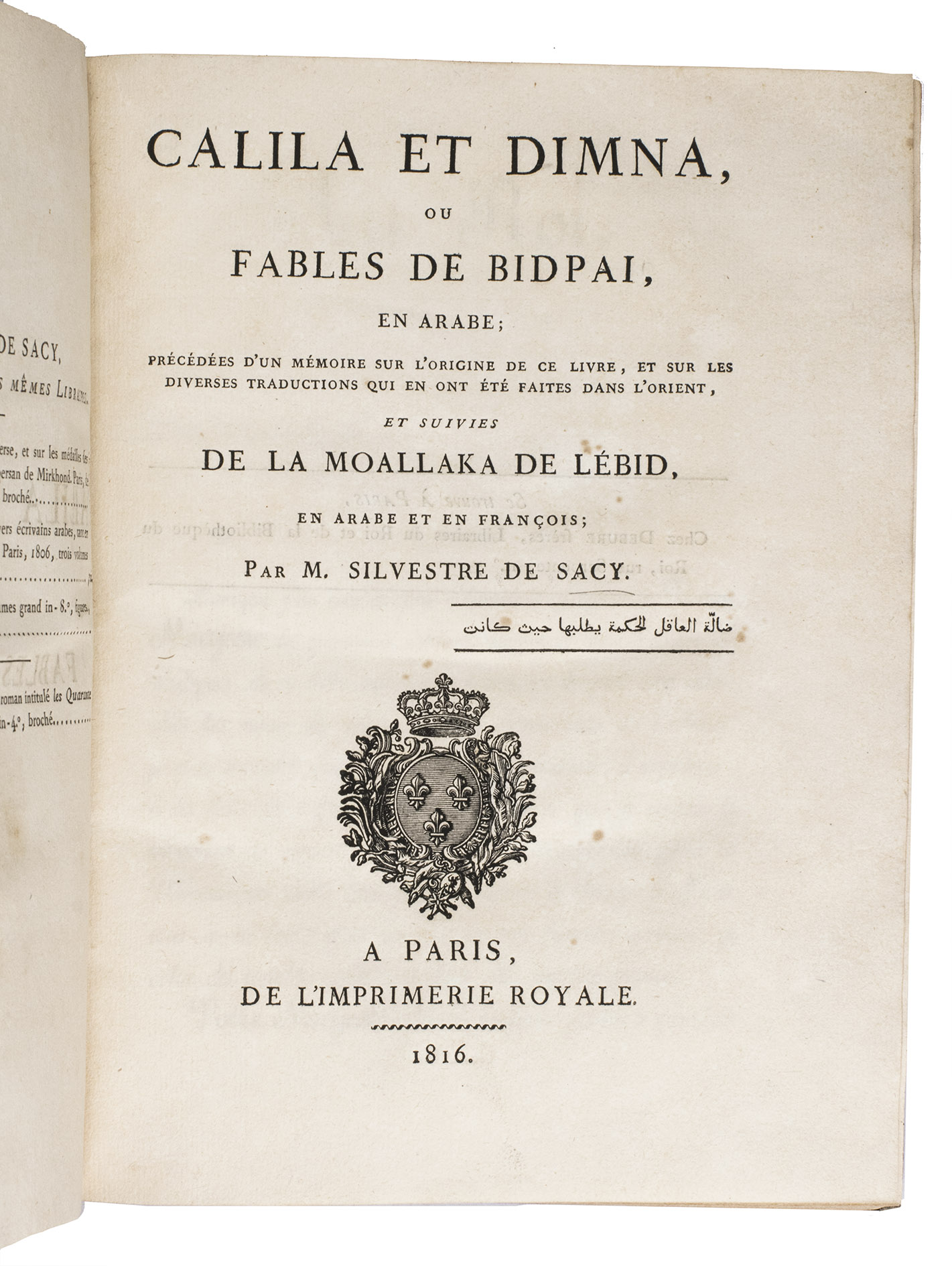The complete text of the Arabic version by Ibn al Muqaffa of this collection of animal fables with didactic overtones designed to illustrate wise conduct, printed in the beautiful types of the "Imprimerie Royale", with an introduction and critical notes in French. The typeface, based on Arab or Turkish specimens of calligraphy and cut in Rome in the early 17th century for Savary, "was the mainstay of Arabic typography in France until the late 19th century; it also provided a model for others" (Roper, p. 145).