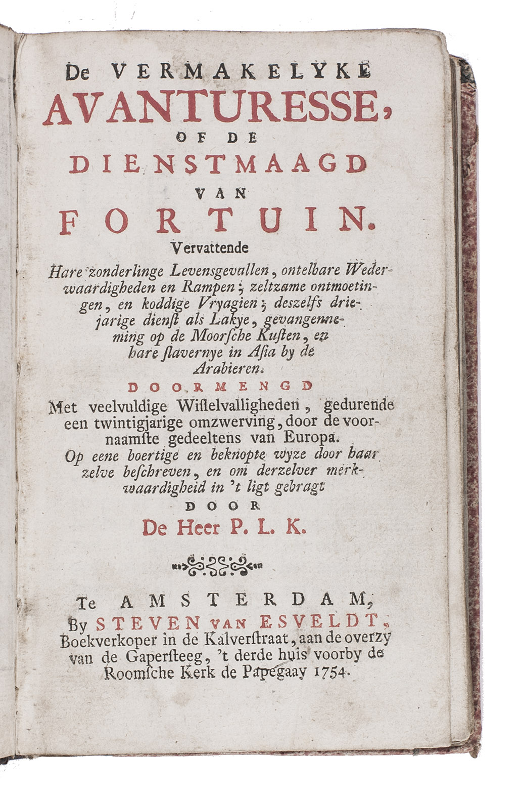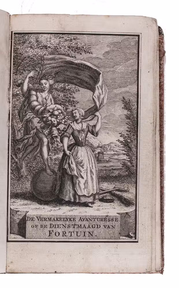 Very rare first edition of a Dutch picaresque novel telling the story of the girl Janneton, who was born in Brussels and moved with her parents to Amsterdam when she was 9. When she was around 16 she made plans to leave town with her lover, Charles, after being frequently beaten by her father. Unsurprisingly her father didn't agree and put her away in a monastery. After several months she fled the monastery with her lover only to be raided by bandits, and Charles was killed. Janneton ended up on her own, travelled through Europe and eventually reached Cartagena, Spain, where she took a ship back to the Netherlands. During her voyage the ship got caught in a storm and ended up in front of the north African coast where it was captured by African pirates. Janneton was soon sold to an Arabic slave trader, with whom she got along very well. They travelled together through Africa and Asia, before ending up on his estate in Arabia. Eventually she managed to get back her freedom and travelled back to the Netherlands, where found Charles still alive.