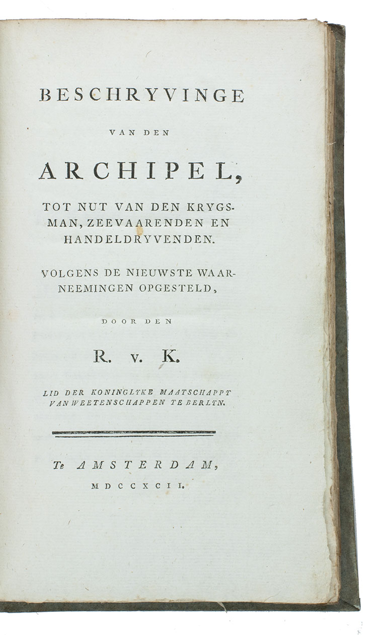 Rare first Dutch edition of a detailed account of the Greek islands (the first edition to include the sea chart), by the great Dutch-German Admiral and naval strategist Kinsbergen, known as the Hero of the Black Sea for his successes in battles against the Turks in the 1770s. He gives a detailed description of the region, island by island, with the emphasis on navigation along the coasts, but also with information on fortifications. The book is explicitly directed to military men, seamen and merchants active in the area, and expresses the hope that political changes may in the future lift these islands out of their present state.