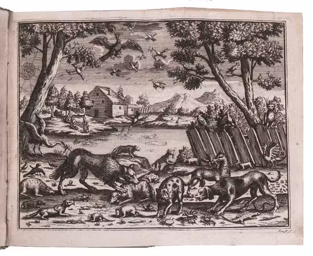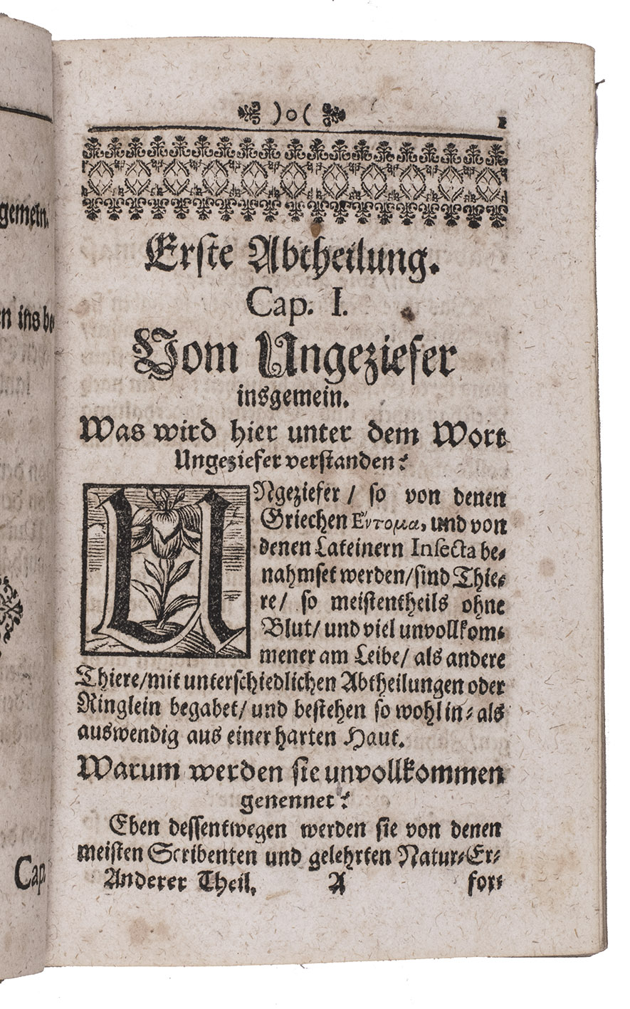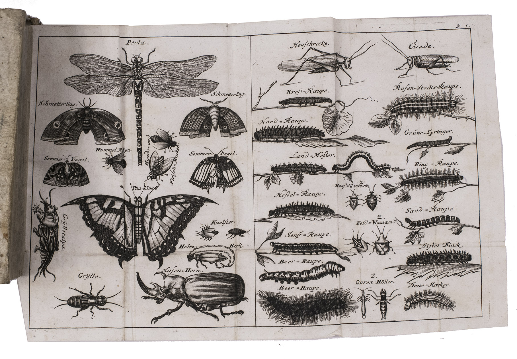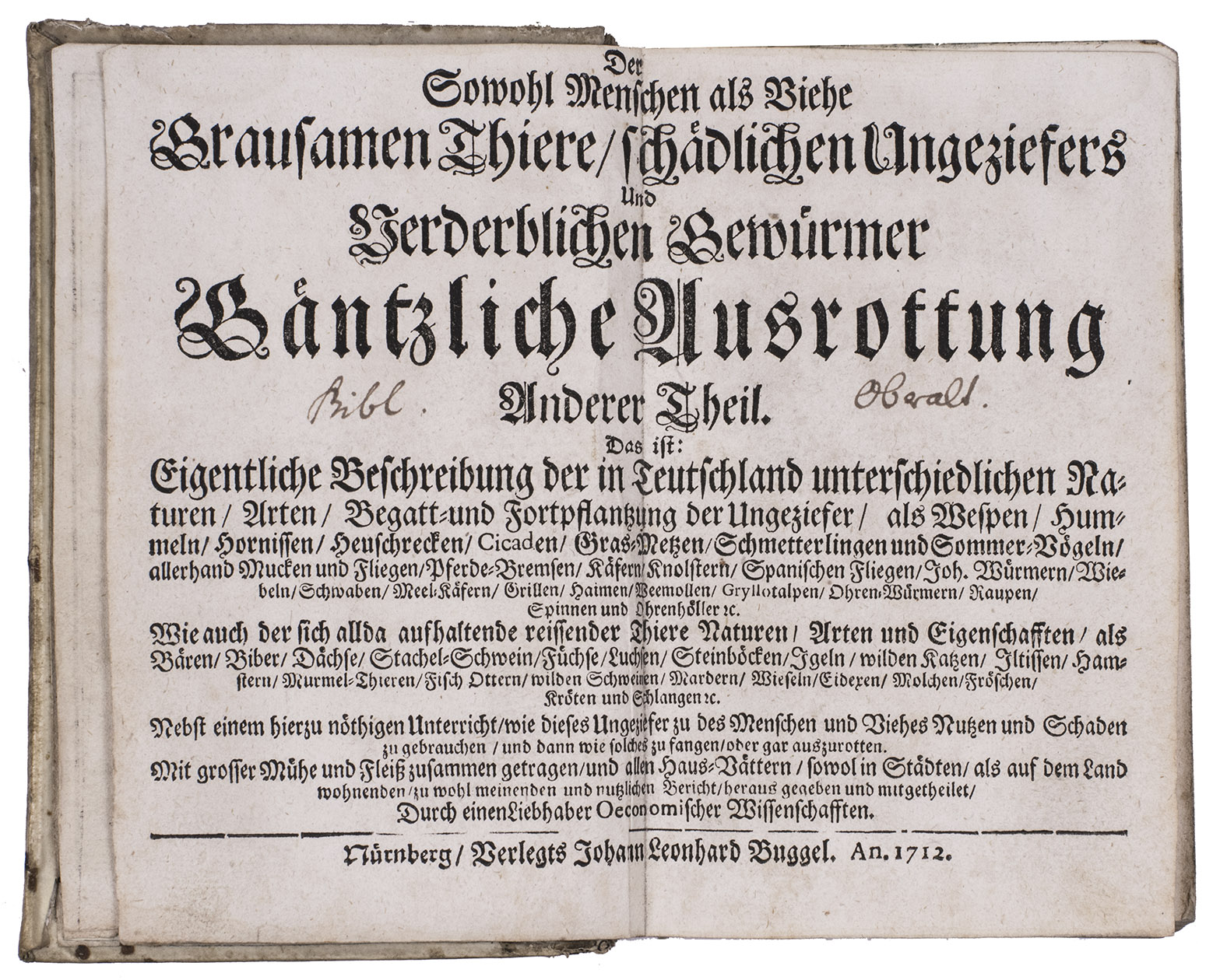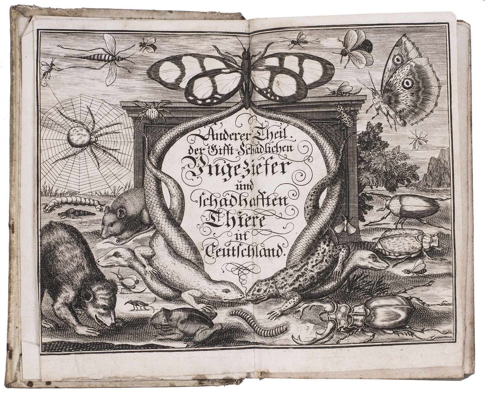 First edition, rarely found complete, of a detailed account of animals that are harmful to people and to their livestock, the treatment of bites, illnesses and poisonings they cause and instructions for their extermination. It covers animals on land, in water, in the air and underground. The large folding plate in vol. II shows 38 insects, including 14 caterpillars, and the two engraved title-pages for volumes I and II show well over 50 (vol. I) about 25 (vol. II) animals, not counting a large group of ants and many birds in the distance in the former. The book also provides information about uses of the (dead) harmful animals for making clothes and medicines, and includes many medicinal recipes. The animals discussed include wolves, foxes, mad dogs, birds (including birds of prey), snakes, frogs, toads, rats, mice, moles, beetles, caterpillars, bed bugs, lice, fleas and other insects, spiders, snails and other molluscs, various kinds of worms and even a dragon and basilisk (the latter illustrated in the engraved title-page to volume I: it looks more cock-like than snake-like, so most people would now call it a cockatrice, but the two have long been used almost interchangeably). Krafft notes that dragons are rarely or never found in Germany but says one was found in Bohemia a few years ago and that they are more common in Nubia, Libya and the largest ones in "Indien", probably meaning the East Indies and perhaps based on reports of the Komodo dragon.