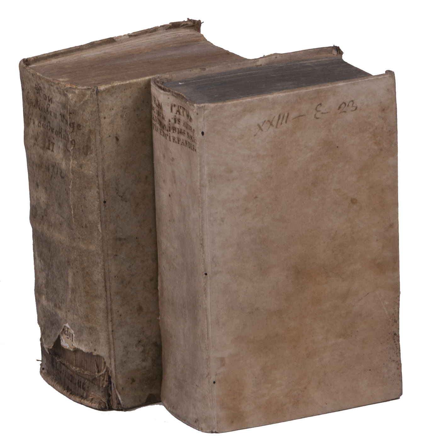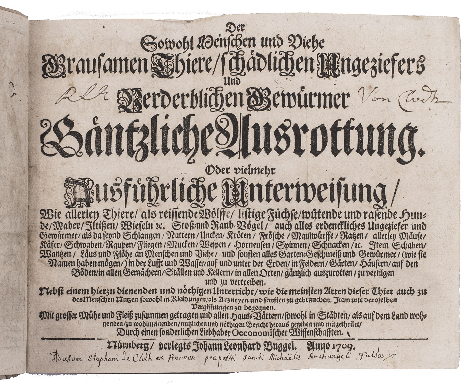 With an owner's inscription of Stefan von Clodt (1674-1737), Vicar General and Provost of Michaelsberg in Fulda, on the title-page of vol. I. Somewhat browned (vol. I only slightly) and with an occasional small stain, but still in good condition. The binding of vol. I is in very good condition, with only a few small worm holes in the hinges; vol. II is rubbed and damaged, lacking the lowest 3 cm of the backstrip. A very detailed source of information on animals regarded as pests, from both a medical and a farming and gardening perspective. Lindner, Jagdliteratur 11.1171.01 & 11.1173.01; VD18 11041935 (= 90643208 & 90643224); cf. Horn & Schenkling 12340 (with 1713 ed. of vol. I).