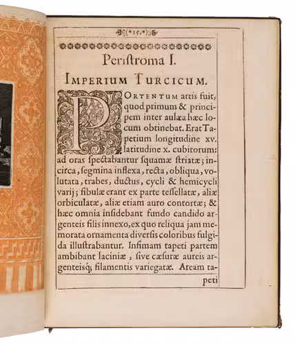 Rare first and only Latin editions (probably the first and only early editions in any language) of four closely related polemical pamphlets on European policy toward the Ottoman Empire. The publication was instigated by the prominent Nürnberg poet and jurist Georg Philipp Harsdörffer (1607-1658), who somehow got access to the French manuscripts of the pro-Richelieu Peristromata Turcica (Turkish carpets), and the anti-Richelieu Gallia deplorata, translated them into Latin, edited them for publication and added what is believed to be his own anti-French Latin rebuttal of the former, Germania deplorata. On 26 November 1641 he sent all three to the Calvinist Prince Ludwig of Anhalt-Köthen, founding president of the Fruchtbringende Gesellschaft in Weimar, who found the Peristromata Turcica shocking and dangerous, not only for its content but also because its remarkable and "seductive" graphic form. At a spring 1642 meeting of the society Ludwig initiated the writing and production of an emblematic rebuttal, the Aulaea Romana (Roman tapestries). Besides the political importance of these pamphlets as records of differing European attitudes toward the Ottoman Empire, they are remarkable graphic and typographic artefacts, early examples of colour printing and important emblemata.