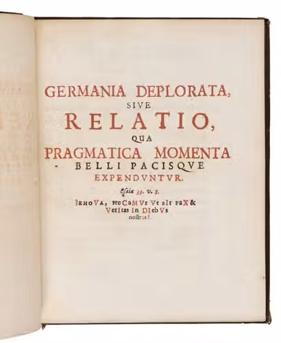 (2) [HARSDÖRFFER, Georg Philipp]. Germania deplorata, sive relatio, qua pragmatica momenta belli pacisque expenduntur.