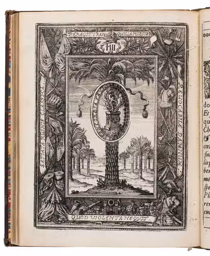 [Nürnberg, Wolfgang Endter] (ad 1 with a false colophon: Paris, Toussaint du Bray), [each title-page with a chronogram:] 1641 (ads 1-2, 4) & 1642 (ad 3). 4 editions published together in 1 volume. 4to. With 4 letterpress title-pages in red and black, each with the date in a chronogram, 2 engraved title-plates plus 12 full-page engraved emblematic illustrations, all on integral leaves, each with a small plate nested in a larger plate (7 in the Peristromata with a varying rectangular central plate in dark blue or black and the same outer plate of a Persian carpet in orange; 7 in the Gallia with a varying oval central plate and the same outer plate representing peace with the palm tree in a landscape device of the Fruchtbringende Gesellschaft and a border representing war with military attributes). Further with 5 woodcut head- and tailpieces (plus 8 repeats), 21 "woodcut" decorated initials (5 series, at least some actually metal castings made from woodcuts) plus 8 repeats, and cast vine-leaf ornaments, acorns and other fleurons. Set in roman and italic types with incidental Greek and Hebrew. Light brown calf (ca. 1820?) by Charles Murton (ca. 1795?-ca. 1860?) in London, with his stamp on the front paste-down, sewn on 5 cords, gold-tooled spine with black morocco label, gold thick-thin fillets on boards, gold-tooled board edges, blind-tooled turn-ins, curl-marbled endpapers (white, red, blue, yellow and blue-green in that order), and an orange silk ribbon marker. 46, [1], [1 blank]; [3], [1 blank], 34; 64; 51, [1 blank] pp.