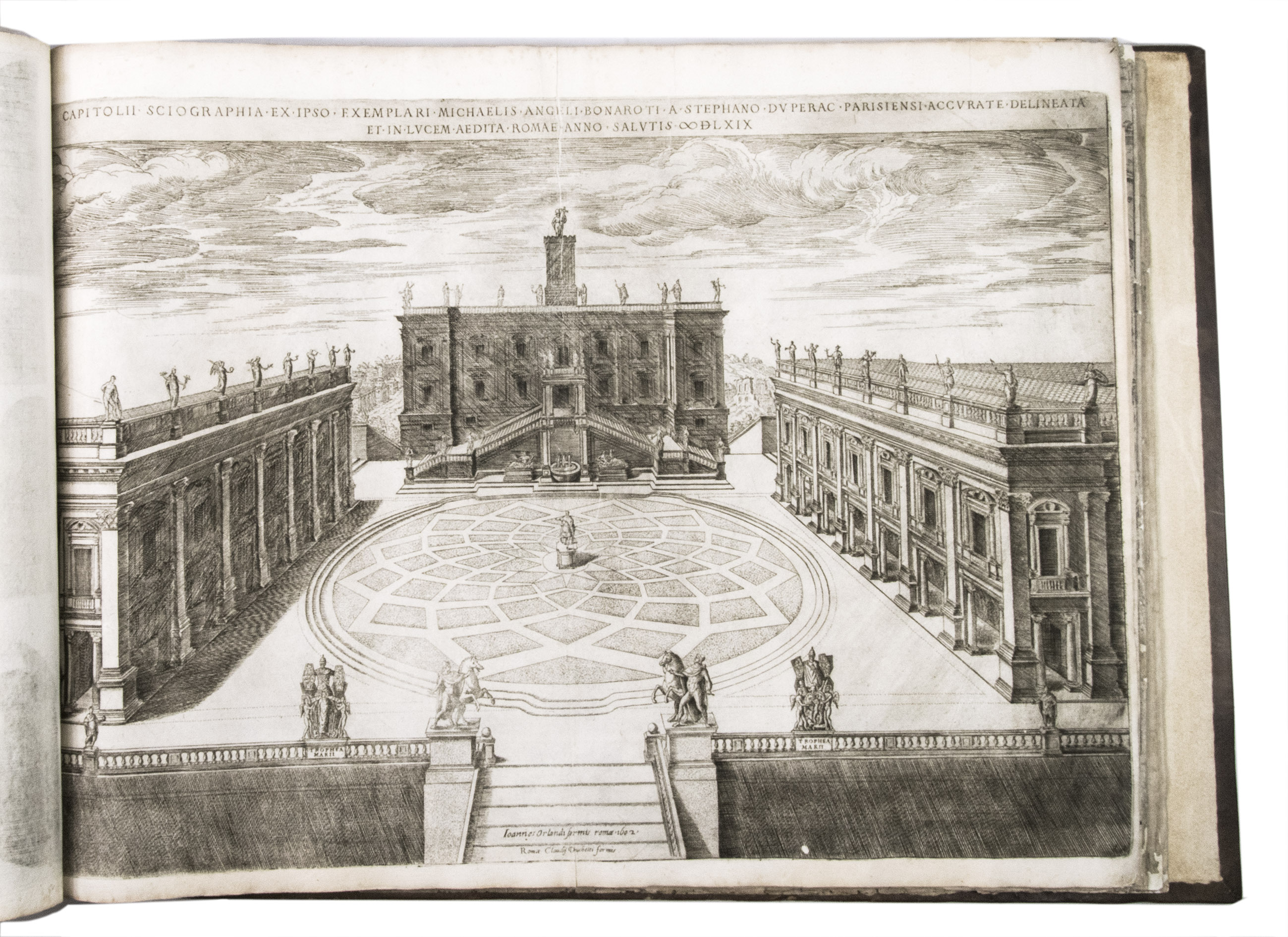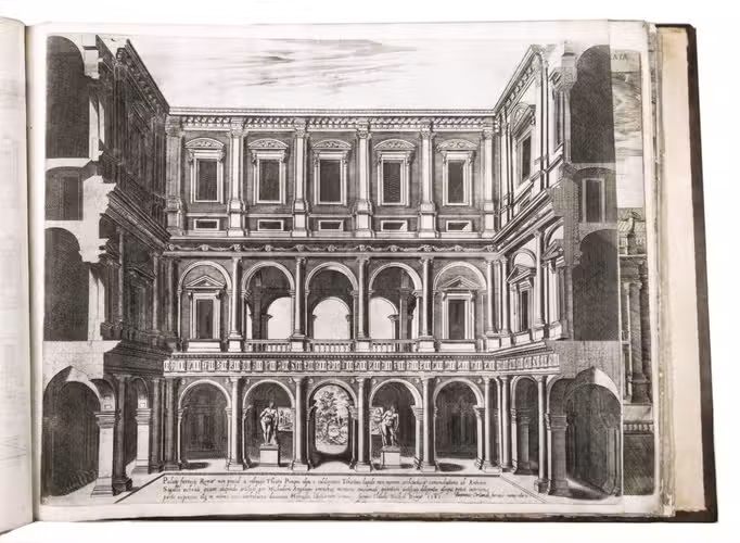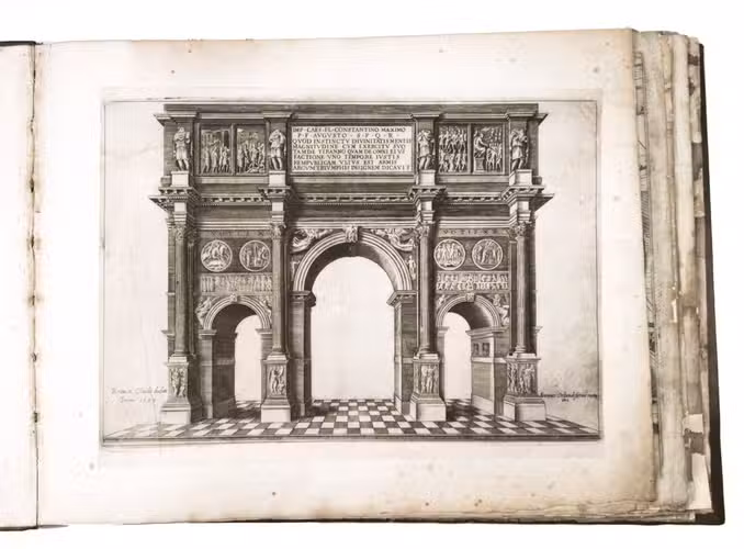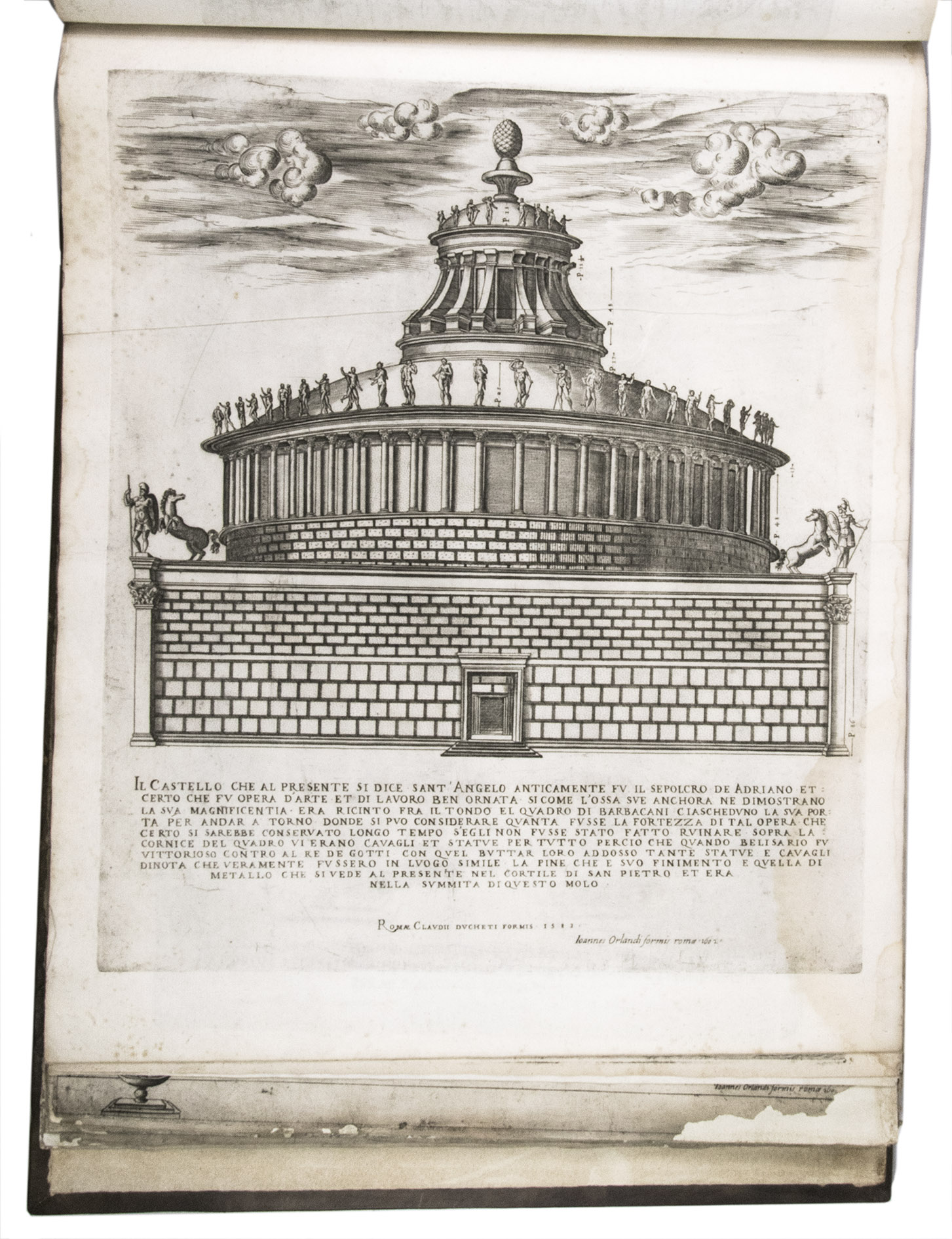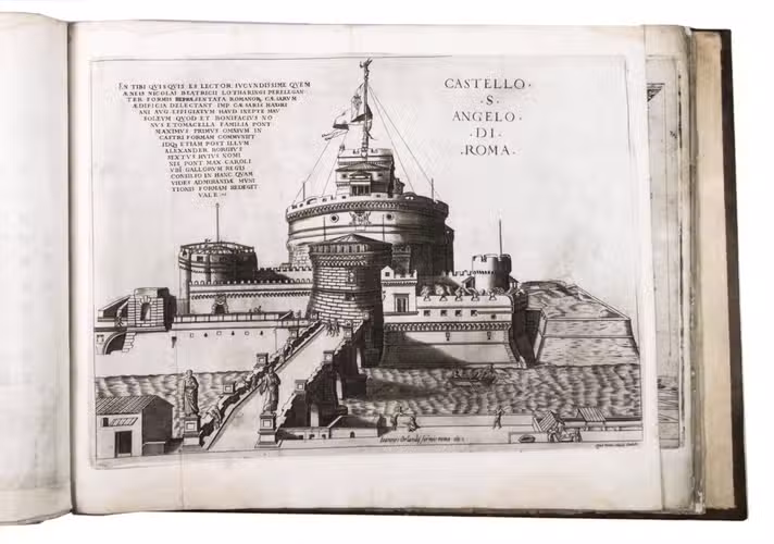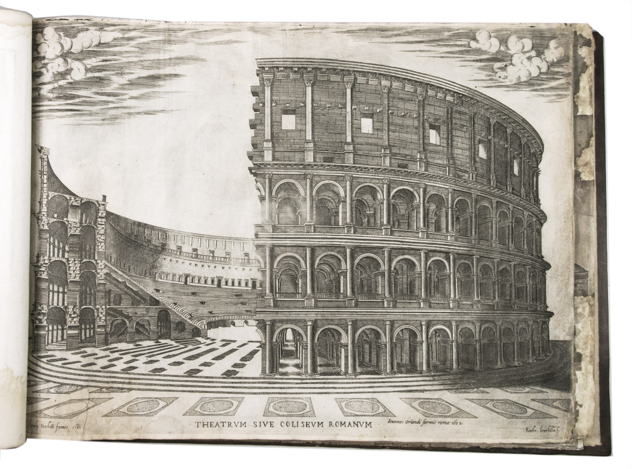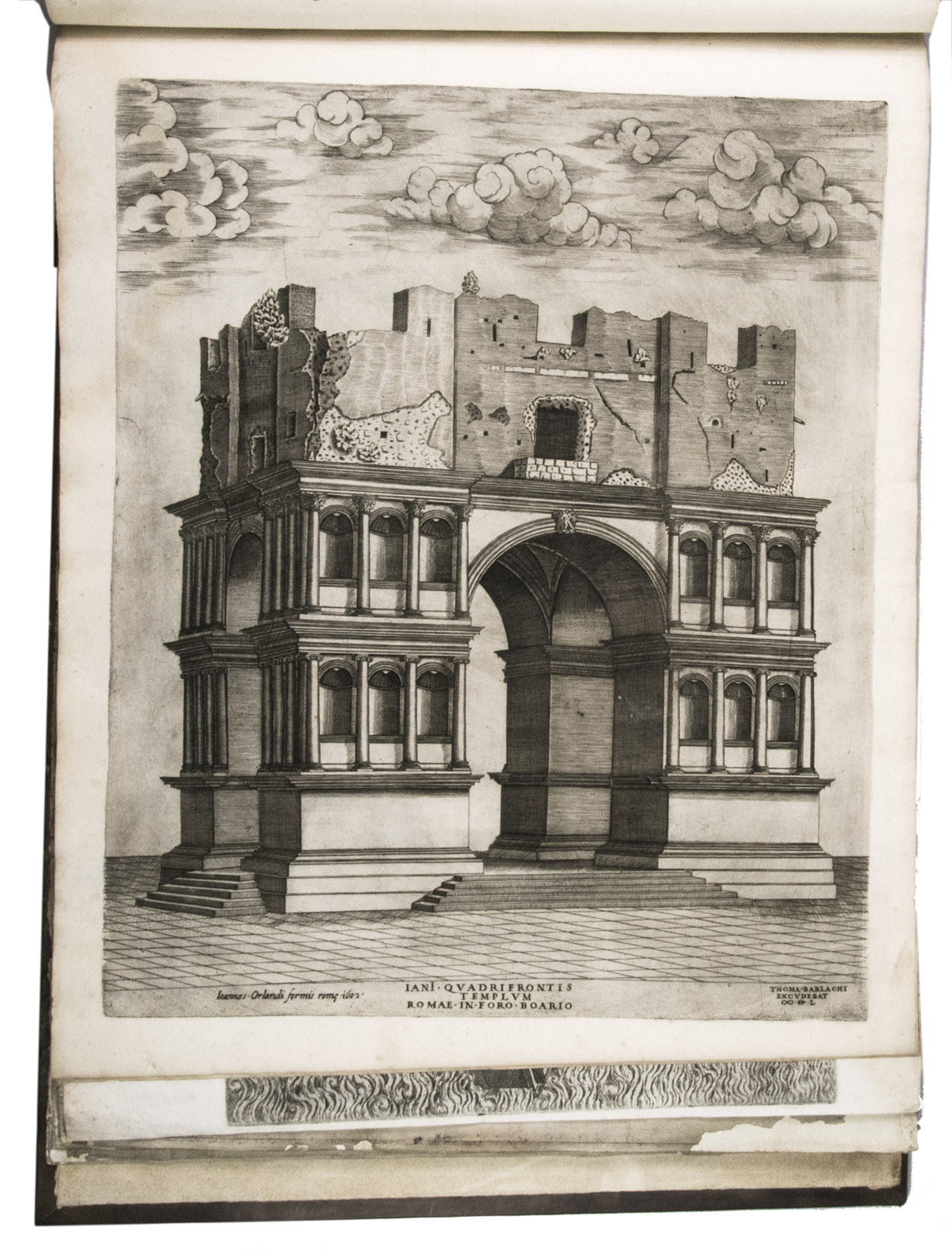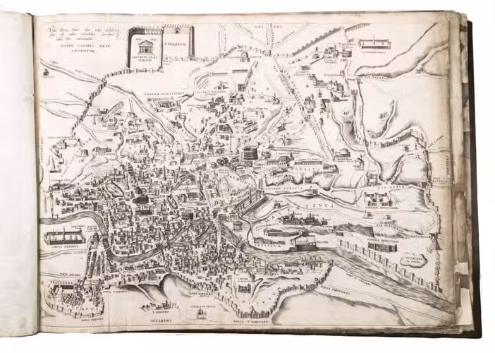 In the middle of the 16th century, Italy was the centre of map production and distribution in Europe. This industry primarily took place in Venice and Rome. The most notable of the publishers in Rome was Lafreri. His most important and most popular work is the Speculum Romanae magnificentiae, a collection of plans an views of Rome's monuments; no two copies of the Speculum are the same. The present collection contains more than thirty plates from the Speculum. When Lafreri died, his nephew Claudio Duchetti inherited the company. He continued to produce the Speculum plates, but often made small adjustments, and signed his own name at the bottom. Most of the Speculum plates in the present album are by Duchetti. After his death, the copperplates were sold to other publishers, such as Giovanni Orlandi (before 1590-after 1640), who reissued them. The majority of the plates in the present album were printed by Orlandi in 1602.