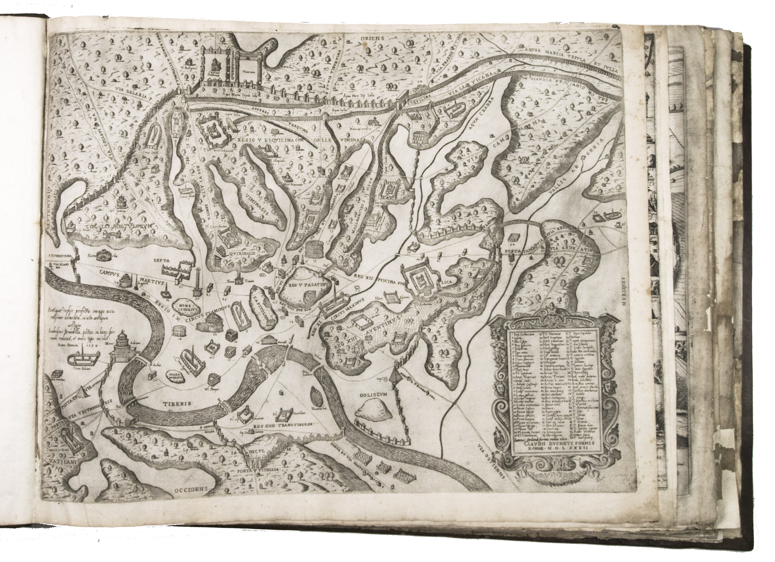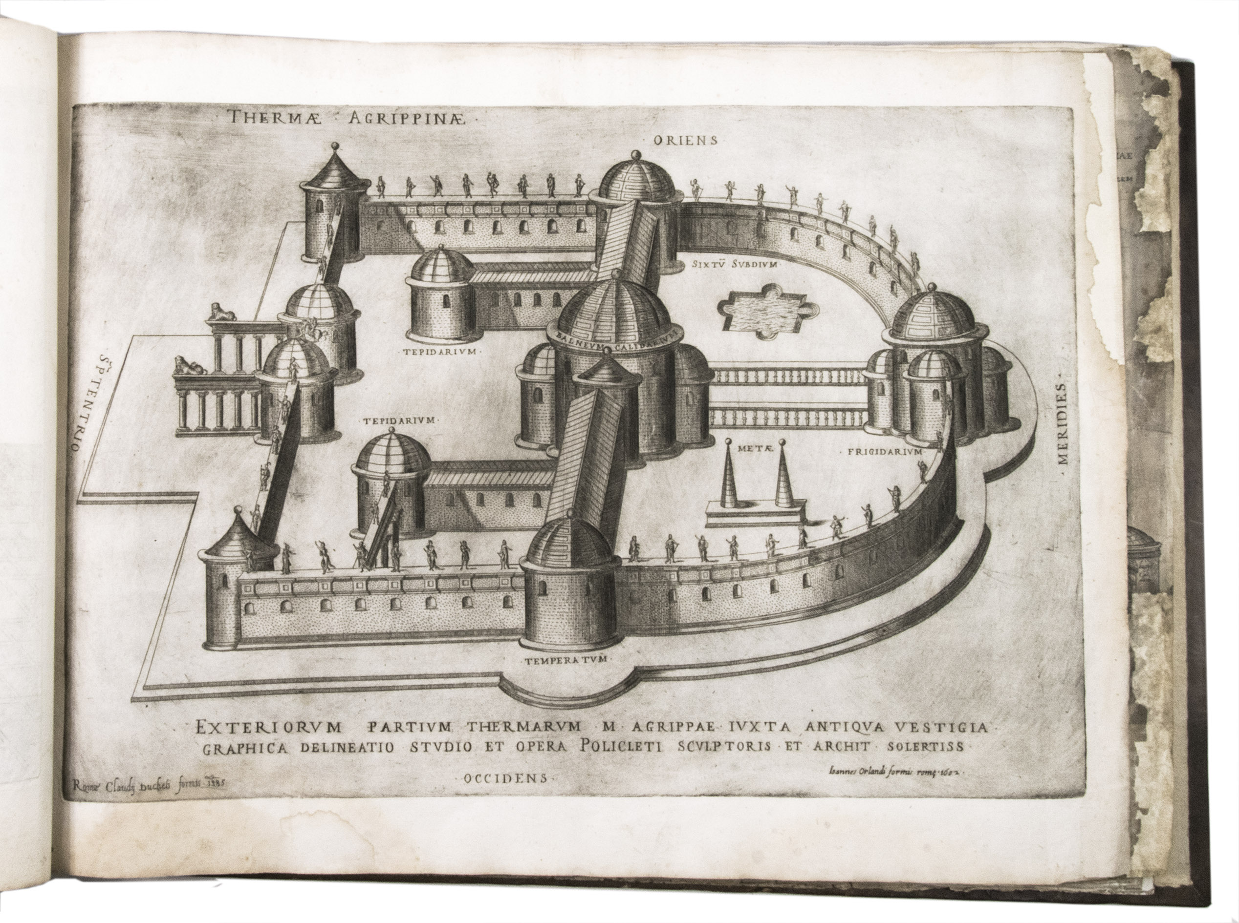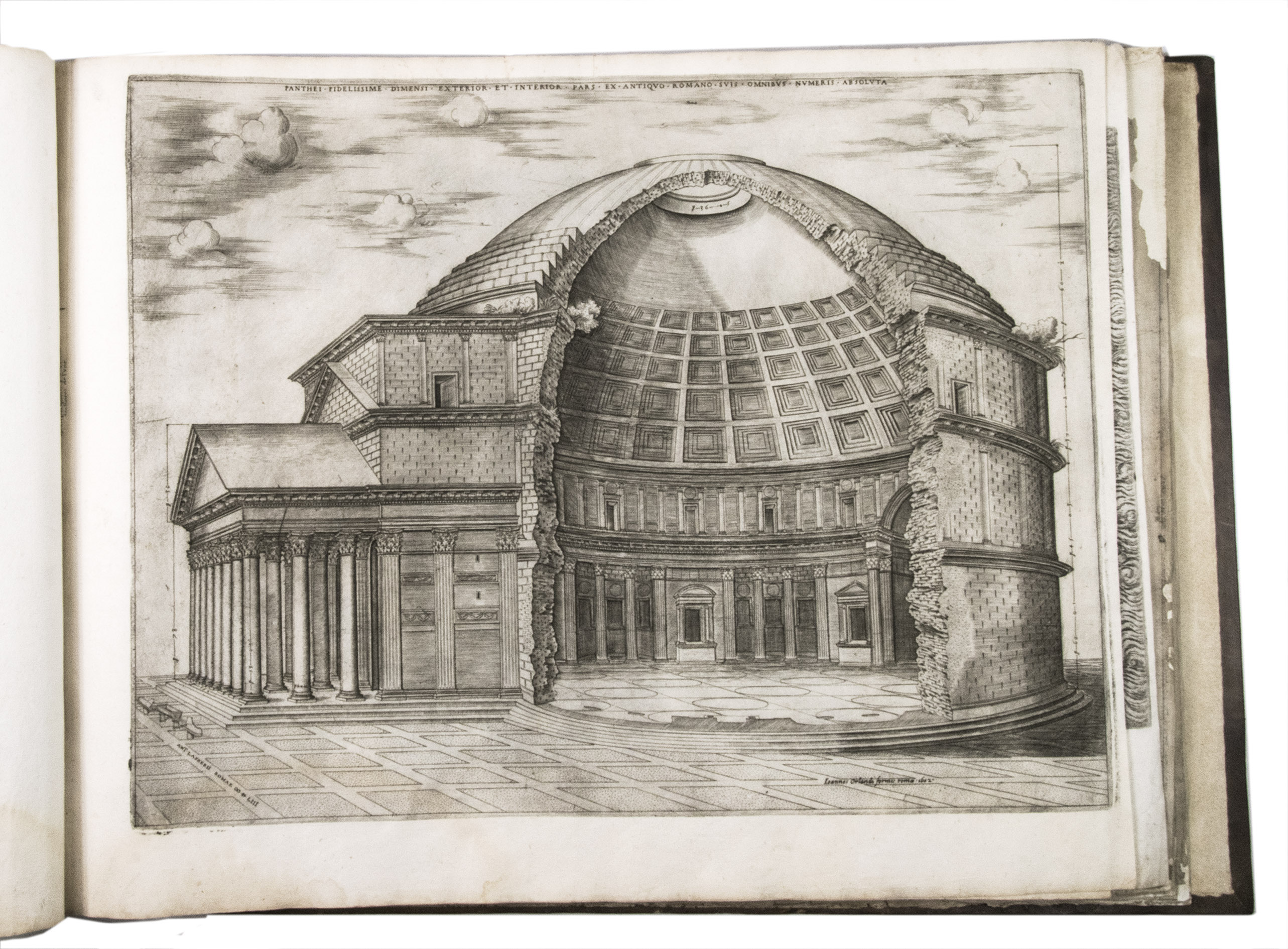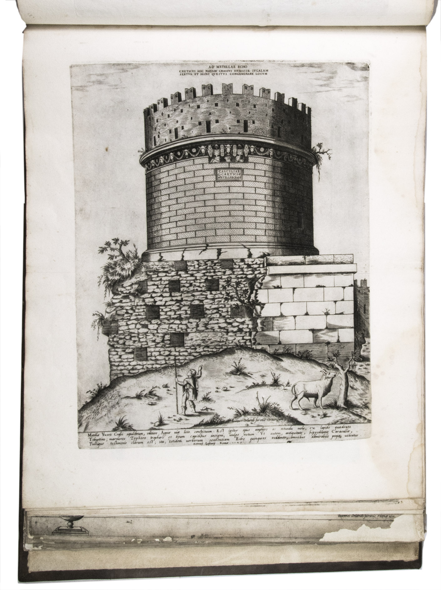 In the middle of the 16th century, Italy was the centre of map production and distribution in Europe. This industry primarily took place in Venice and Rome. The most notable of the publishers in Rome was Lafreri. His most important and most popular work is the Speculum Romanae magnificentiae, a collection of plans an views of Rome's monuments; no two copies of the Speculum are the same. The present collection contains more than thirty plates from the Speculum. When Lafreri died, his nephew Claudio Duchetti inherited the company. He continued to produce the Speculum plates, but often made small adjustments, and signed his own name at the bottom. Most of the Speculum plates in the present album are by Duchetti. After his death, the copperplates were sold to other publishers, such as Giovanni Orlandi (before 1590-after 1640), who reissued them. The majority of the plates in the present album were printed by Orlandi in 1602.