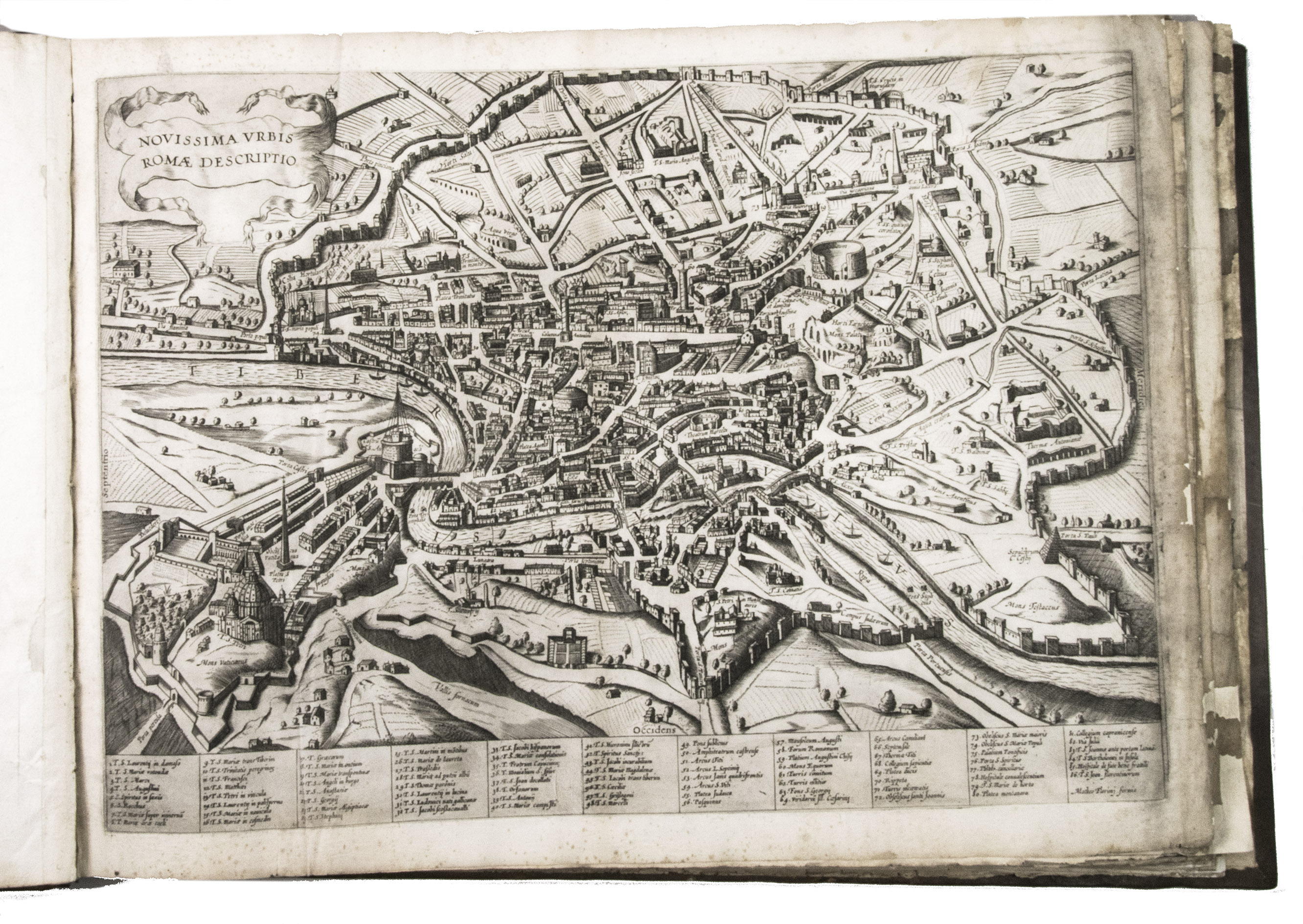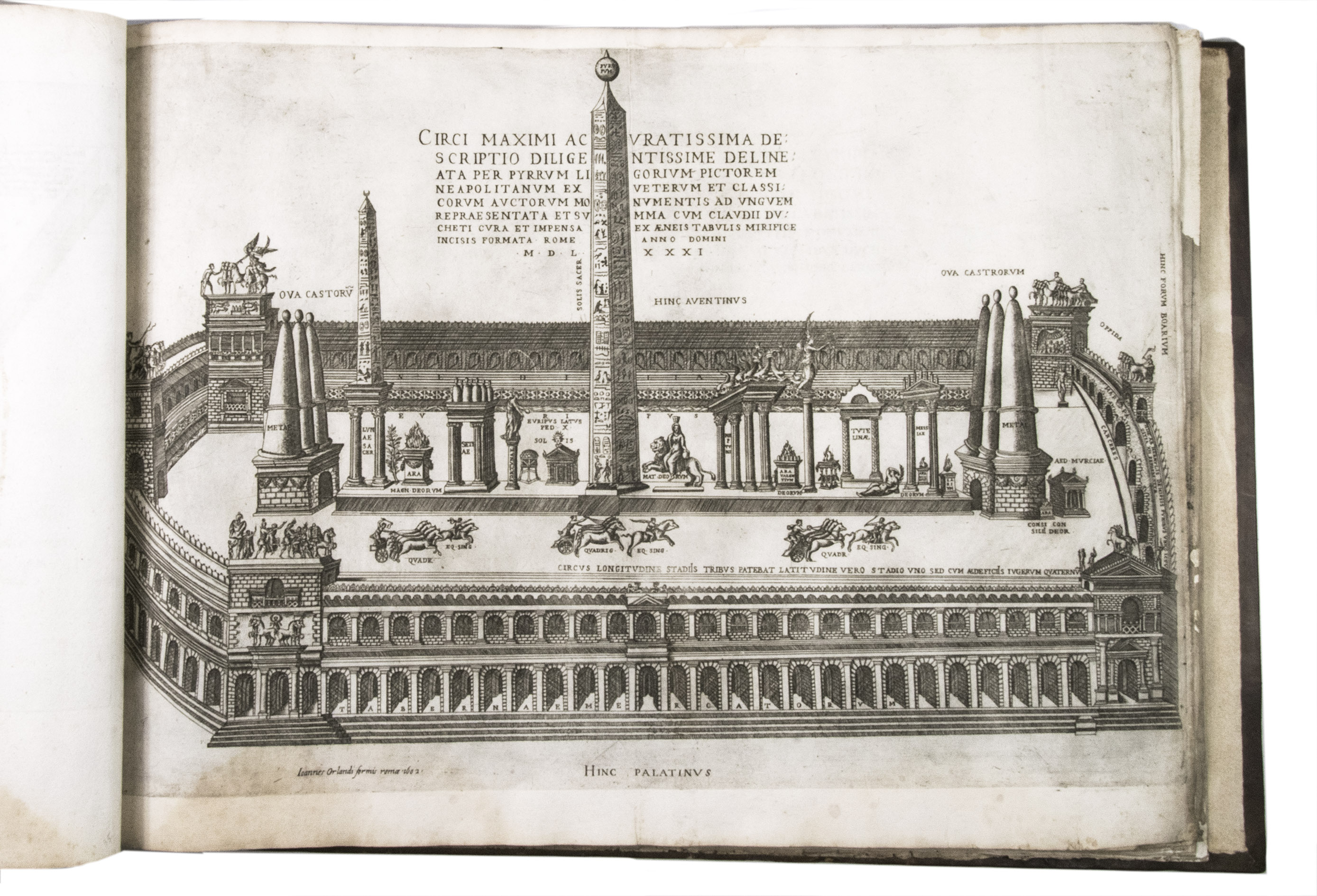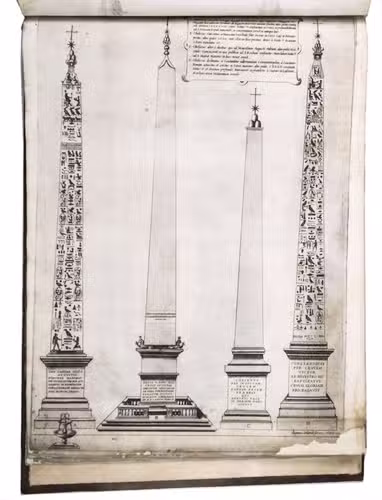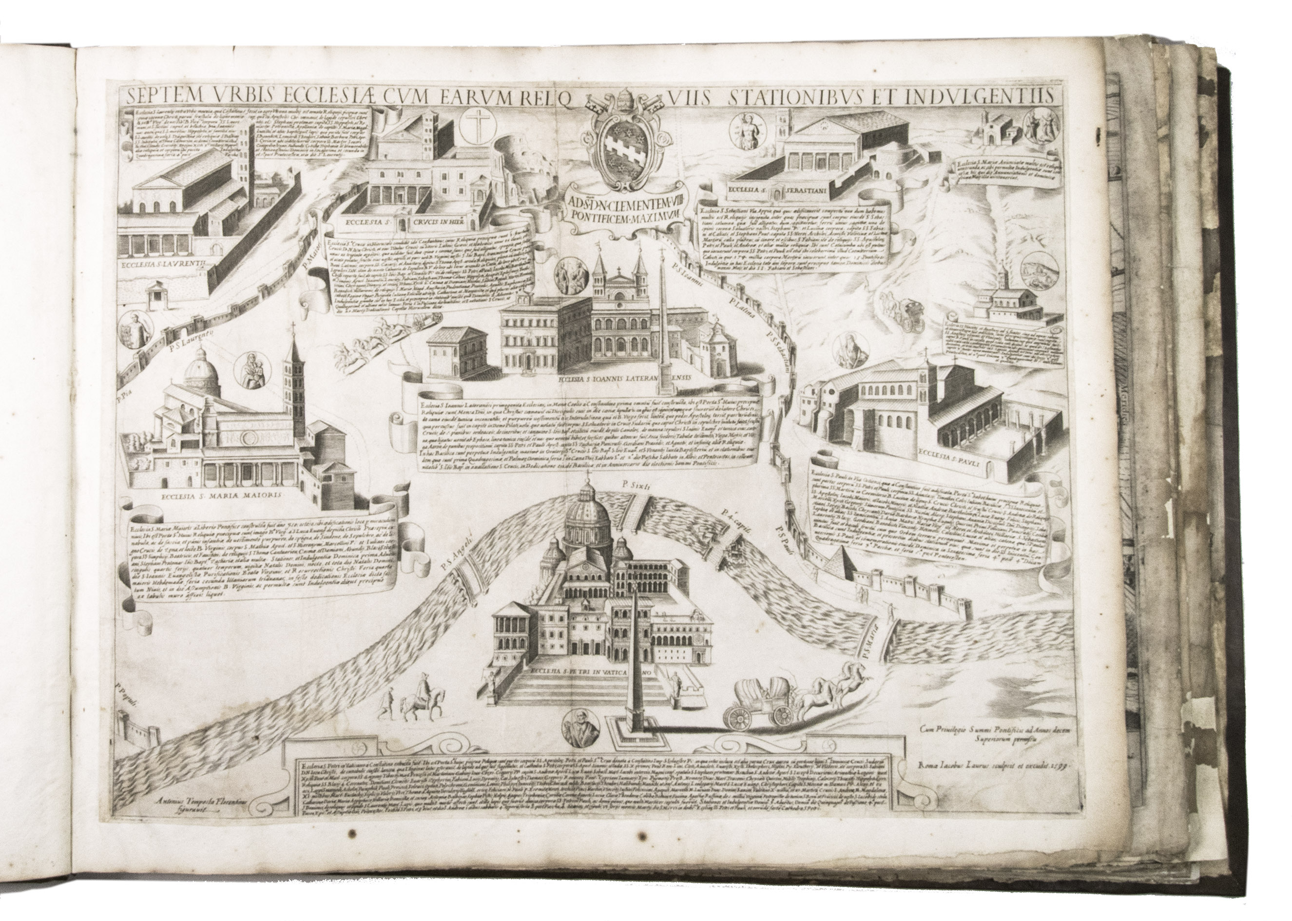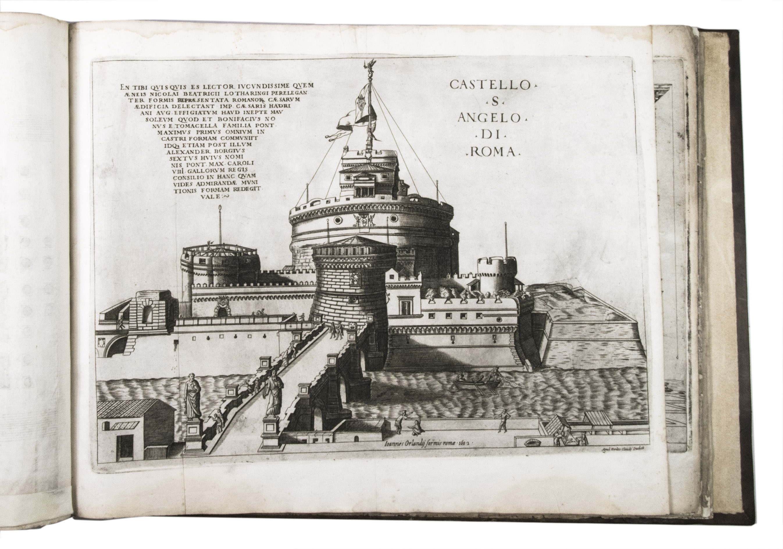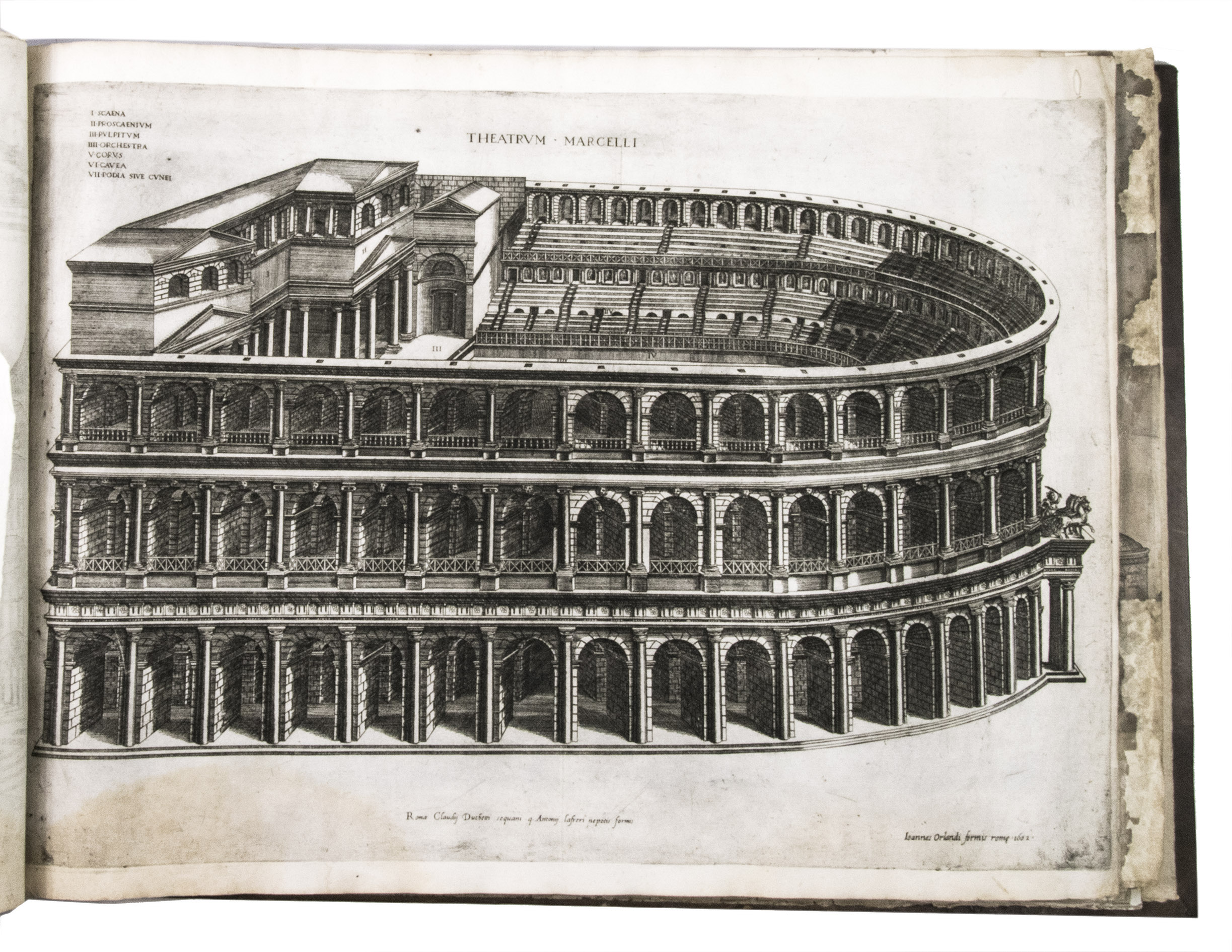 In the middle of the 16th century, Italy was the centre of map production and distribution in Europe. This industry primarily took place in Venice and Rome. The most notable of the publishers in Rome was Lafreri. His most important and most popular work is the Speculum Romanae magnificentiae, a collection of plans an views of Rome's monuments; no two copies of the Speculum are the same. The present collection contains more than thirty plates from the Speculum. When Lafreri died, his nephew Claudio Duchetti inherited the company. He continued to produce the Speculum plates, but often made small adjustments, and signed his own name at the bottom. Most of the Speculum plates in the present album are by Duchetti. After his death, the copperplates were sold to other publishers, such as Giovanni Orlandi (before 1590-after 1640), who reissued them. The majority of the plates in the present album were printed by Orlandi in 1602.
