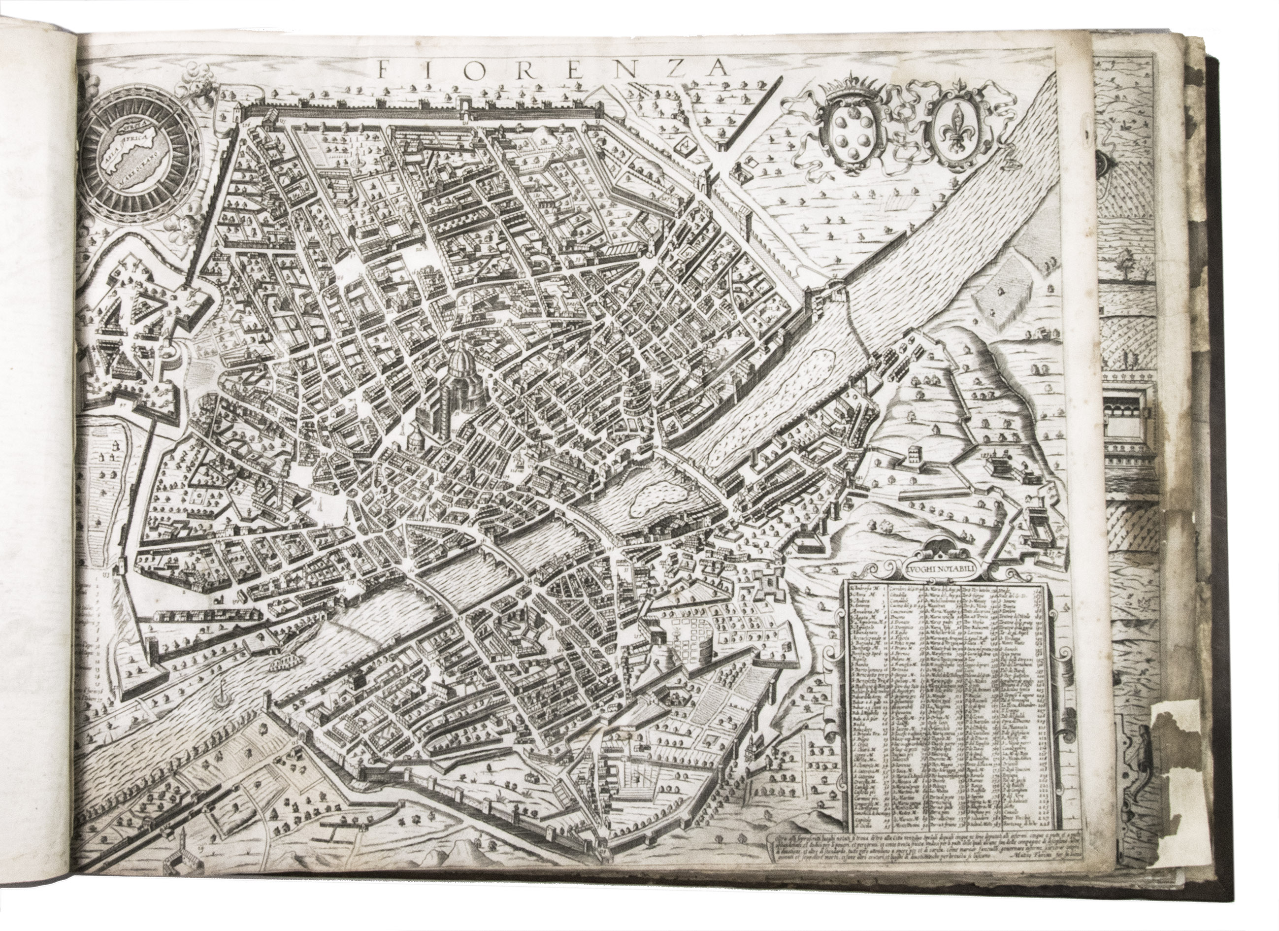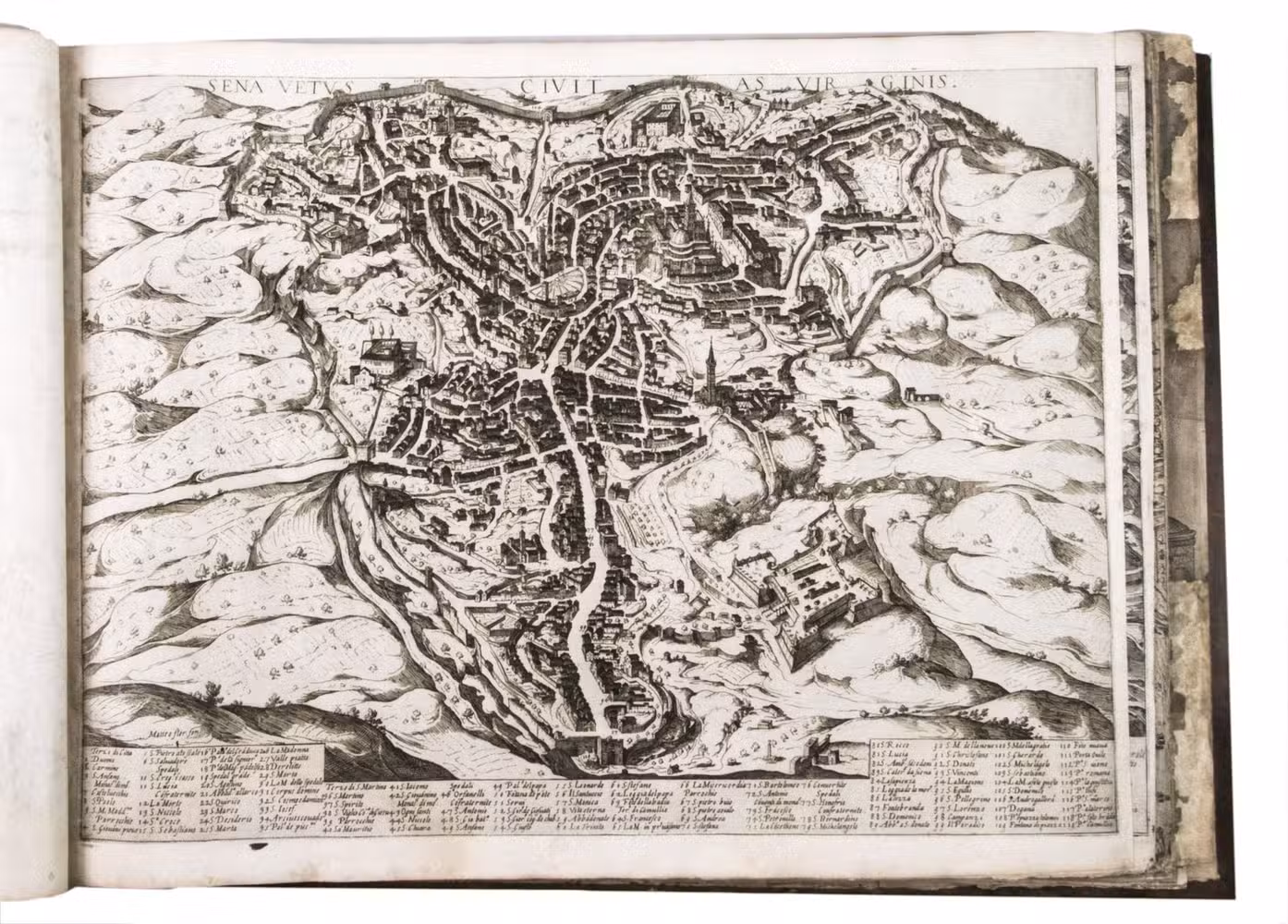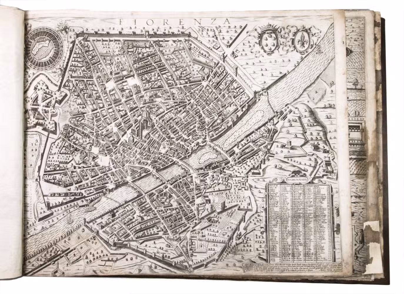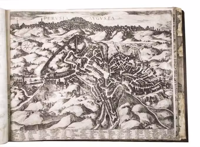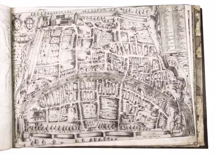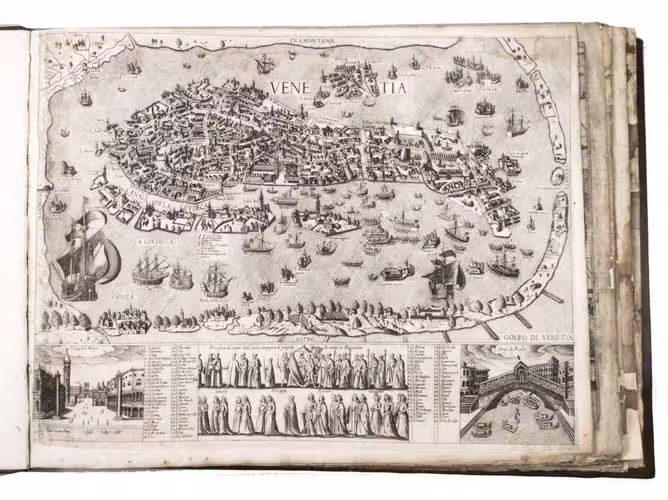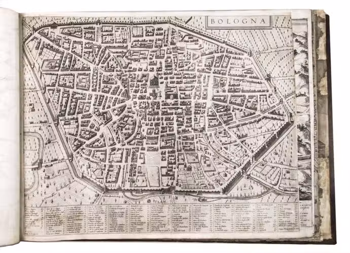 Remarkable album with 77 beautiful examples of 16th-century Italian cartography, all in very fine dark impressions. The collection includes plans of important Italian towns, such as Rome, Venice, Genoa, Naples, Milan, Florence, Palermo, Siena, Bologna, and Pisa, as well as detailed views of individual buildings and monuments in Rome. They are engraved by several cartographers from the school of Antonio Lafreri (1512-1577), primarily Claudio Duchetti (d. 1585), Matteo Florimi (d. 1613), and Lafreri himself. Florimi's works are among the rarest of the Lafreri school map makers, especially his Siena imprints, of which several have here been included.