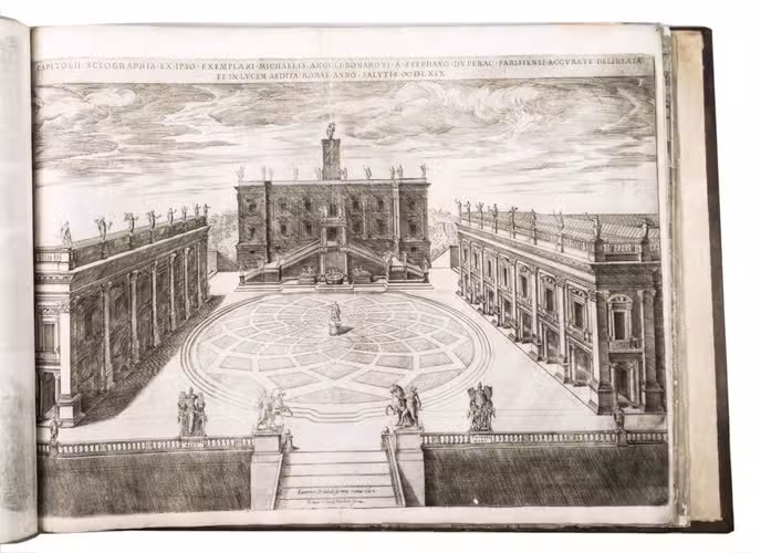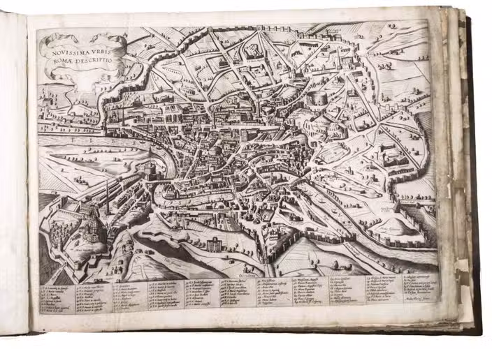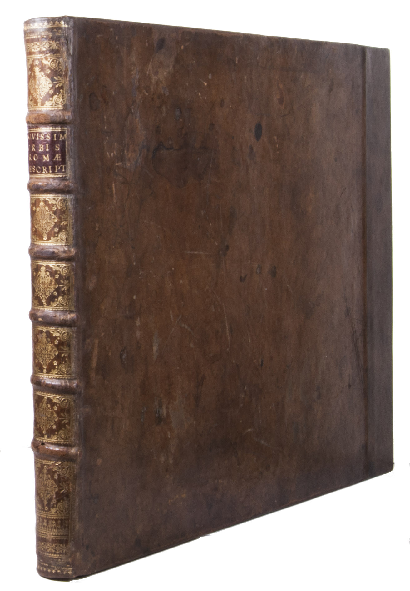 [Italy, late 16th and early 17th century]. Large oblong folio (ca. 59 x 42.3 cm). With 76 full-page engravings, and 12 full-page etchings. 17th-century gold-tooled brown calf, sewn on 6 supports with the corresponding raised bands on the spine, a red morocco title label on the spine with the title "Novissim[a] urbis Romae descript[io]" lettered in gold, gold-tooled board edges.