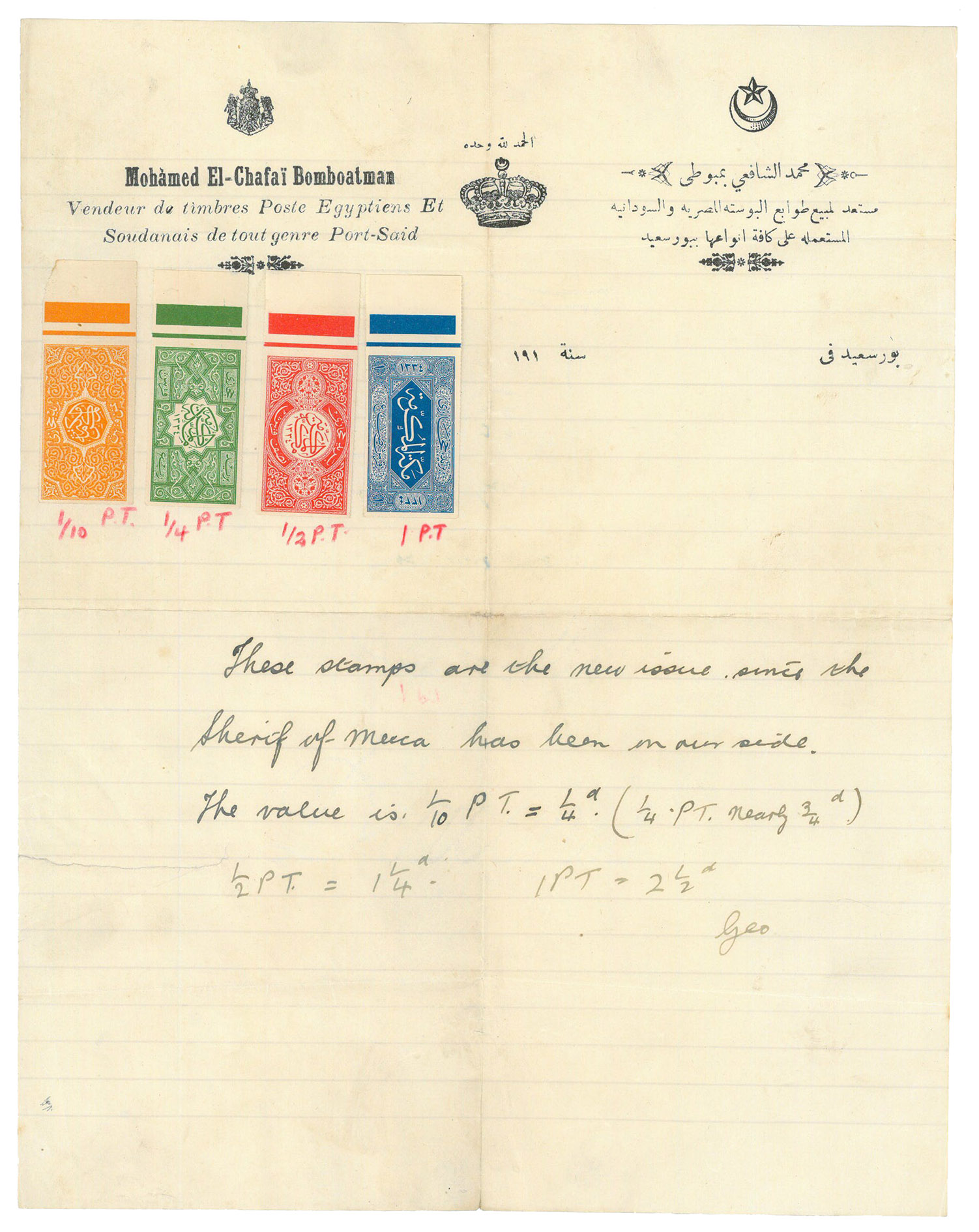 [1916 CE =] 1334 H. Folio (21.5 x 27.5 cm). With the letterhead of Mohamed El-Chafai Bomboatman, a stamp dealer in Port Said. Four stamps pasted down, and handwritten signed note. 1 p.