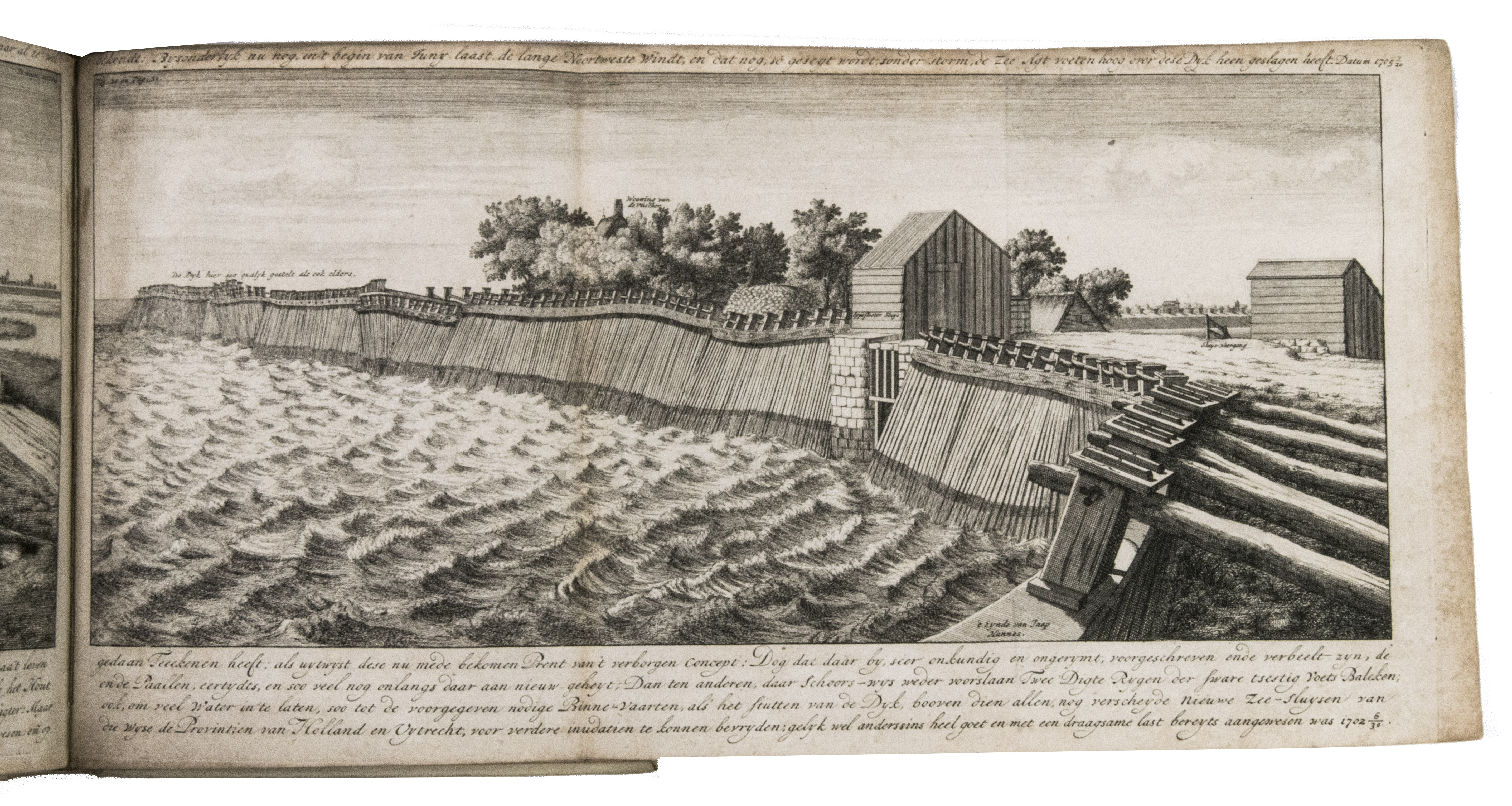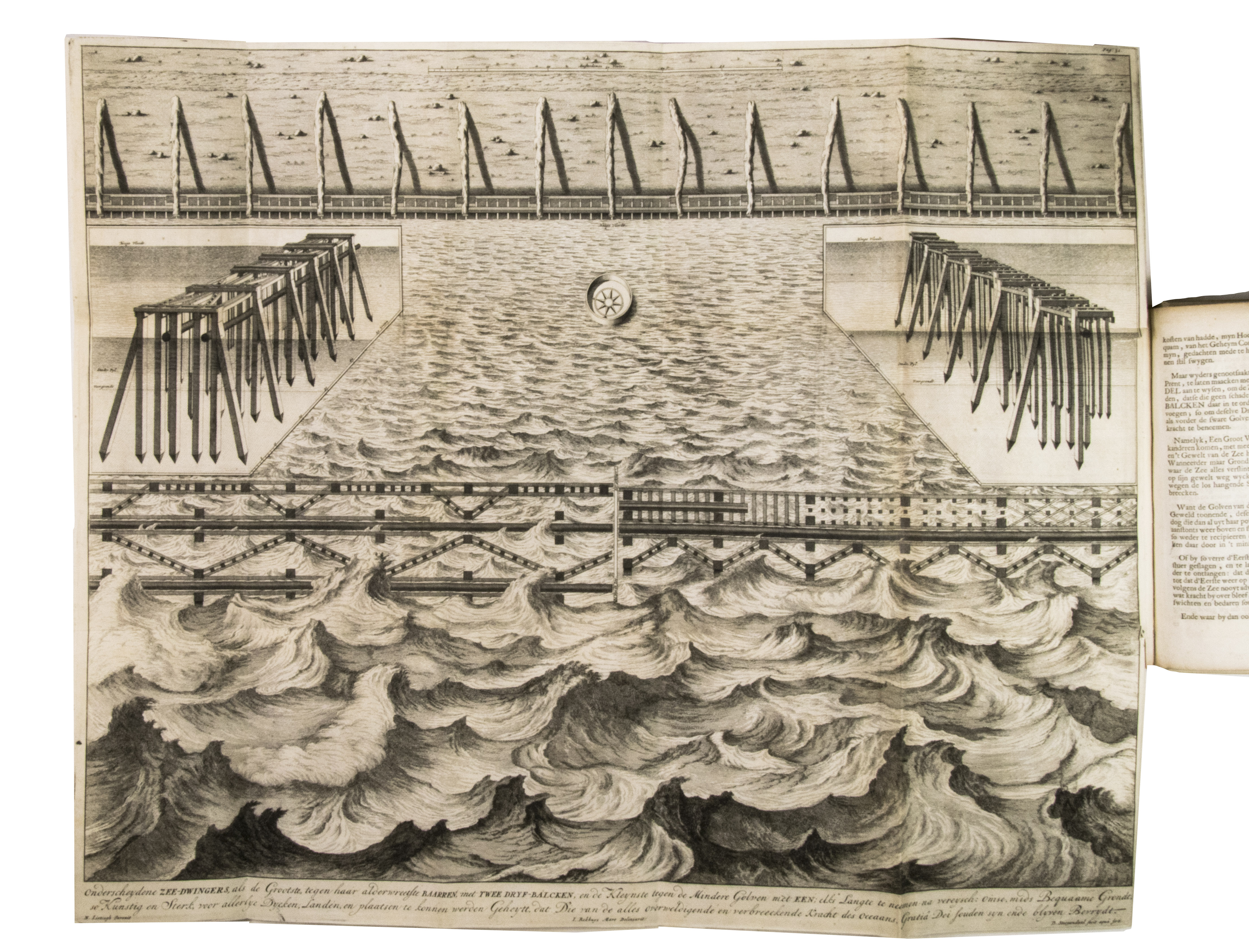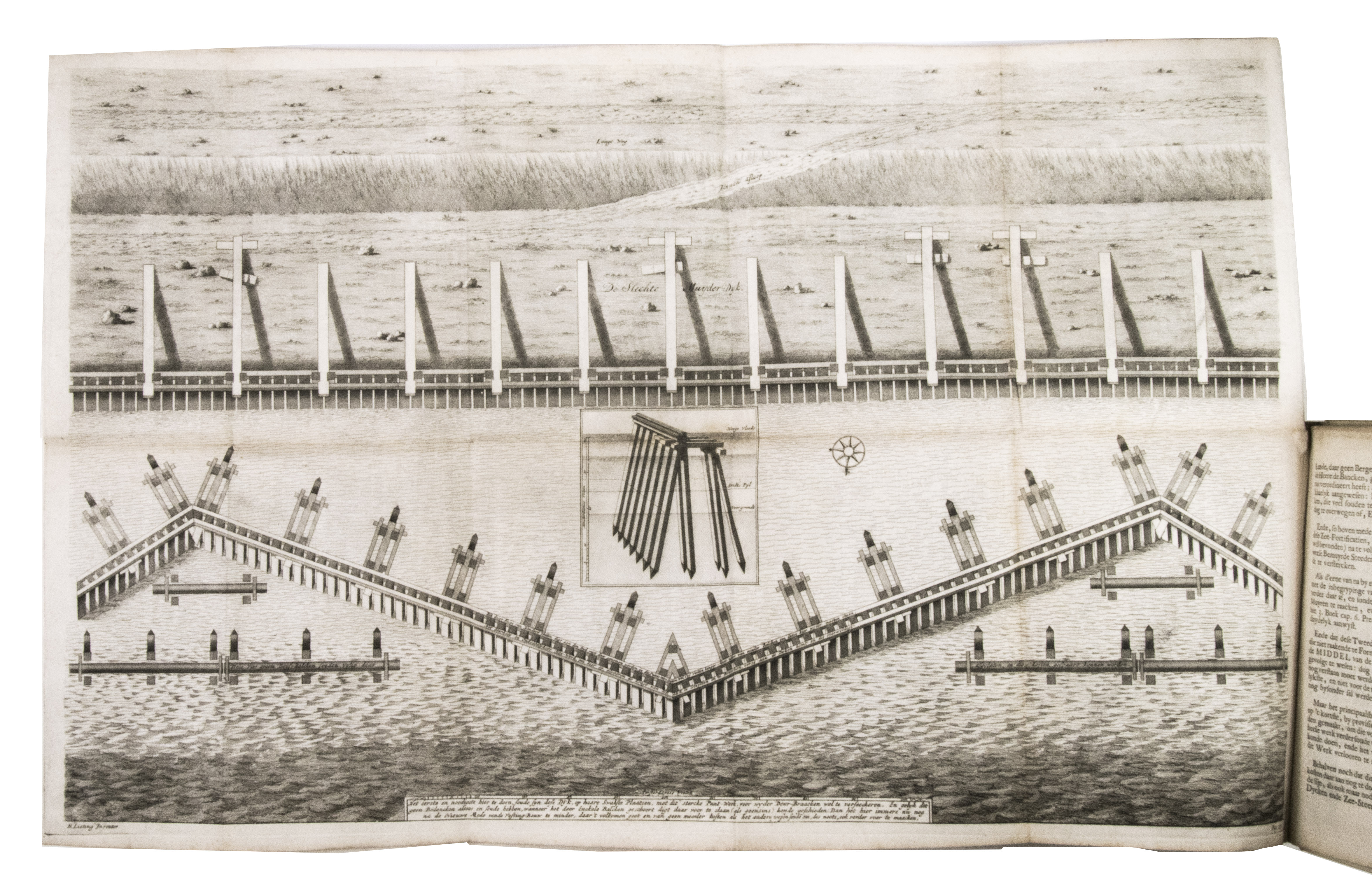 Listingh proposed the construction of partitions that were placed in oblique angles. Each partition consisted of a row of piles driven into the ground. The oblique corners would break the battering of the waves and prevent erosion. In the second part, published a few years later, Listingh describes another device, a so-called "sea forcer," aimed to break the waves before they hit the dike. The work includes large folding engravings by Daniël Stoopendaal (1672-1726) after his own drawings of, according to Listingh, ideal sea-defences. Due to the cost and bureaucratic systems, however, his ideas never became reality. Four different issues of the present work have been identified, which were all printed in the same year. The present issue, however, is the only one to include the appendices and a letter by Listingh on dyke construction.