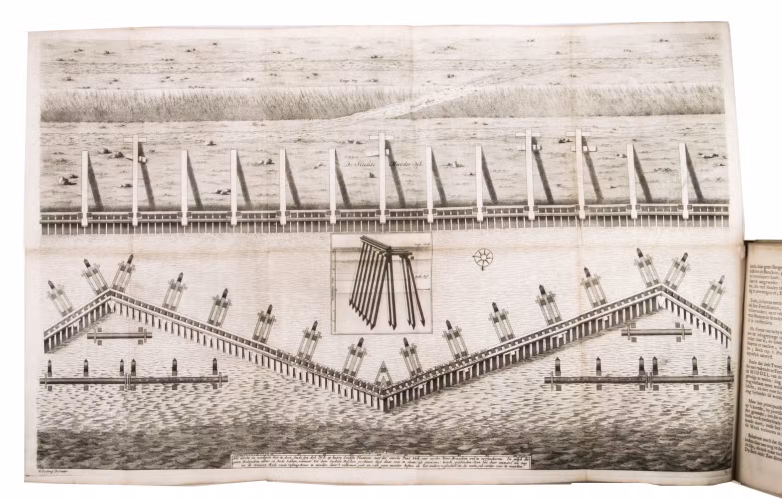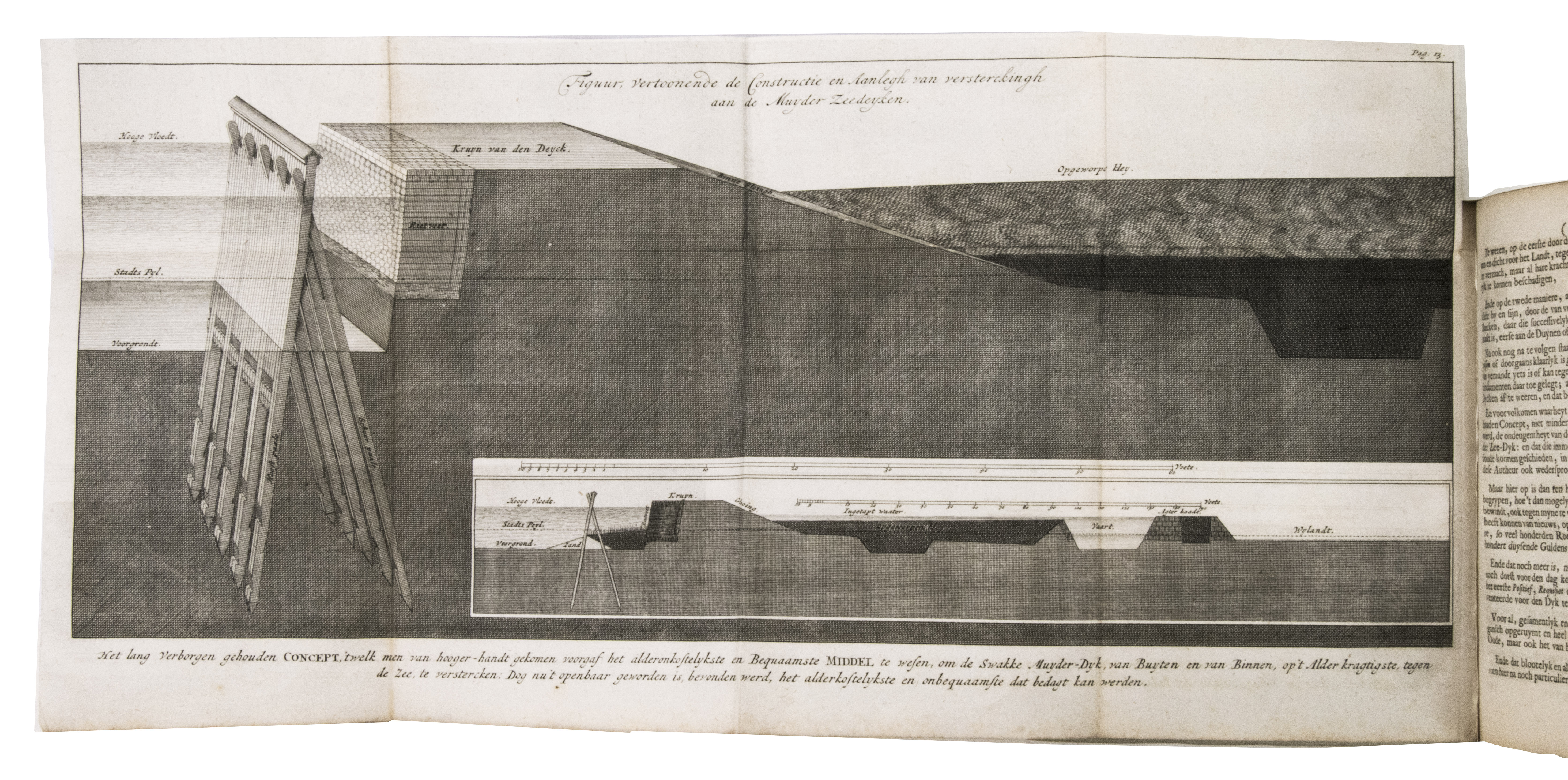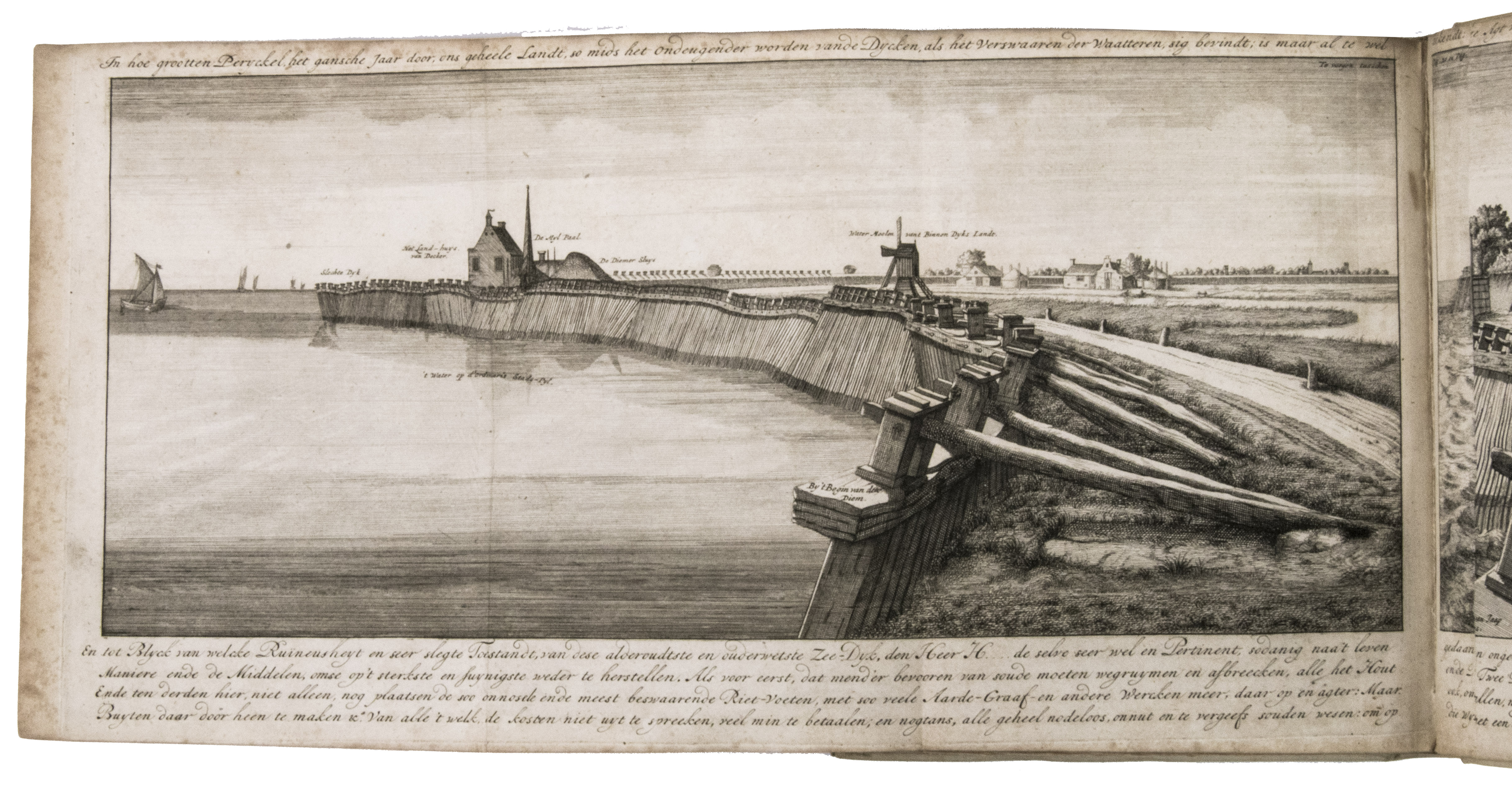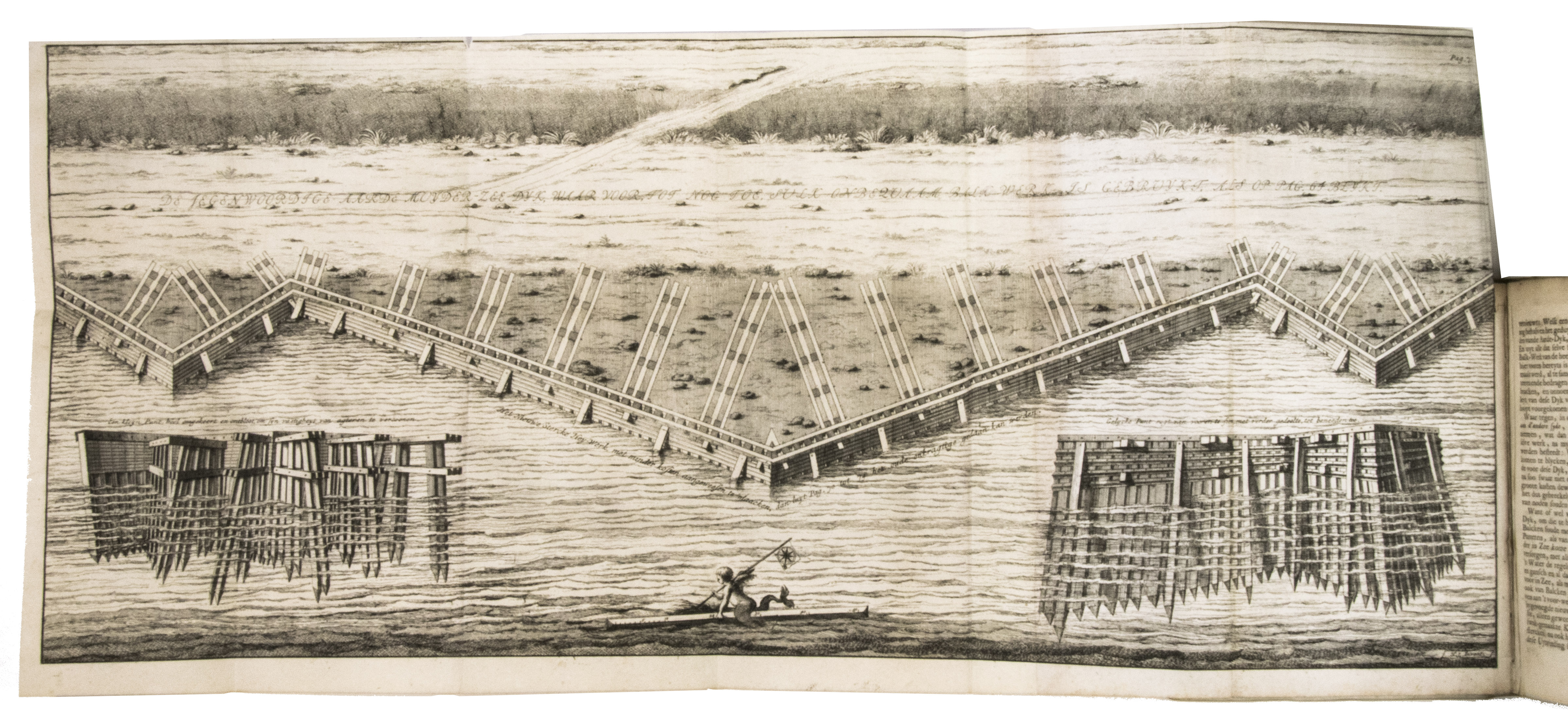 Listingh proposed the construction of partitions that were placed in oblique angles. Each partition consisted of a row of piles driven into the ground. The oblique corners would break the battering of the waves and prevent erosion. In the second part, published a few years later, Listingh describes another device, a so-called "sea forcer," aimed to break the waves before they hit the dike. The work includes large folding engravings by Daniël Stoopendaal (1672-1726) after his own drawings of, according to Listingh, ideal sea-defences. Due to the cost and bureaucratic systems, however, his ideas never became reality. Four different issues of the present work have been identified, which were all printed in the same year. The present issue, however, is the only one to include the appendices and a letter by Listingh on dyke construction.